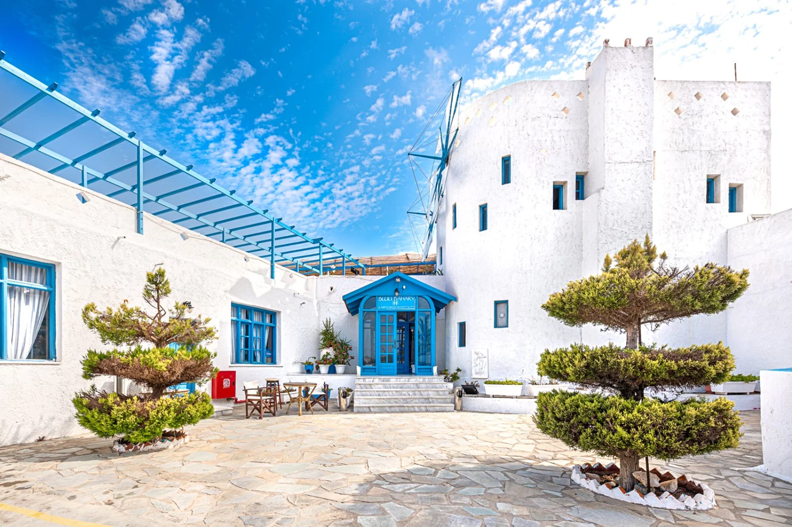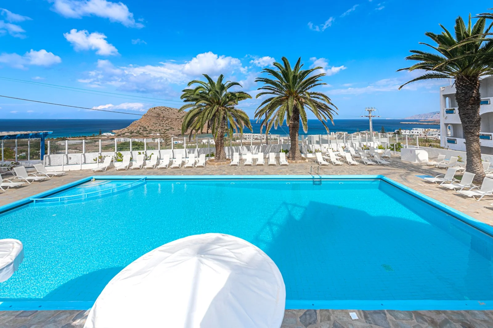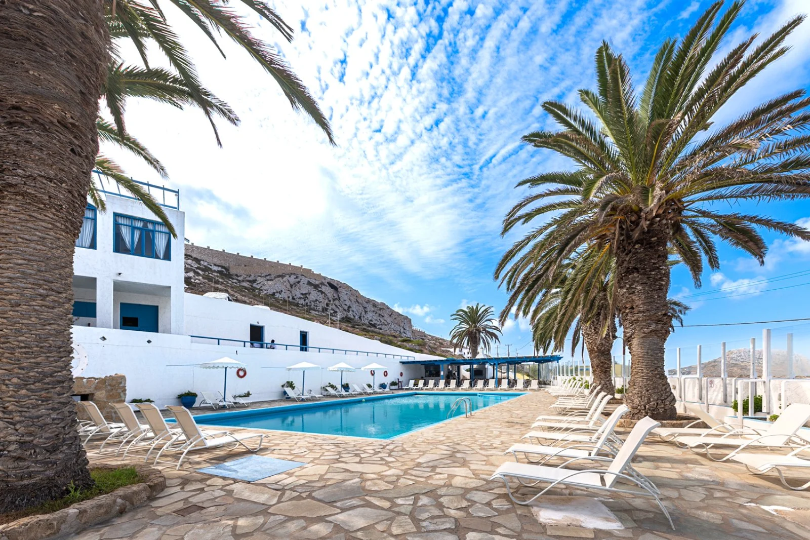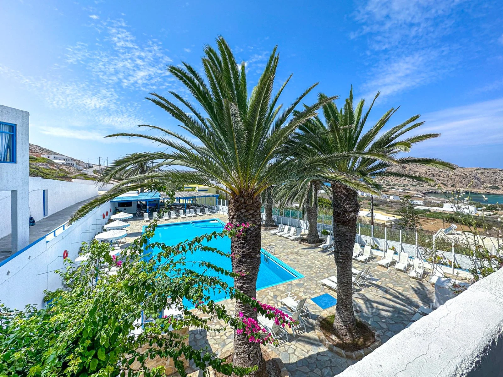 Semplice ed essenziale nelle sue linee, la struttura è tipicamente greca, con i suoi colori bianchi ed azzurri; in alcune parti riproduce gli antichi mulini con le sue vele; un servizio navetta permette di raggiungere la spiaggia agevolmente e una fermata del bus permette di spostarsi sull’isola. Inutile dire che con un noleggio auto o scooter è un ottimo punto di partenza per esplorare questa bellissima isola, che offre tipologie di paesaggio veramente inaspettate. Il centro dell’isola è tipicamente montano, come se ci trovassimo in tutt’altro posto, da cui si scorgono le bellissime baie e calette dai colori cristallini. Per gli amanti della cultura, a solo 1 km dall’hotel si trova il paese di Arkasa con il suo museo folkloristico, mentre a 3 km Finiki, il caratteristico villaggio dei pescatori.