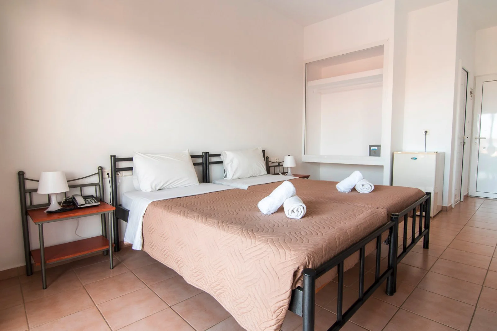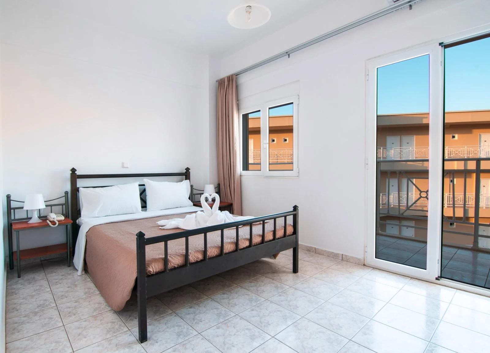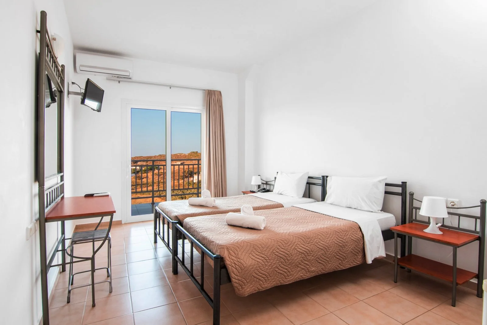 91 camere (21 m2) distribuite in 2 edifici di 3 piani, con servizi privati, asciugacapelli (su richiesta in reception), aria condizionata, minifrigo, TV satellitare, connessione Wi-Fi e balcone. A pagamento, cassetta di sicurezza. Sono disponibili, con supplemento, camere family (40 m2) che possono ospitare fino a 4 adulti e camere triple (26 m2) che possono ospitare fino a 3 persone.