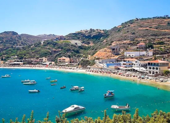 quella di Mononaftis, a 1,3 km, è di ciottoli così come quella di Psaromoura, mentre quella di Agia Pelagia, raggiungibile con navetta gratuita, è sabbiosa, tutte attrezzate con lettini e ombrelloni a pagamento (teli mare disponibili in hotel con pagamento di un deposito).