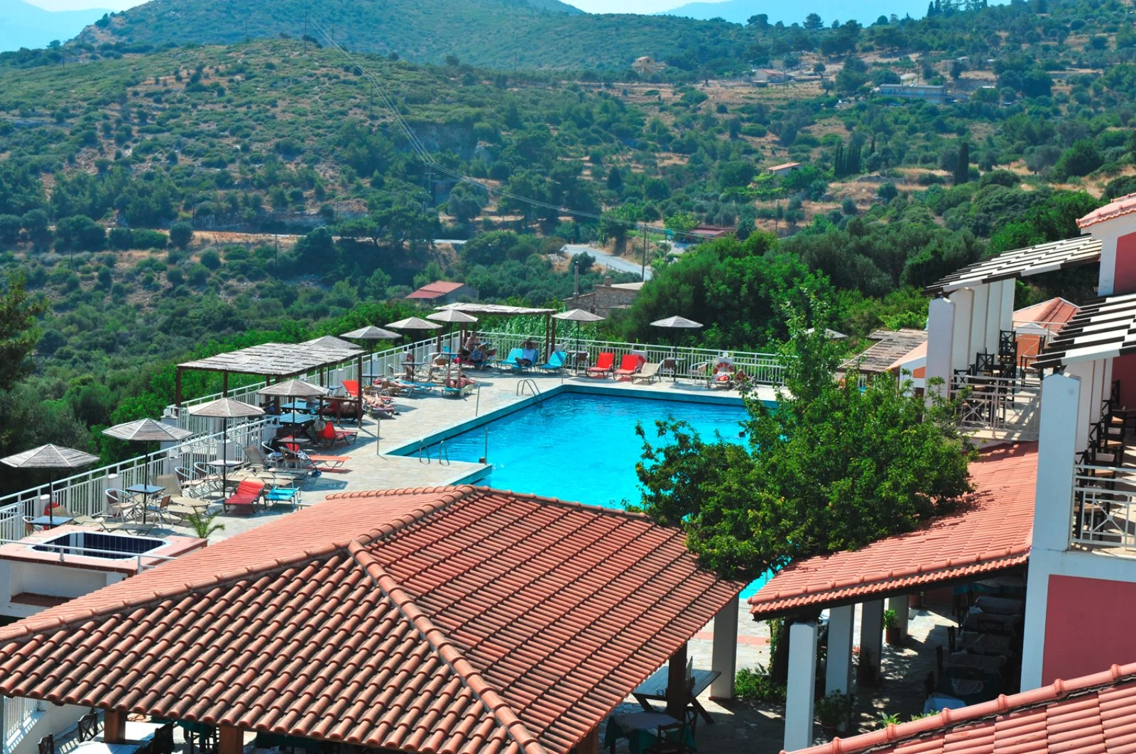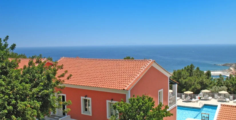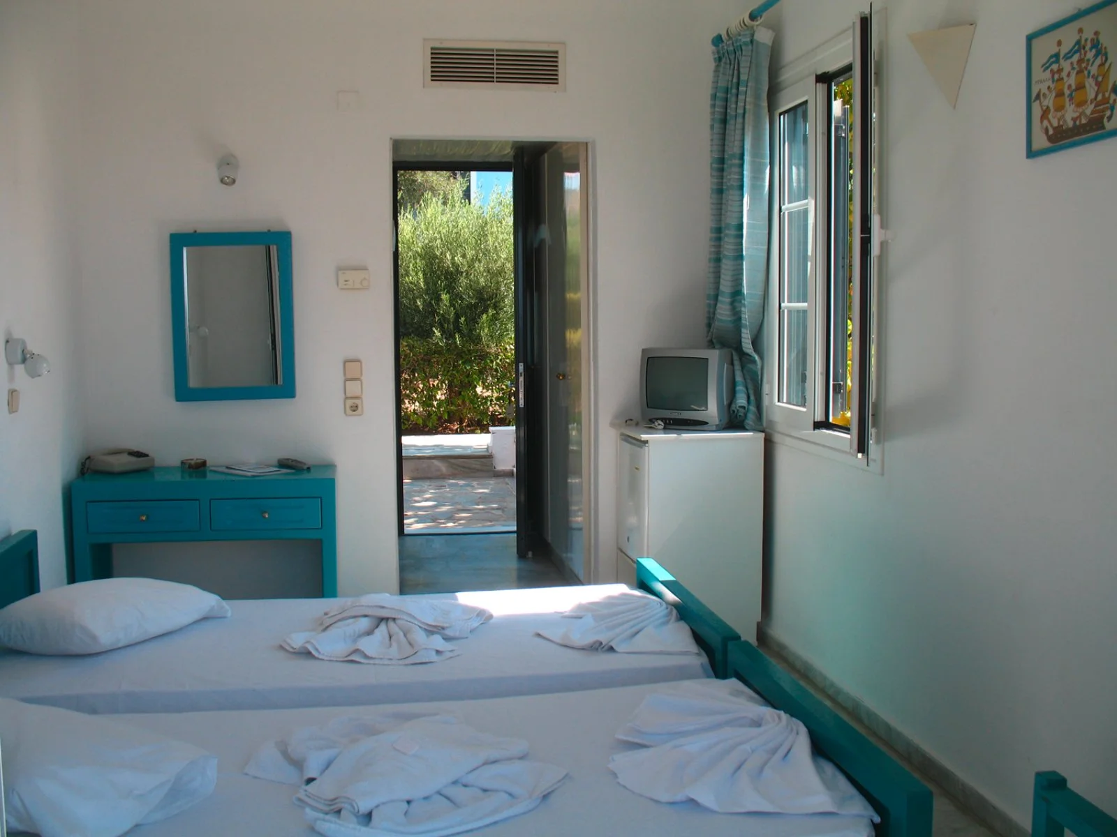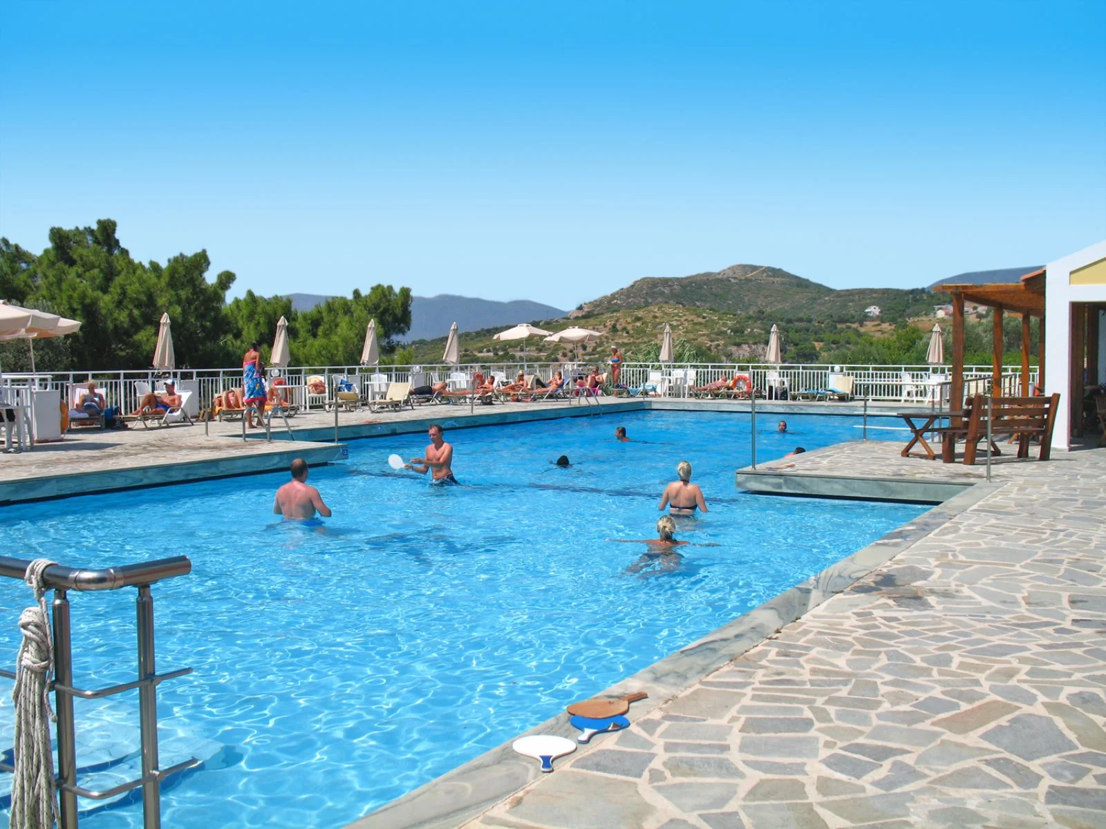 L'hotel Mykali è costruito con gusto e stile tradizionale, con camere non ampissime ma funzionali e dislocate in tante colorate palazzine. La relativa distanza dalla spiaggia (la baietta più vicina è a 800 m) è compensata dalla grande piscina che gode di splendida vista panoramica sull’Egeo e sulla Turchia. La