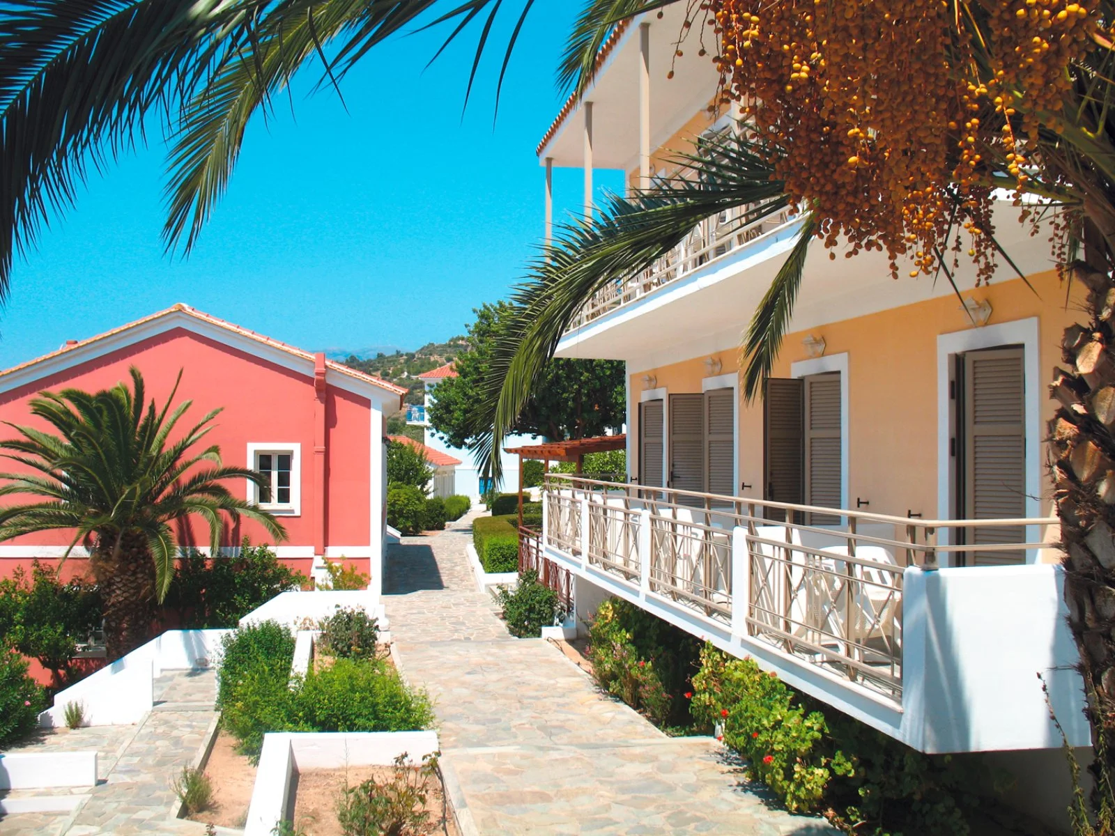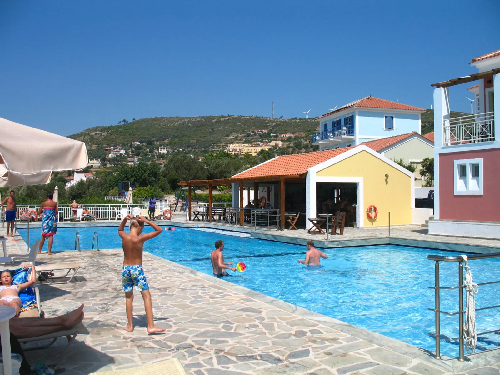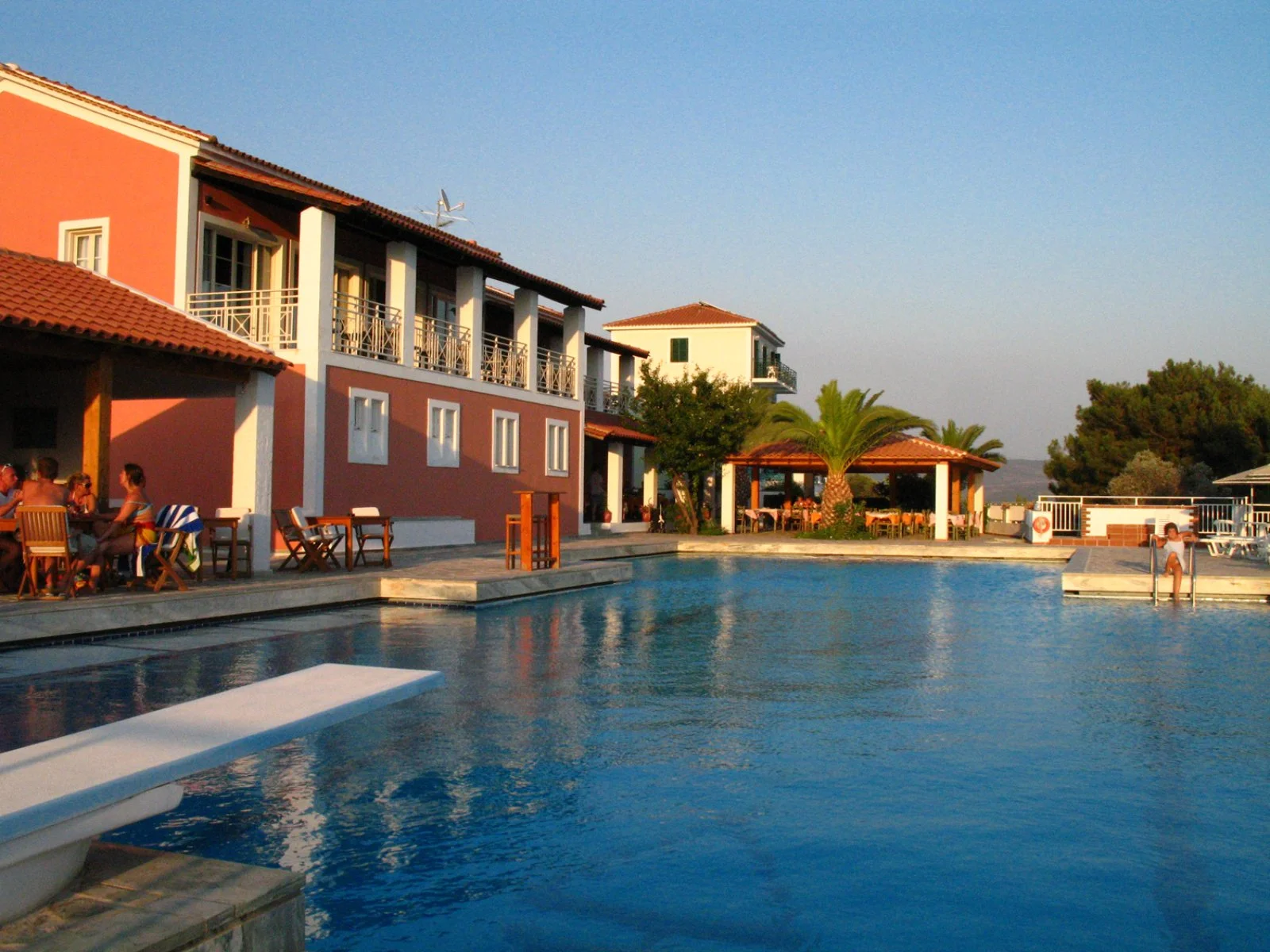 L'hotel Mykali è costruito con gusto e stile tradizionale, con camere non ampissime ma funzionali e dislocate in tante colorate palazzine. La relativa distanza dalla spiaggia (la baietta più vicina è a 800 m) è compensata dalla grande piscina che gode di splendida vista panoramica sull’Egeo e sulla Turchia. La
