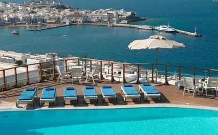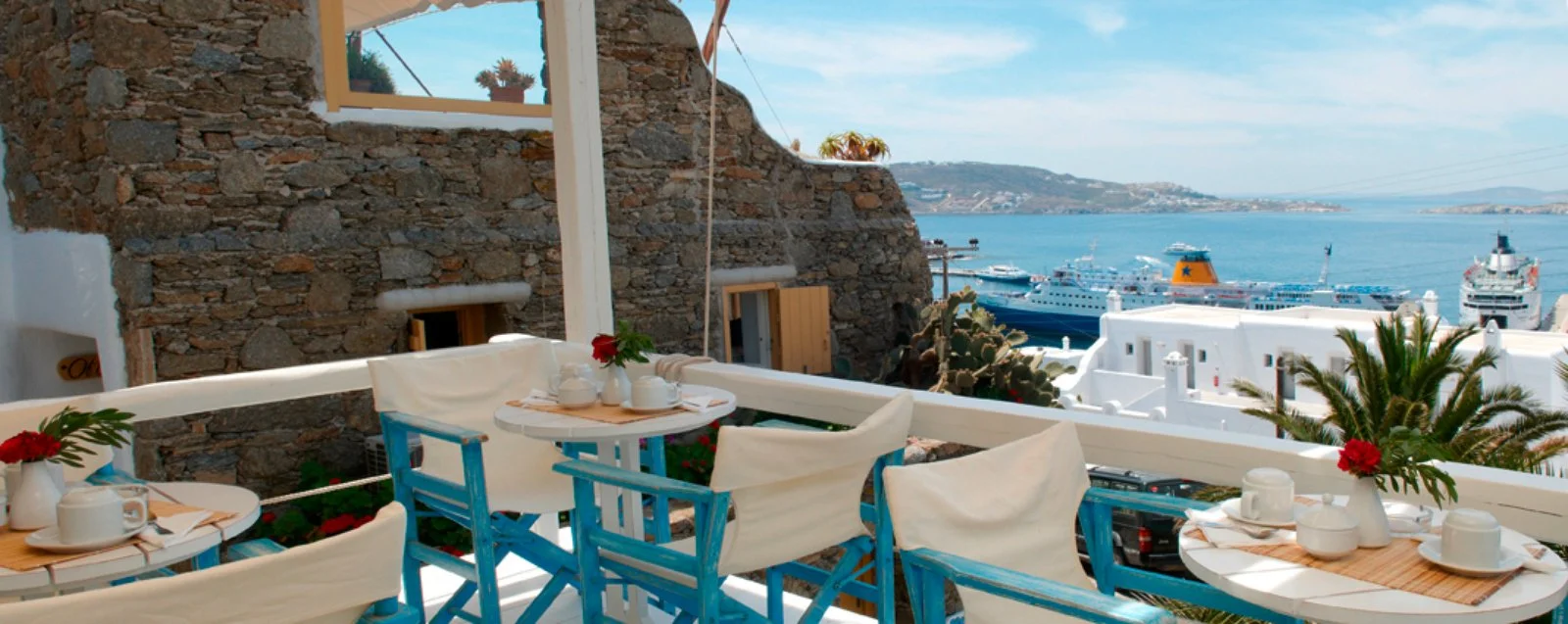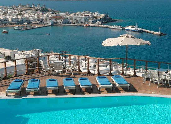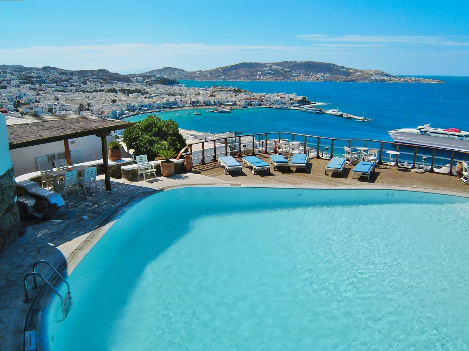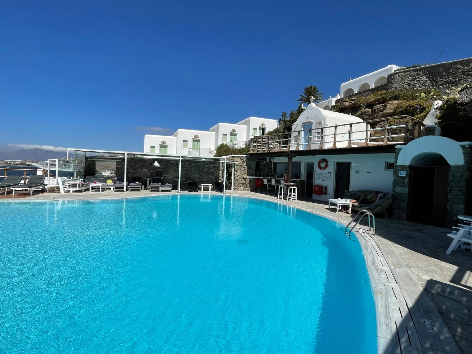 in posizione panoramica sulla collina, a soli 500 m dalla città di Mykonos (raggiungibile a piedi in pochi minuti) e 4 km dall'aeroporto.