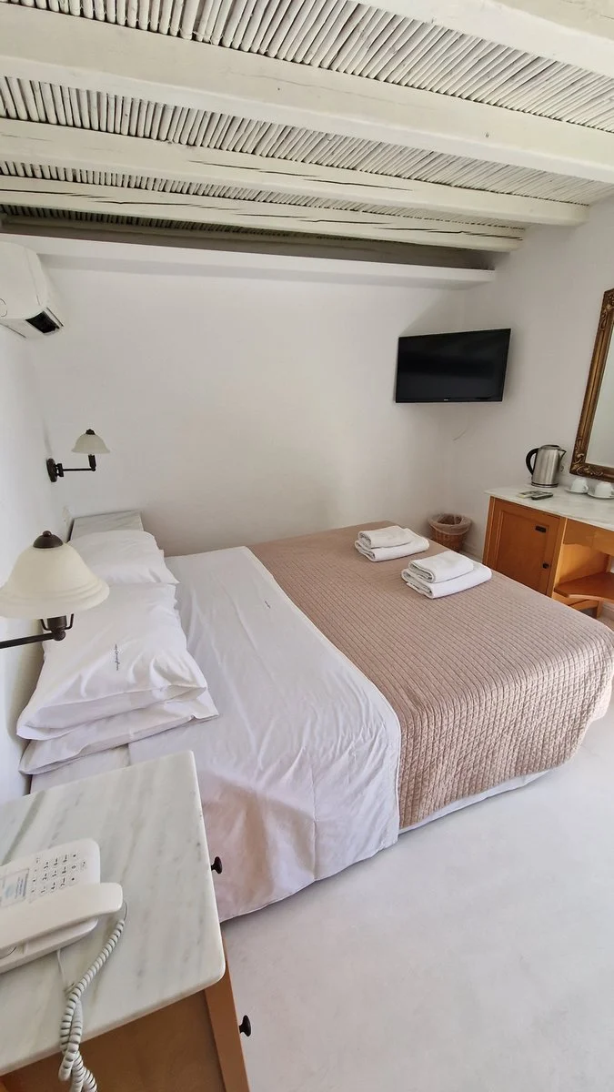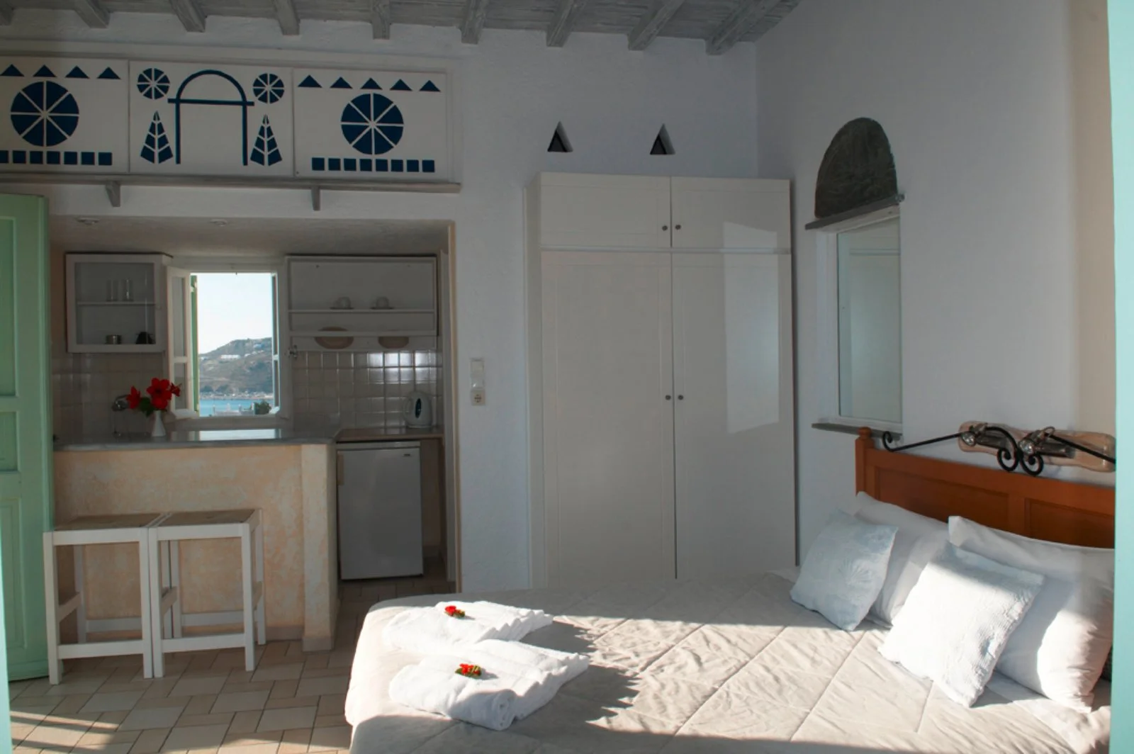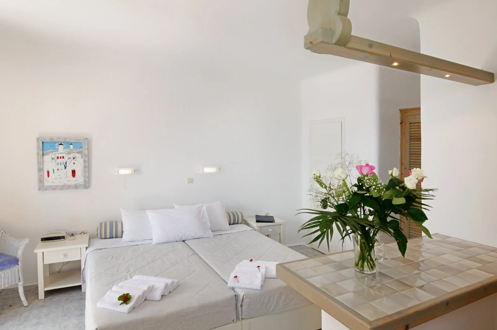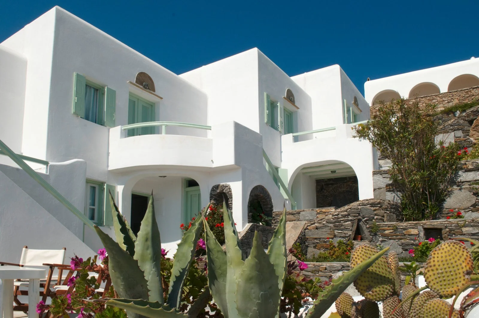 meravigliosa vista sulla suggestiva Chora di Mykonos. Molto curato nei dettagli e raccolto si compone di caratteristici piccoli edifici in stile cicladico, ubicati su diversi livelli e collegati tra loro da un gioco di scale che permette di raggiungere velocemente tutte le zone della struttura. Le aree comuni propongono diversi punti panoramici da dove godere al meglio della sua posizione, infatti è ben apprezzato dalla clientela proprio per questo e per essere l’ideale punto di partenza sia per vivere facilmente l’animata città e sia per andare alla scoperta dell’isola e delle sue numerose belle spiagge. Eden consiglia poi di approfittare del vantaggioso noleggio auto o scooter per vivervi l'isola in piena libertà.