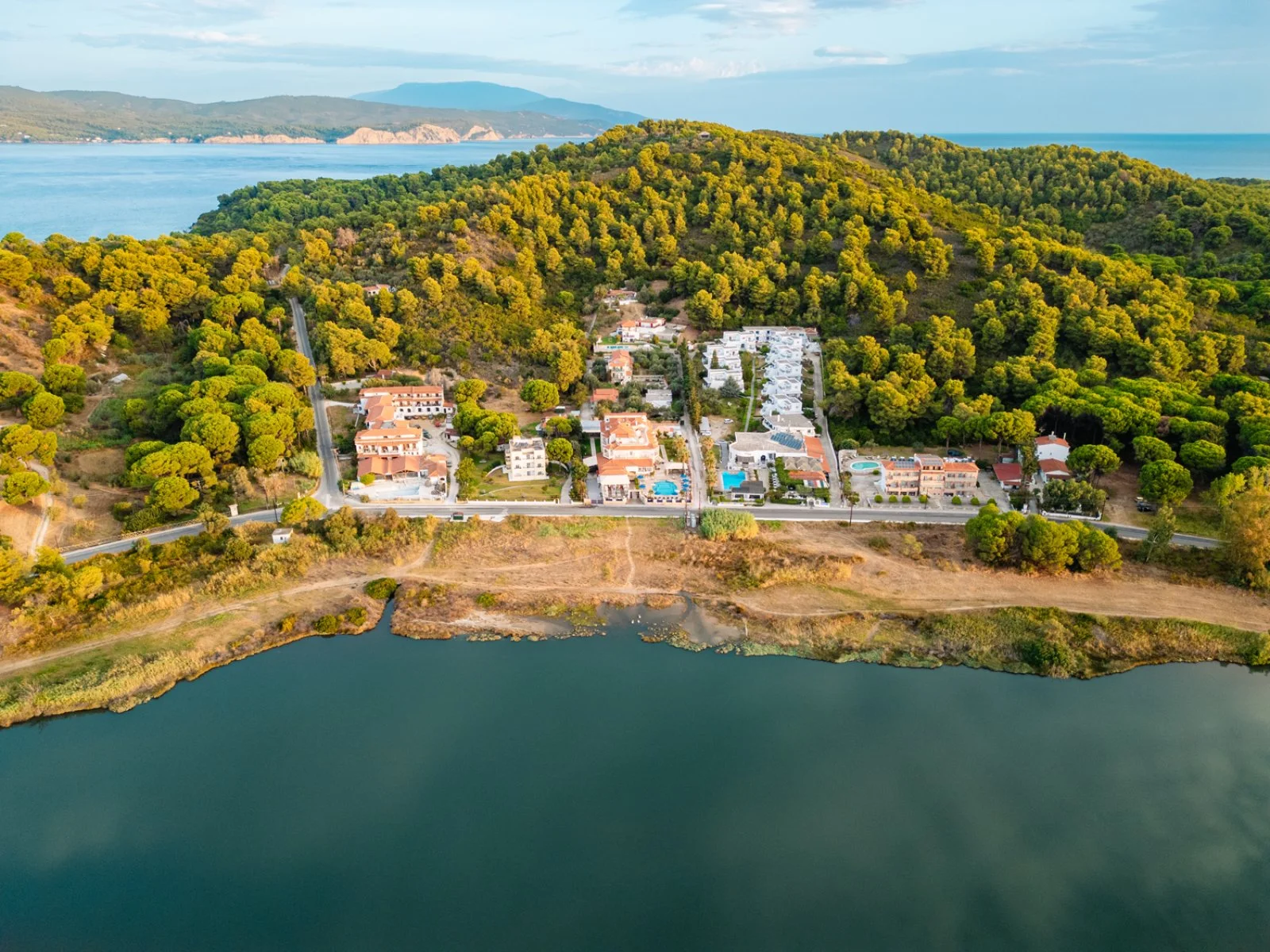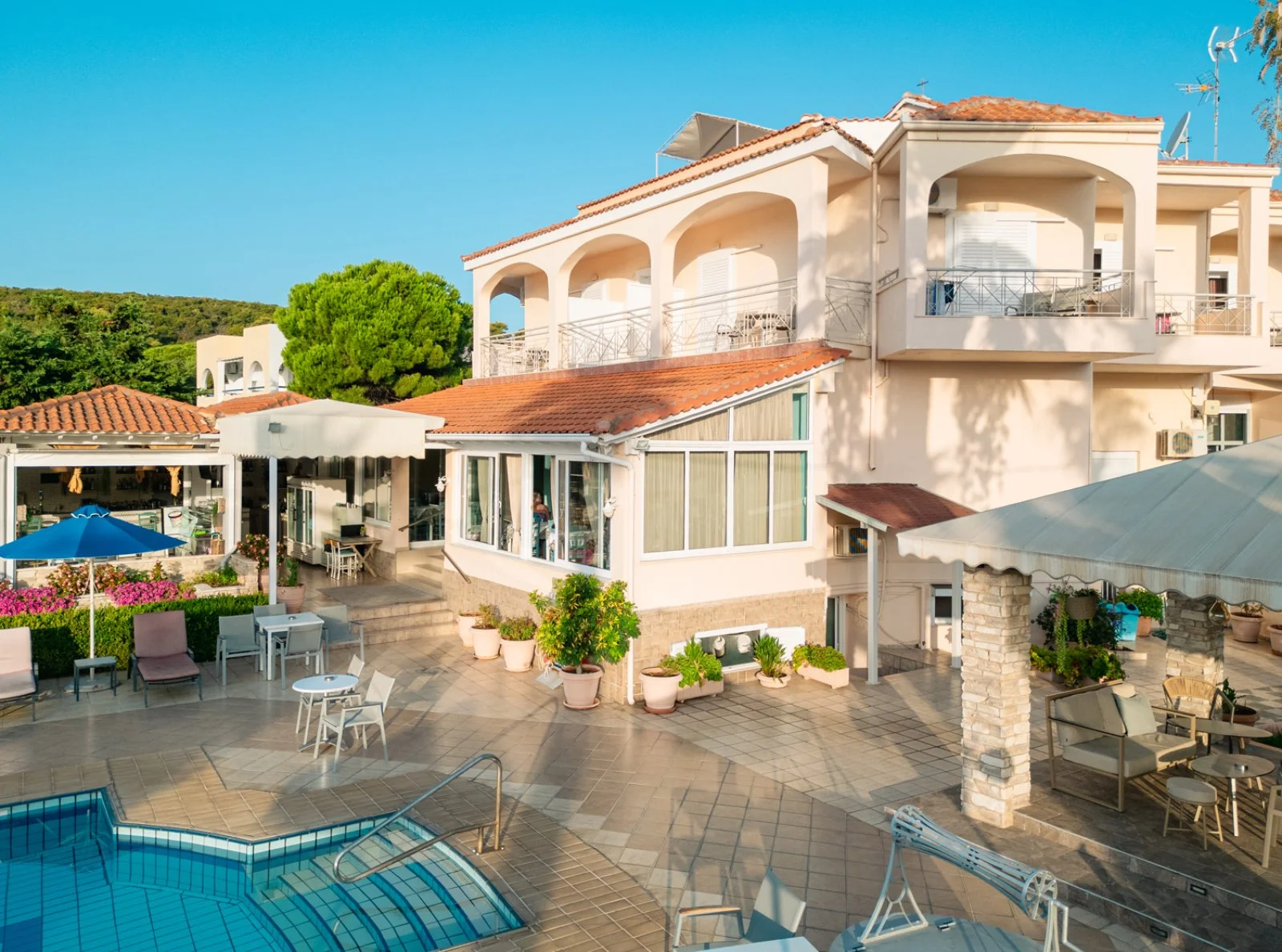 Koukounaries, a 700 m dalla spiaggia, 13 km da Skiathos città e dal porto e 14 dall’aeroporto. Fermata bus di fronte all’hotel con passaggi frequenti per Skiathos città.
