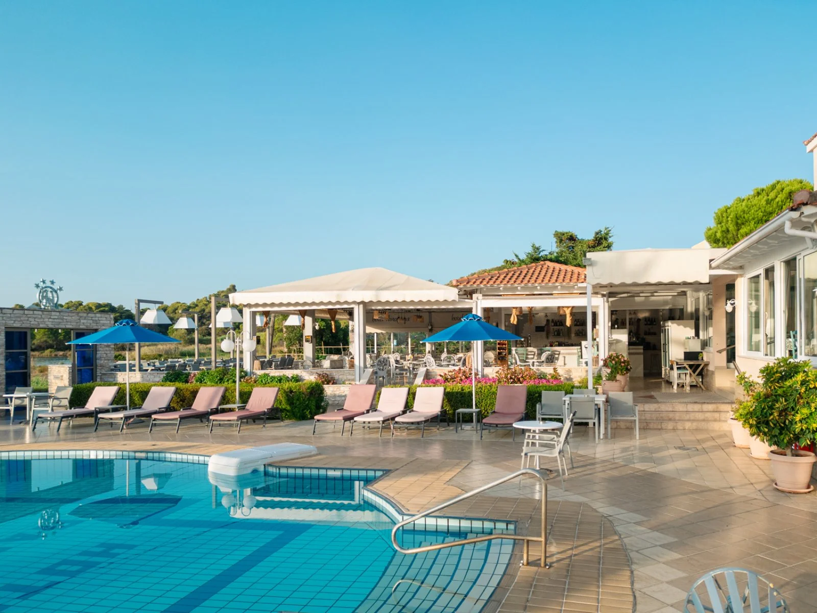 cura ai dettagli, molto evidente tanto nelle parti comuni quanto all’interno delle camere, ciascuna con arredamento diverso dalle altre, ma tutte con colori vivaci e grande gusto. Anche la zona piscina, elegante e tranquilla, è un piacevole rifugio in cui sdraiarvi al sole per godervi il bel panorama sul lago Strofilia. L’altro grande punto di forza della struttura, è la spiaggia di Koukounaries, tra le più belle del Mediterraneo, dove troverete, oltre al mare dai colori straordinari, una bella taverna ed un centro di sport acquatici. Da non perdere sono anche le tantissime altre spiagge a pochi minuti da Koukounaries, come le meno conosciute Banana Beach, da raggiungere percorrendo l’ultimo tratto a piedi tra gradevoli pinete, Small Banana, frequentata prevalentemente da nudisti, e Aghia Eleni, famosa per l’acqua cristallina. Ai più dinamici Eden segnala che proprio di fronte all’hotel si trova una fermata dell’autobus, con comode connessioni alle spiagge e alla nottambula Skiathos Town.