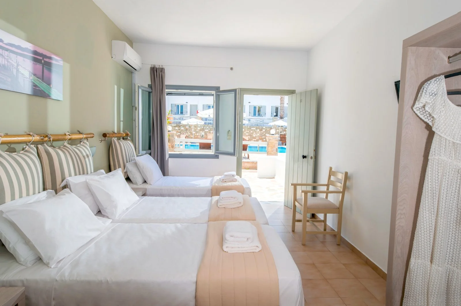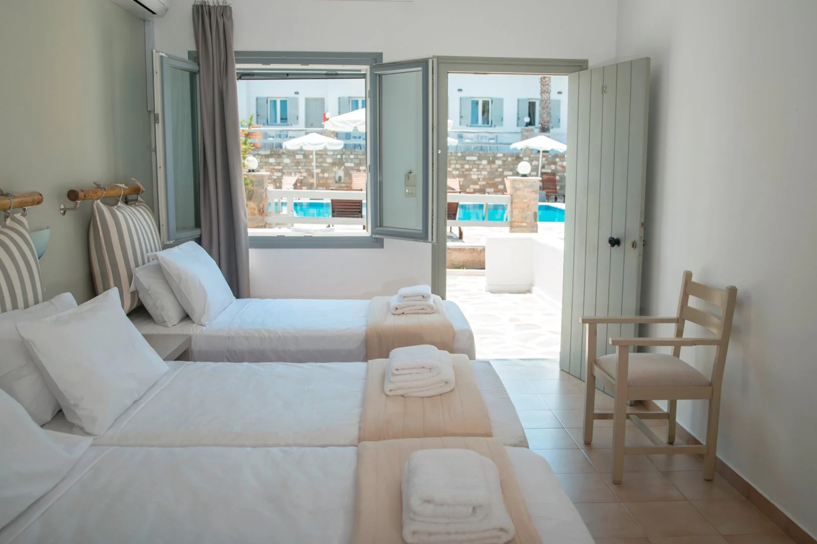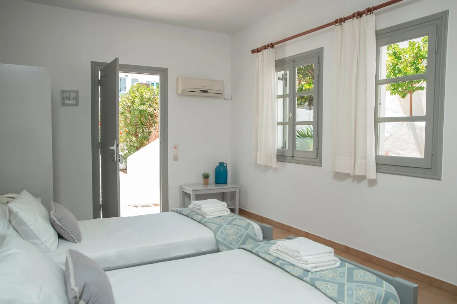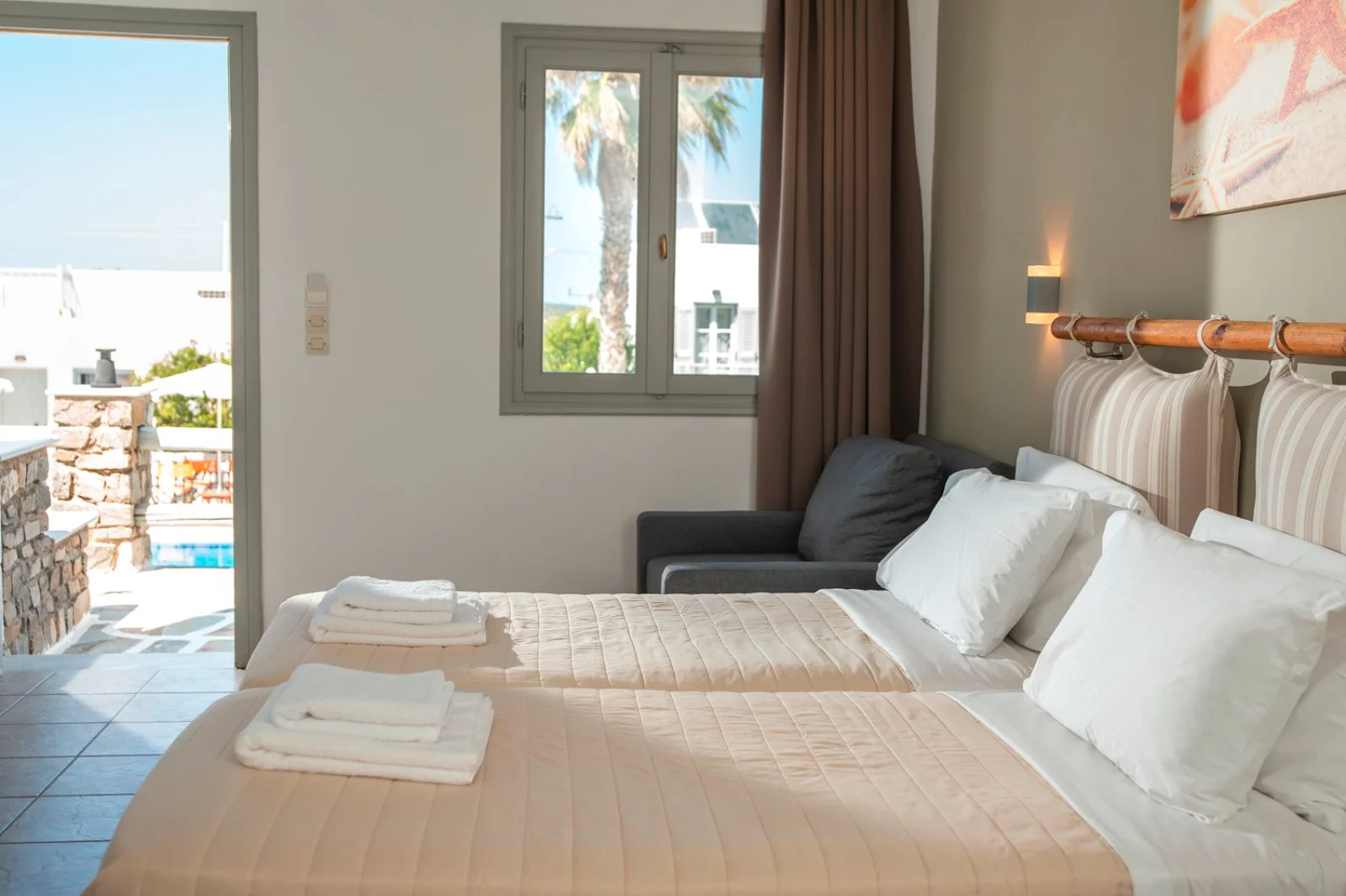 35 camere disposte su 2 piani (18 m2) con servizi privati, asciugacapelli, TV satellitare, minifrigo, aria condizionata, cassetta di sicurezza, set per la preparazione di tè e caffè, connessione Wi-Fi gratuita e terrazza o balcone. Sono disponibili, con supplemento, camere superior vista piscina (22 m2).