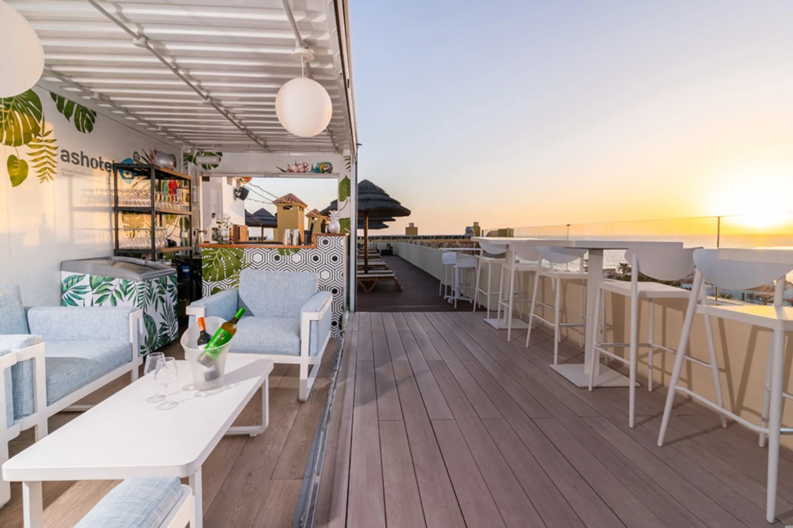 spiaggia libera di sabbia scura e ciottoli a fianco all’hotel, Playa de la Enramada. A 1200 m Playa del Duque, di sabbia fine e dorata, con lettini e ombrelloni a pagamento (teli mare disponibili in hotel con deposito).