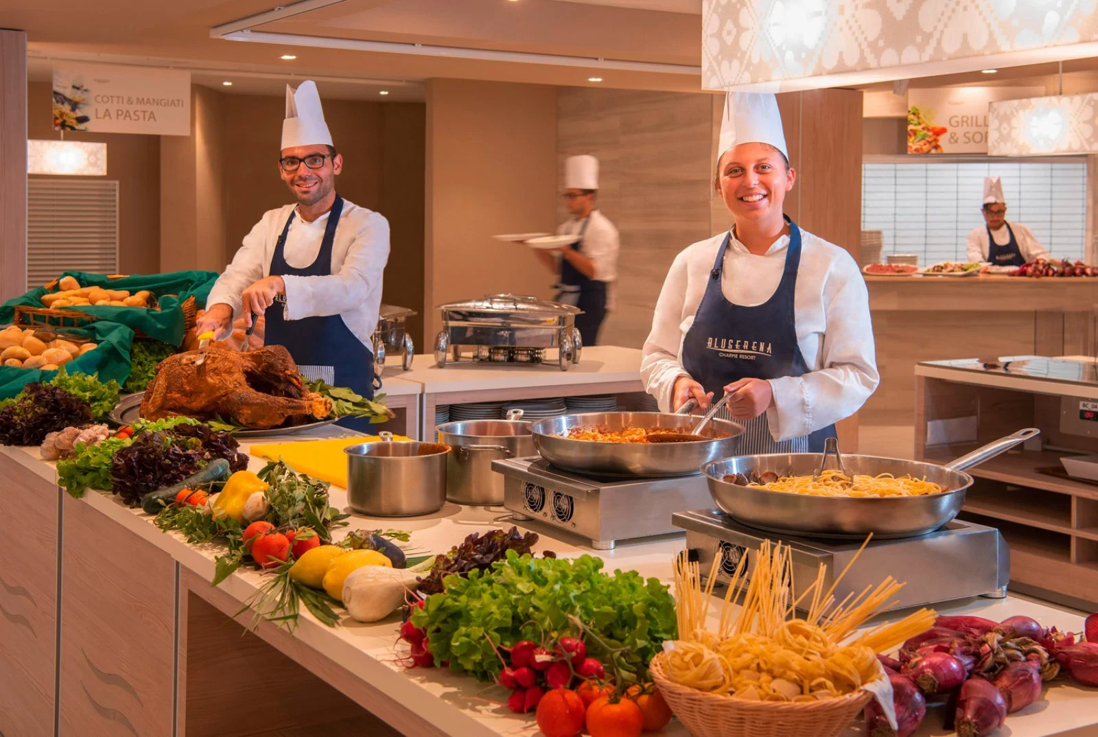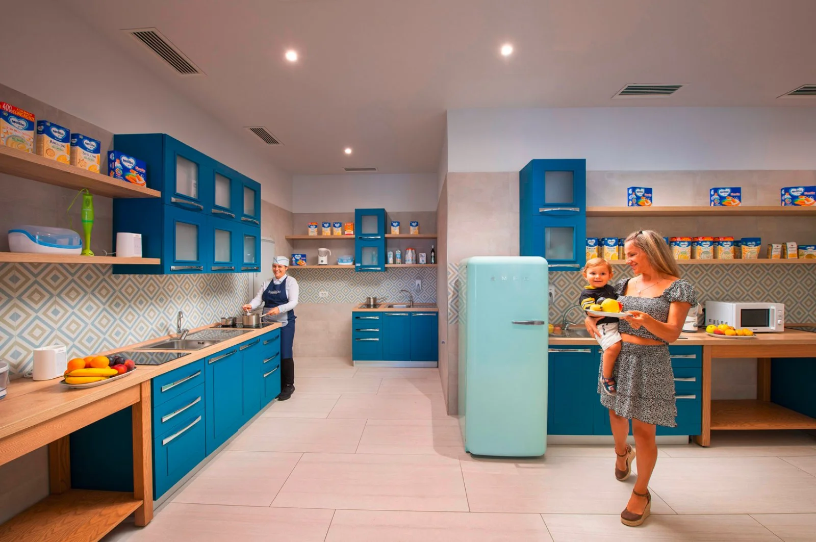 Baby Kitchen. Dedicata ai genitori (con tavoli, sedie e seggioloni) per le pappe dei bimbi 0-3 anni, con assistenza e disponibilità di prodotti base durante gli orari dei pasti principali: brodi vegetali e di carne, passato di verdure, pastine, fettine di carne, filetti di pesce, prosciutto cotto, latticini, frutta fresca, latte fresco, latte di soia, latte di riso, latte senza lattosio, yogurt, marmellatine, tè e camomilla, biscotti. Non disponibili omogeneizzati, formaggini e latte per la prima infanzia sia liquido che in polvere. Sarà possibile inoltre riscaldare latte e omogeneizzati, sterilizzare, frullare, omogeneizzare. È accessibile dalle 6 a mezzanotte, durante gli orari di chiusura è possibile rivolgersi al ricevimento.