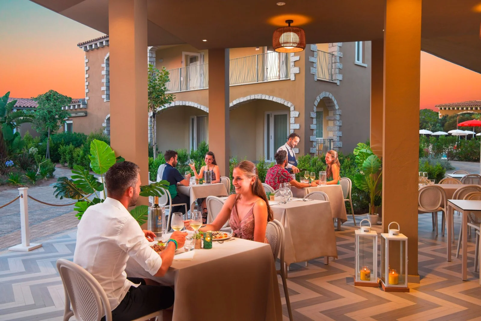 Ristorante centrale con sale climatizzate e un'area ombreggiata esterna, in giardino o terrazza, Il Patio (gratuito, su prenotazione), servizio a buffet e show cooking, ristorante tipico La Gaddura aperto dall'8/6 al 19/9 e ristorante Le Onde aperto dall'8/6 al 5/9, entrambi su prenotazione e con servizio al tavolo aperti almeno 6 giorni su 7 a pranzo o cena e su prenotazione il giorno precedente. L’assegnazione dei tavoli presso il ristorante centrale è prevista nelle sale interne, assegnati a famiglia per tutto il soggiorno (gratuito, non prevista la prenotazione); su prenotazione, salvo disponibilità, il tavolo nell'area esterna Il Patio del ristorante centrale, assegnato a famiglia per tutto il soggiorno (gratuito, su prenotazione); solo per gli ospiti in camera prestige dal 21/6 al 13/9, tavolo non assegnato nell'area del ristorante centrale riservata nella sala interna o nella zona esterna, secondo disponibilità, con servizio al tavolo a pranzo e a cena. 4 bar: in piazza, presso piscina centrale, in spiaggia, oltre al bar in area esclusiva riservata alle camere prestige o in formula ultra inclusive.