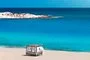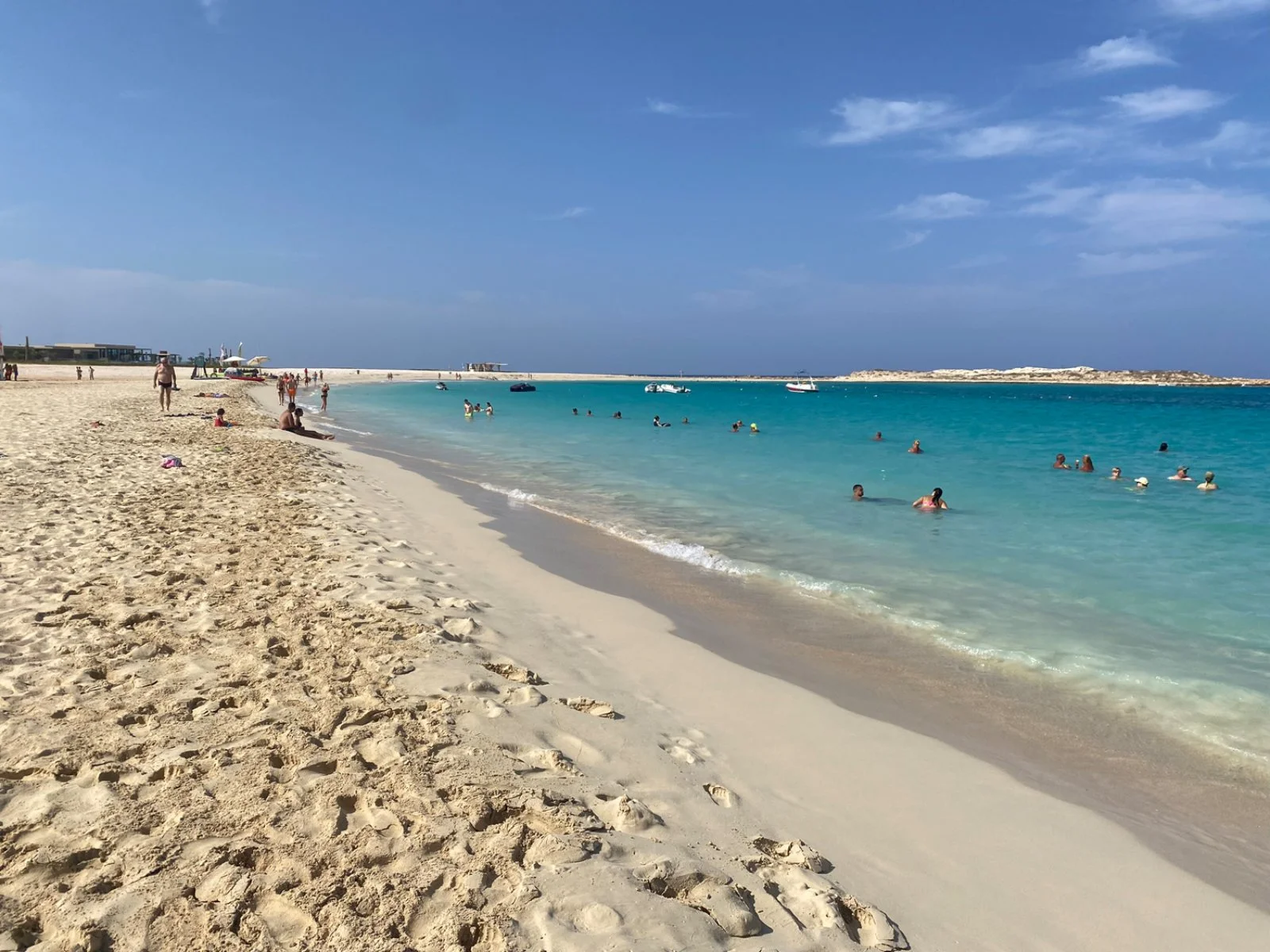 a circa 500m, ampia spiaggia di sabbia bianca e fine con area dedicata ai clienti di Almaza Blue, leggermente digradante, con ombrelloni, lettini e teli mare a disposizione.