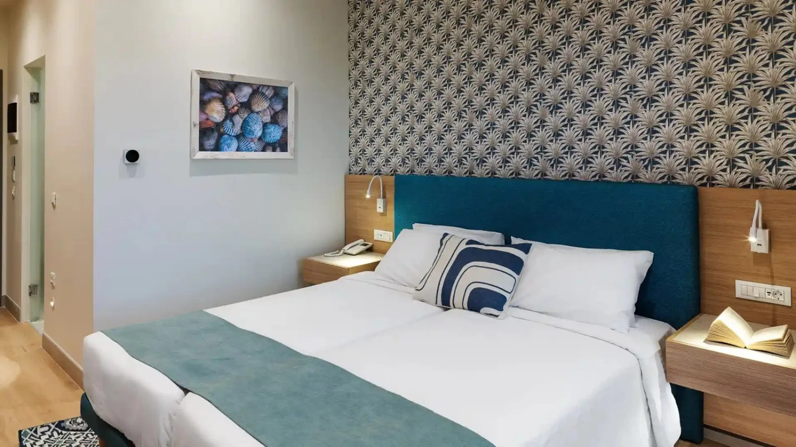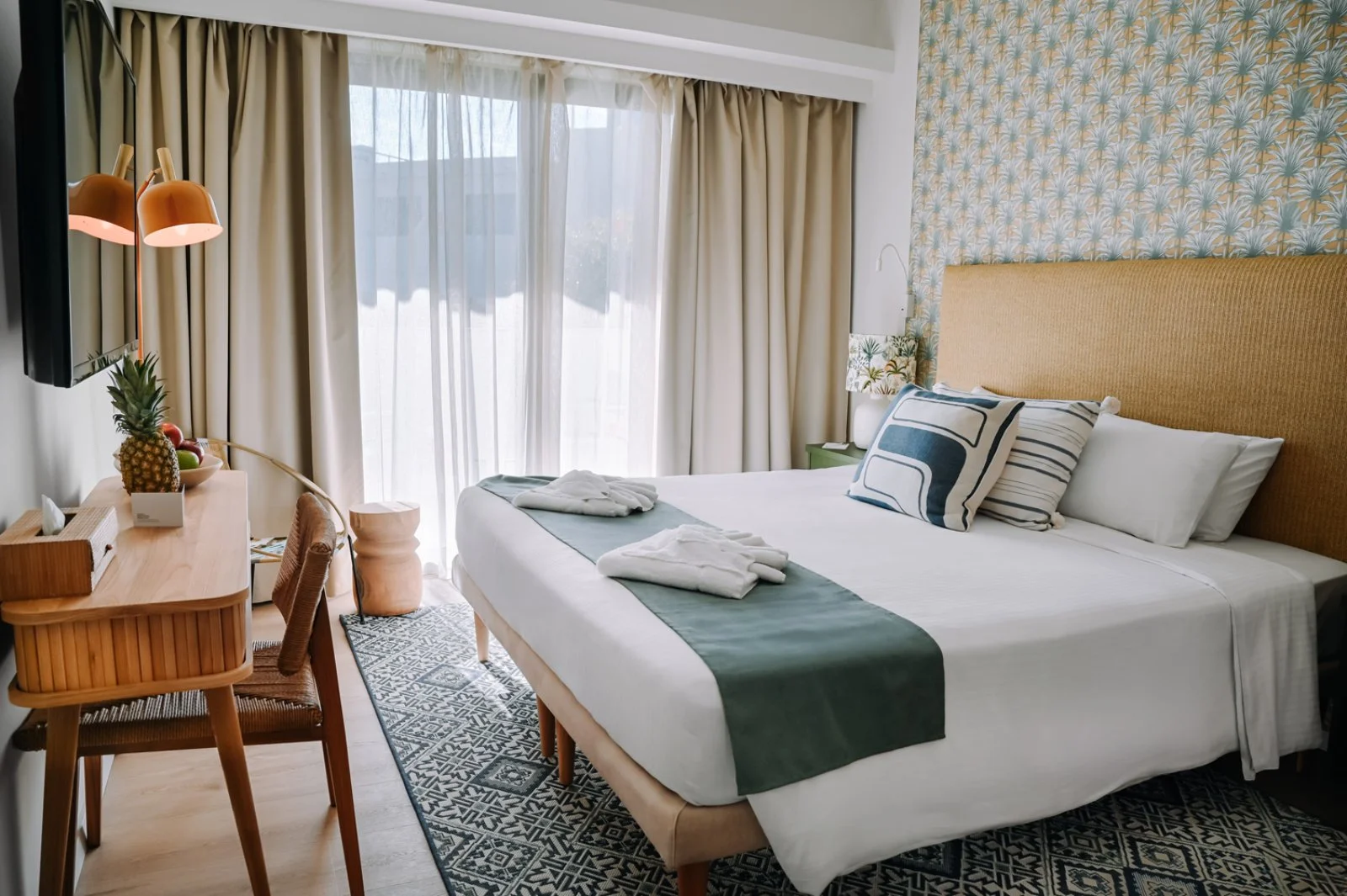 144 camere distribuite in due complessi, con servizi privati, asciugacapelli, aria condizionata, minifrigo (con rifornimento di acqua al giorno), smart TV satellitare, bollitore per caffè e tè, cassetta di sicurezza, Wi-Fi gratuito, accappatoi e ciabattine, balcone o terrazza. Sono disponibili con supplemento camere deluxe vista piscina, premium vista giardino e vista piscina, family deluxe.