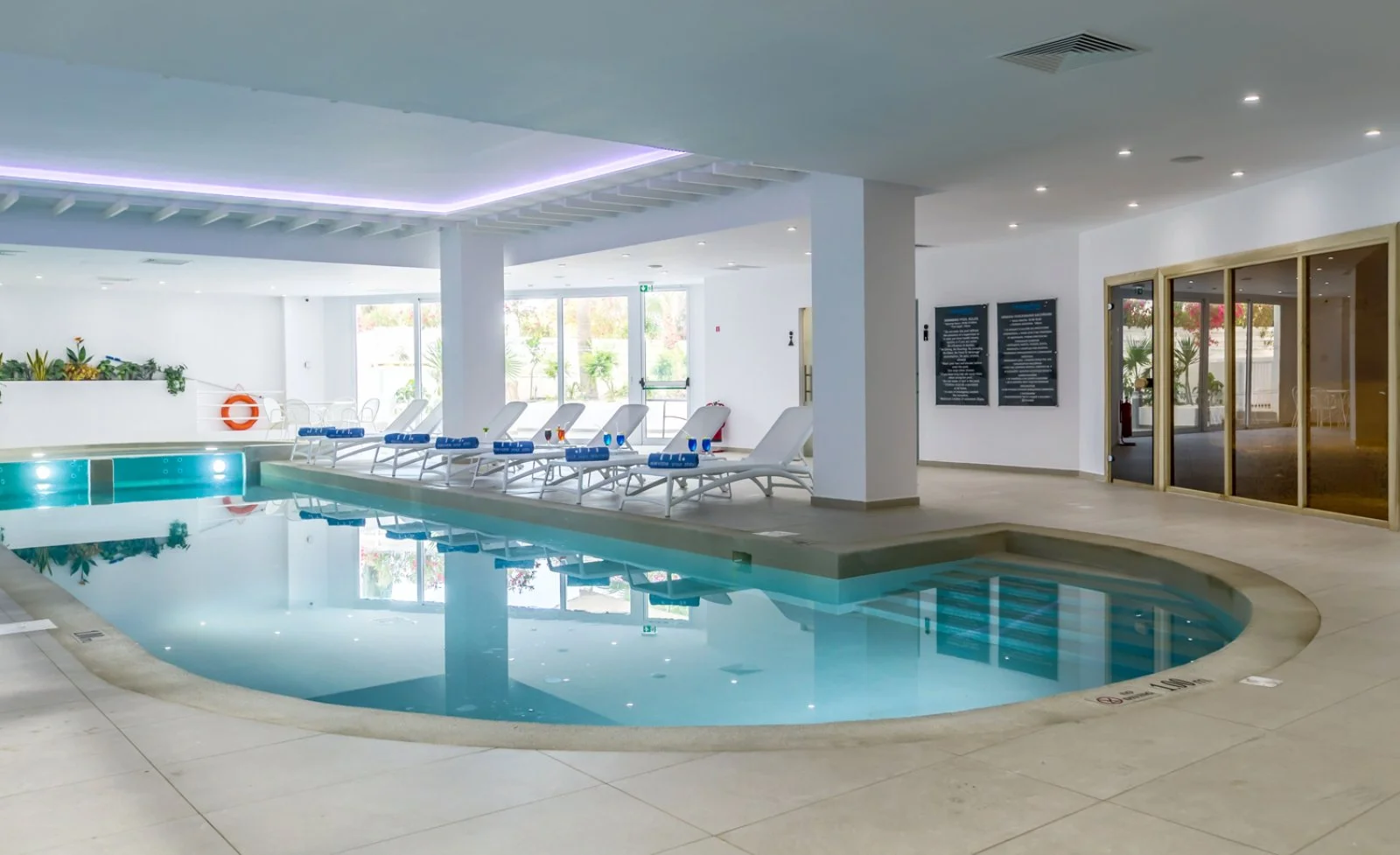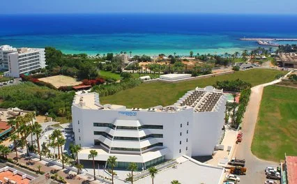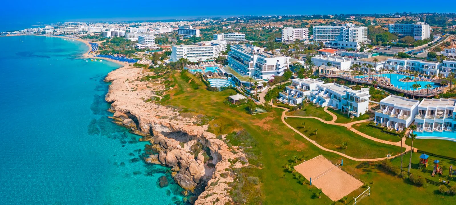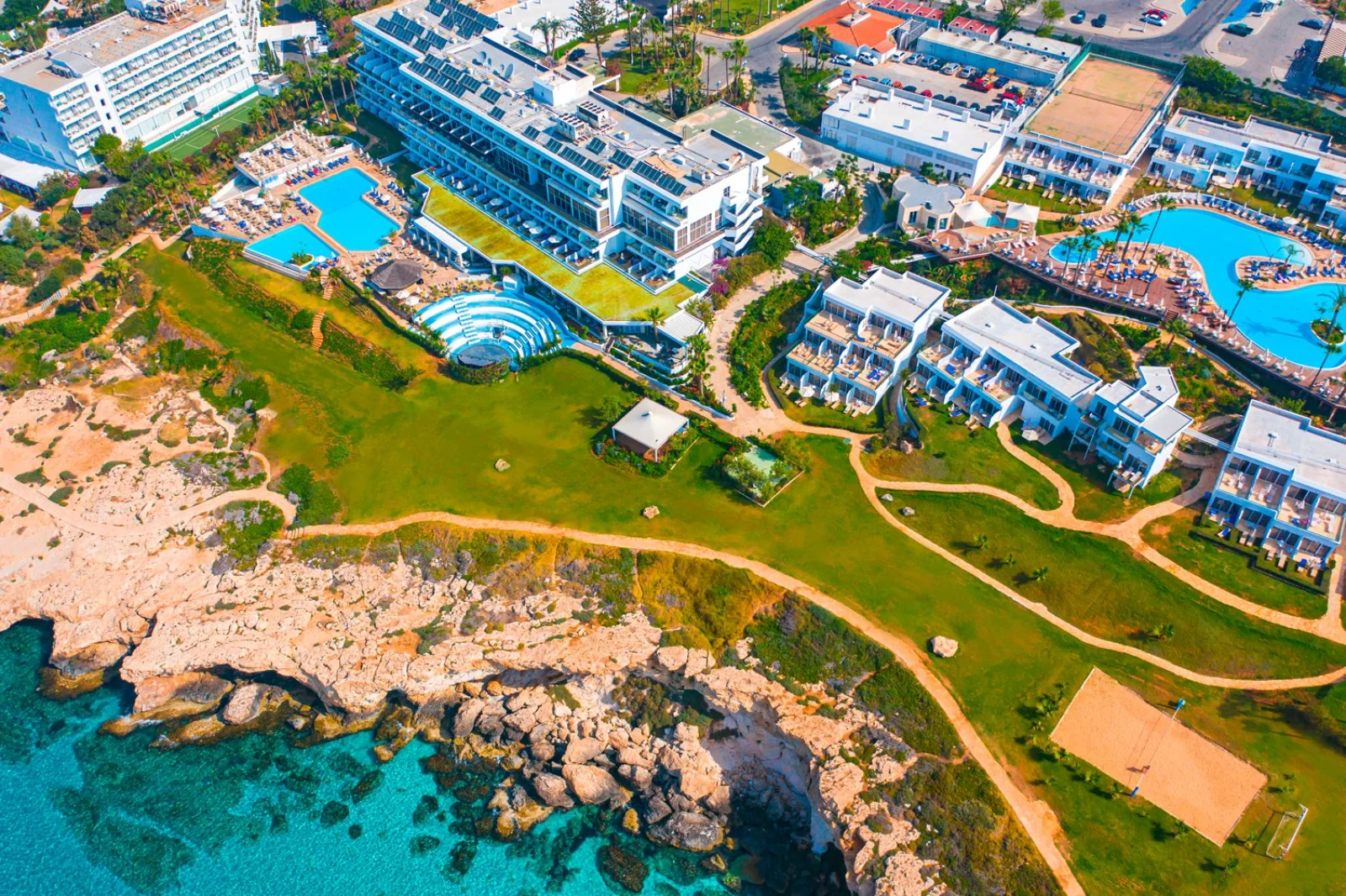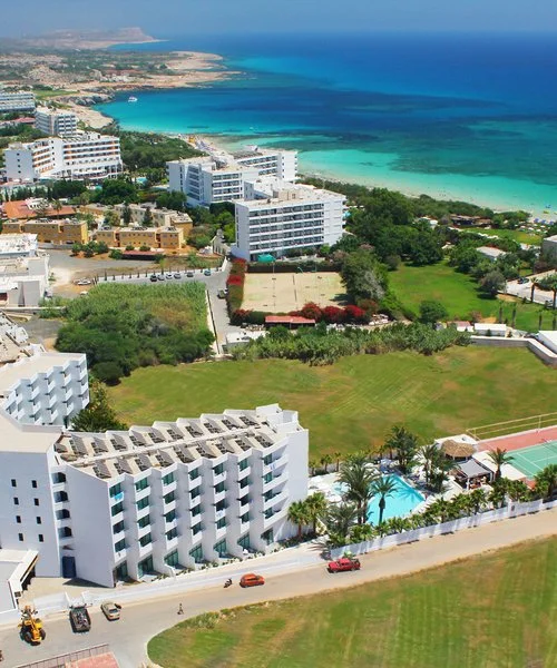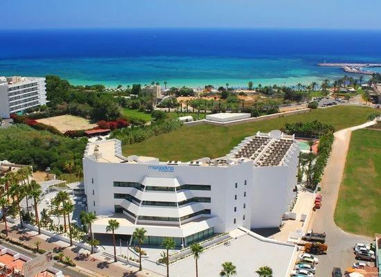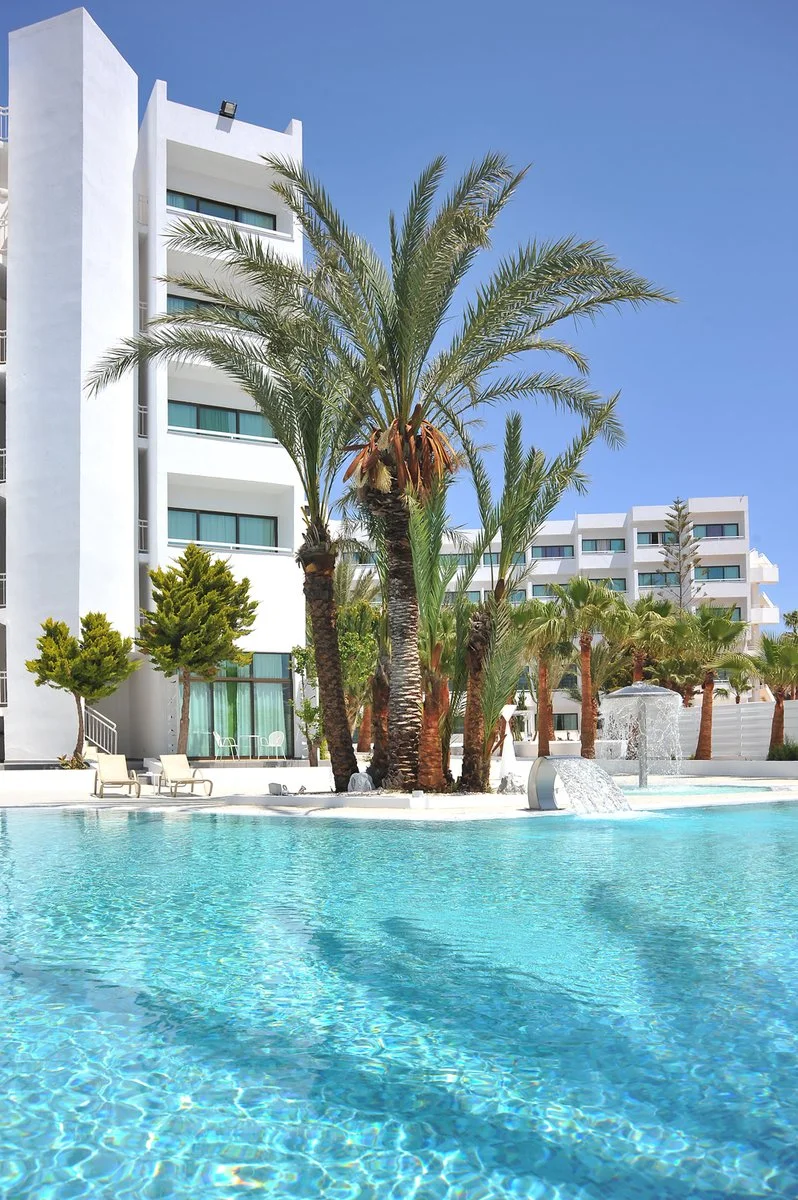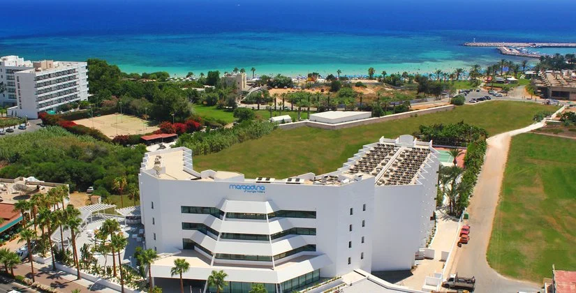 Sicuramente la proposta più eclettica della programmazione! Già all’esterno questo grande hotel internazionale attira l’attenzione per il suo imponente ingresso piramidale che, una volta varcata la soglia, rivela un design davvero originale, iniziando dalla hall ampia e ariosa da cui pende uno scenografico lampadario. Lo stile che caratterizza tanto gli ambienti comuni quanto le camere è il bianco quasi accecante delle pareti su cui spiccano dettagli e arredi coloratissimi, che donano vivacità all’elegante minimalismo che contraddistingue il Margadina. Le camere sono curate e ben tenute, in particolar modo le superior che sono state rinnovate nel 2018 assieme a molte delle aree comuni. Una folta e rigogliosa vegetazione incornicia le aree esterne, dal dehor del ristorante alla terrazza dell’elegante e sofisticato Allayla chillout bar aperto anche al pubblico, per cenare o sorseggiare un aperitivo immersi quasi in una piccola foresta. Anche la piscina è un tranquillo angolo di paradiso in cui rilassarsi all’ombra dei bianchissimi gazebi o delle palme, mentre i più esigenti potranno viziarsi nell’area benessere con spa, piscina e idromassaggio interni. Un breve sentiero pedonale parte dall’hotel e conduce in pochi passi alla bella spiaggia attrezzata di Limanaki, con acque dai colori cristallini. Sul lato ovest il porticciolo di Ayia Napa offre un paio di ottime taverne di pesce, mentre passeggiando a lungo verso est e superando la spiaggia di Glyki Nero potrete arrivare fino a una bassa scogliera, che nasconde numerose grotte e il suggestivo Bridge of Lovers, un arco di roccia molto fotogenico! Si tratta dunque della sistemazione giusta per coppie che vogliono concedersi una vacanza con tutti i comfort e al contempo a poca distanza dal centro di Ayia Napa, dove trascorrere qualche serata facendo shopping o a cena in uno dei bei ristoranti, come ad esempio il Sage con cucina fusion.