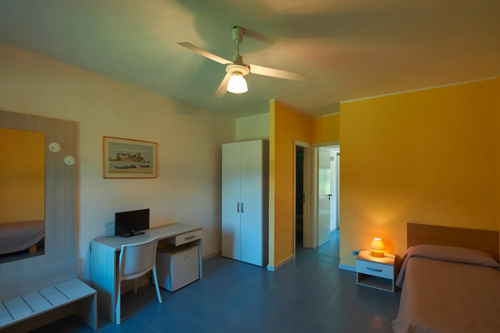 174, parte nel corpo centrale e parte nei villini, caratterizzate da uno stile sobrio ed essenziale, sono dotate di servizi, asciugacapelli, aria condizionata autonoma, ventilatore a pale, minifrigo, TV, cassetta di sicurezza, balcone o terrazzino se al primo o secondo piano e giardino comune se al piano terra. Si dividono in standard: doppie, ubicate nei villini al primo piano con balconcino, e family per 4/5 persone, a 2 vani, composte da camera matrimoniale e camera a 2/3 letti, ubicate al piano terra con giardino comune; comfort: completamente ristrutturate nel 2025 e con ampio box doccia, dotate di Wi-Fi possono essere doppie e triple con balcone se ubicate al 1° e 2° piano del corpo centrale o con giardino comune se al piano terra dei villini; doppie e triple con terrazza: ubicate nei villini, al 1° piano con ampia terrazza attrezzata; family per 4/5 persone a 2 vani, composte da camera matrimoniale e camera a 2/3 letti, ubicate al piano terra con giardino comune.