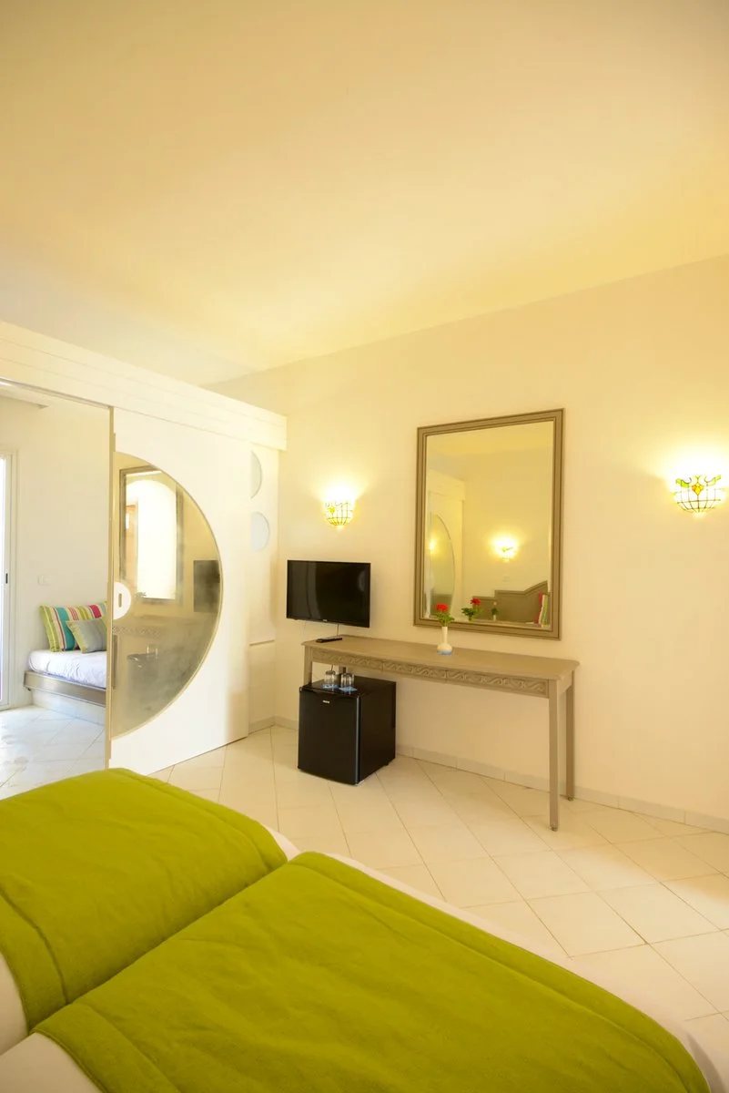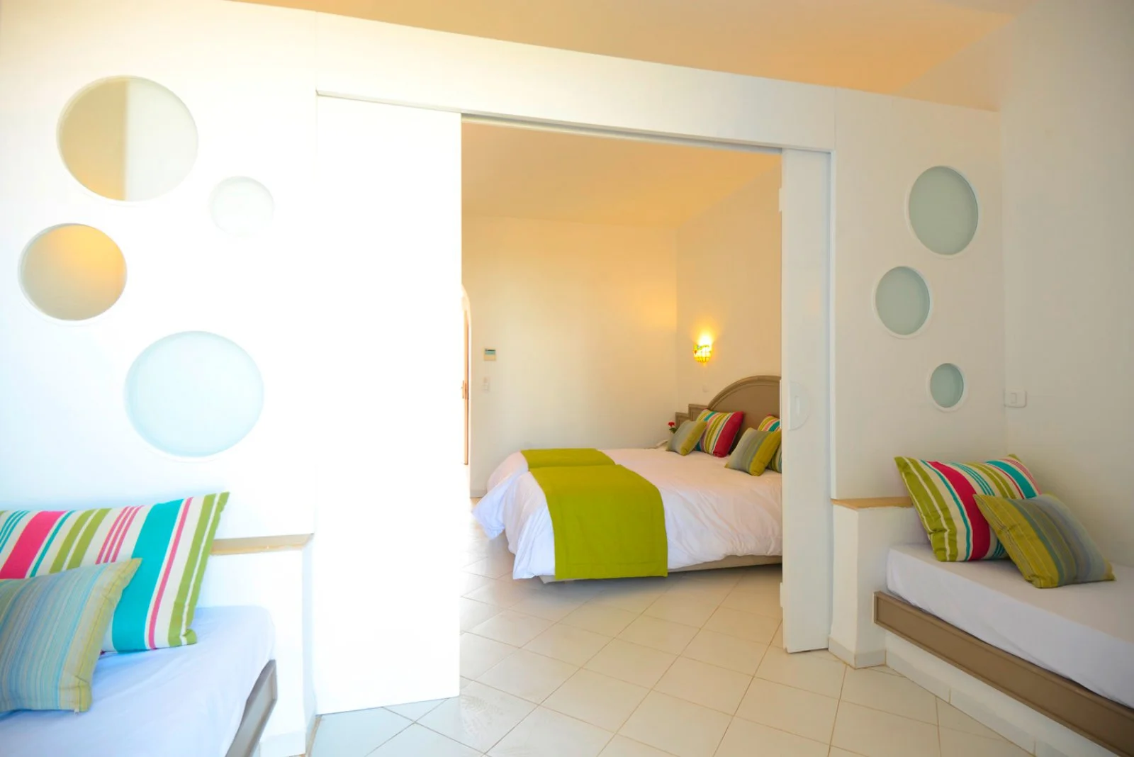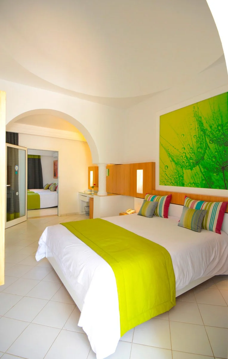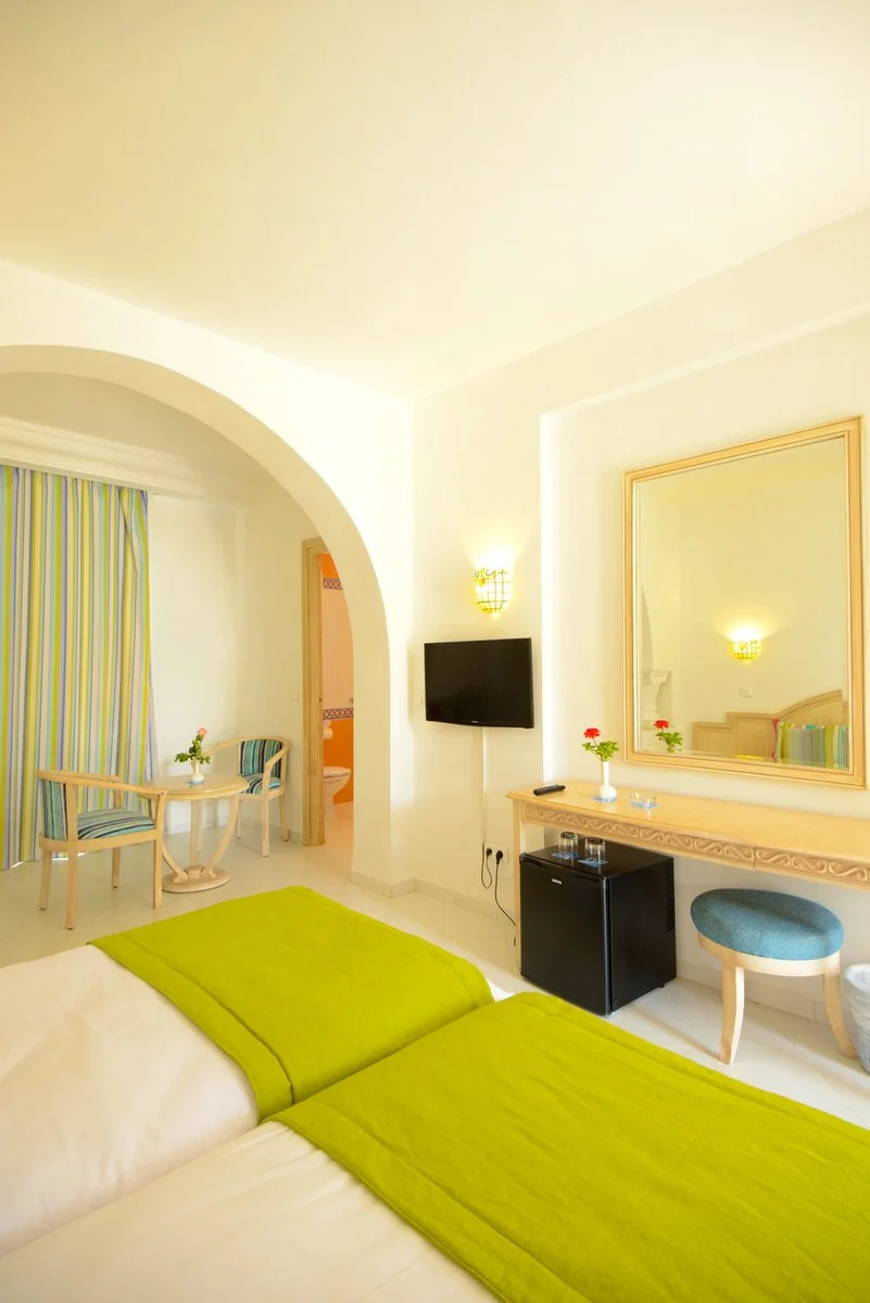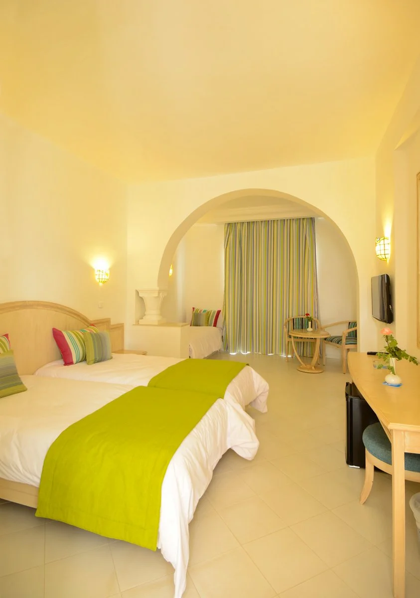 5 adulti insieme, perfette quindi per gruppi di amici e famiglie numerose. Le camere del Resort, arredate in stile semplice ma dai colori vivaci, sono collocate in graziosi bungalow bianchi e circondate da verdi e curati giardini. La combinazione del colore bianco, tipico tunisino e di colori vivace, viene ripreso anche nelle zone comuni che conferiscono al Resort un’aria giovane e frizzante. Per lo spasso di grandi e piccini, inoltre, il Resort è attrezzato di un completo