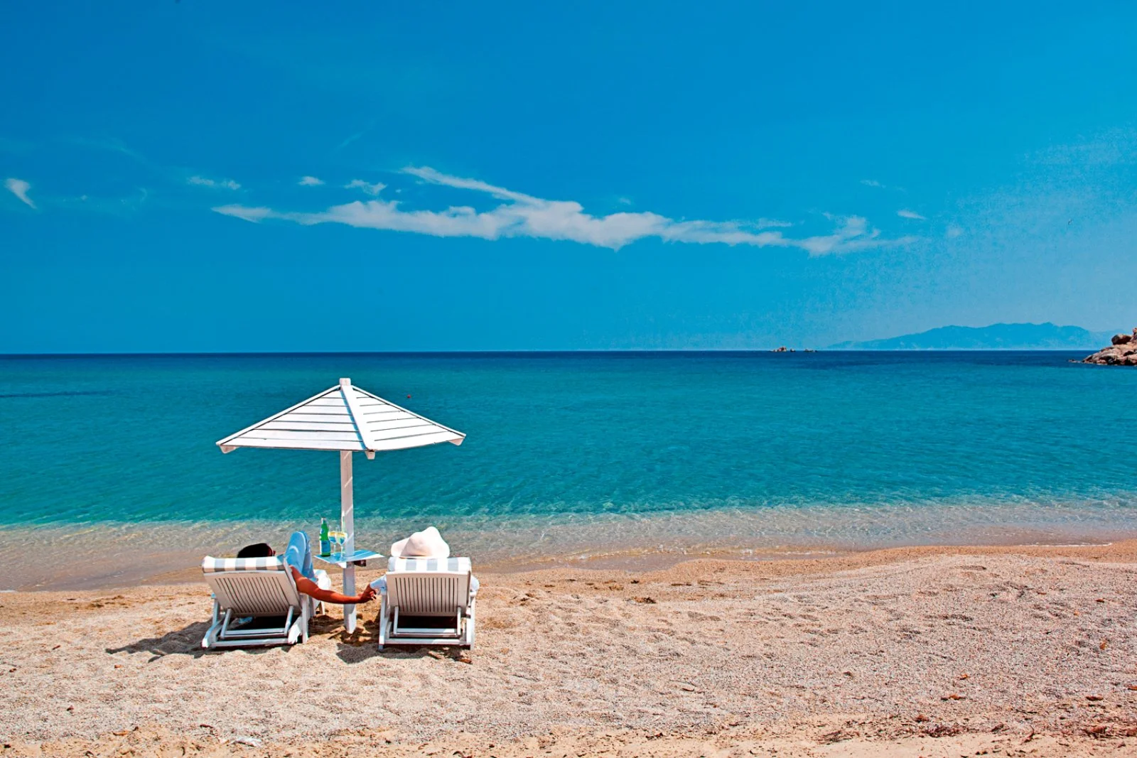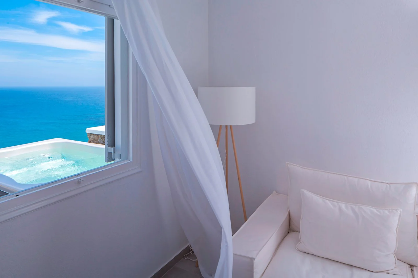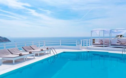 32, tutte vista mare e con il bianco come colore predominante, si presentano fresche, luminose e dagli arredi dal design contemporaneo. Tutte dotate di servizi privati, asciugacapelli, accappatoio e ciabattine, aria condizionata con controllo individuale, telefono, TV satellitare, connessione Wi-Fi, cassetta di sicurezza, minifrigo, terrazza o balcone con vista mare. Varie le tipologie proposte, le doppie classic vista mare, pensate per ospitare fino a 2 adulti; le camere superior vista mare, leggermente più spaziose e adatte a un massimo di 3 adulti; e le junior suite vista mare, ancora più spaziose, con area living, vasca idromassaggio (max 4 adulti). Sono inoltre presenti camere classic e junior suite, che, pur mantenendo le stesse caratteristiche delle corrispondenti tipologie vista mare, offrono anche una vasca idromassaggio esterna.
