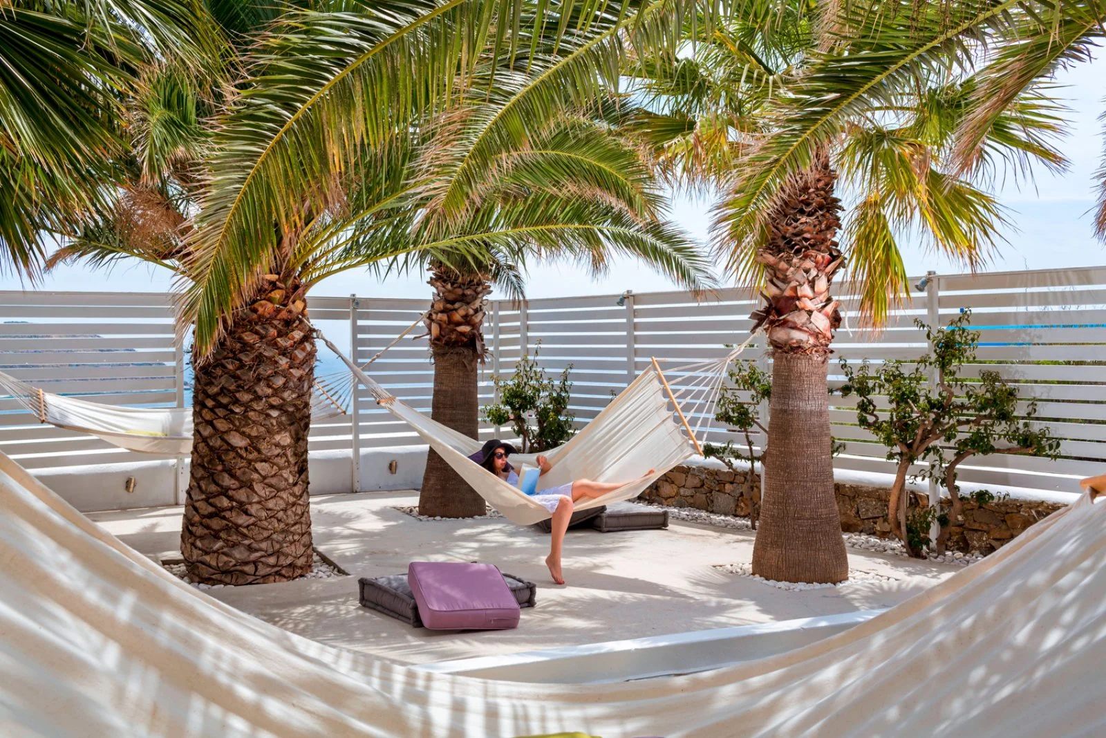 Si trova a Kalo Livadi, a circa 2 km dal caratteristico villaggio di Ano Mera, 12 km dal centro di Mykonos e 10 km dall’aeroporto. Il suo punto di forza è senza dubbio la posizione invidiabile, che abbraccia la baia sottostante e regala una vista mozzafiato. È costituito da piccoli edifici a 2 piani dall’inconfondibile stile cicladico, che si uniscono ad un design moderno e confortevole e a servizi di qualità.