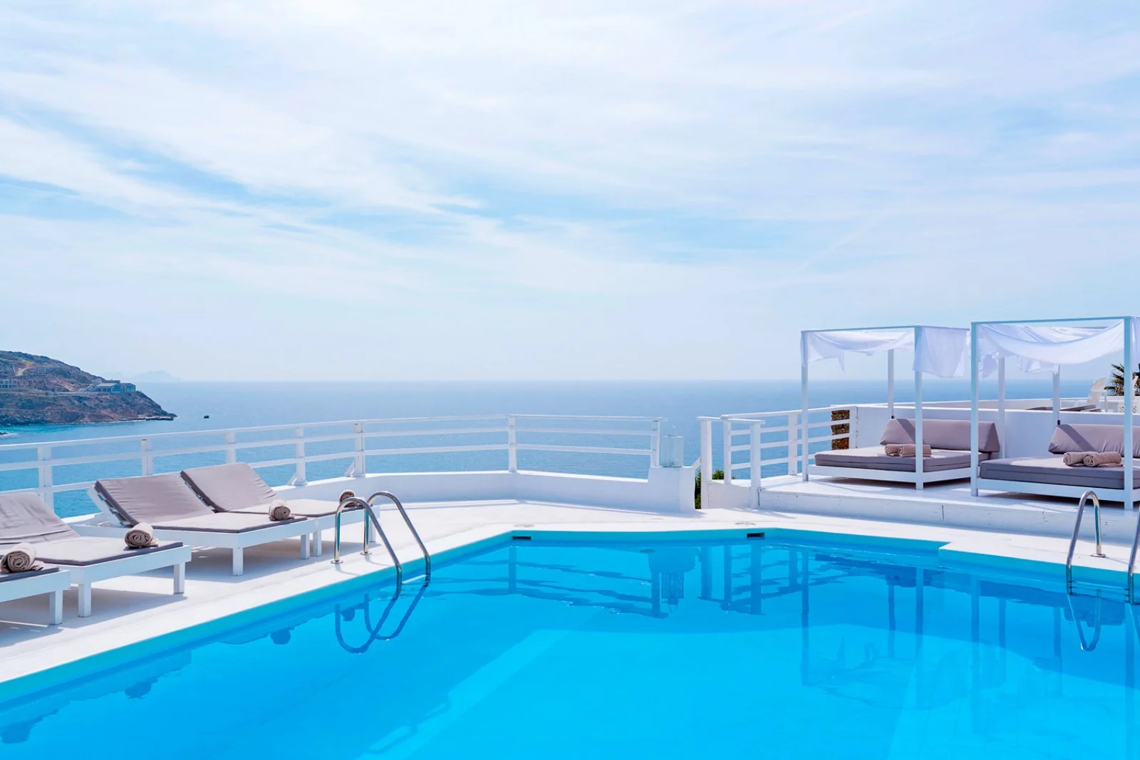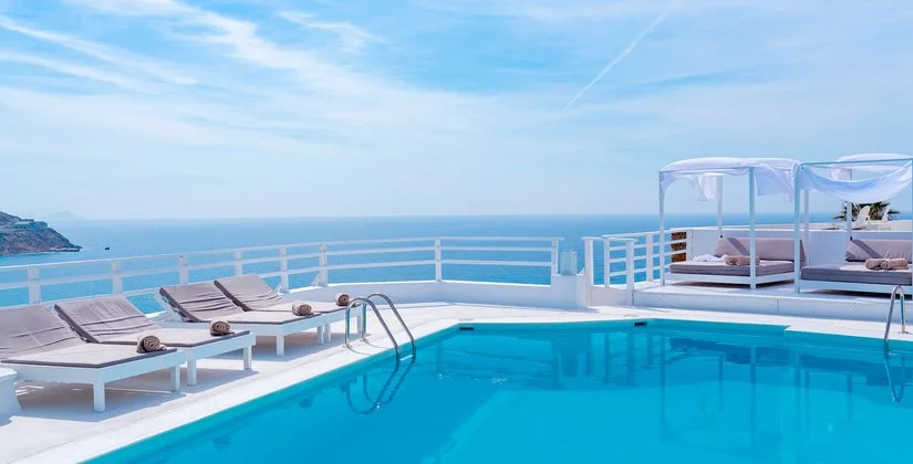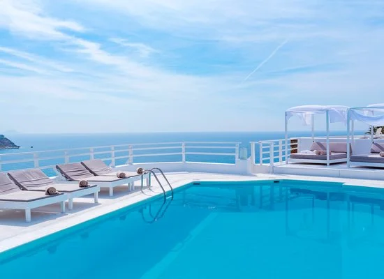 In magnifica posizione panoramica, domina la baia di Kalo Livadi, considerata una delle spiagge più belle dell’isola. Rinnovata di recente, la struttura si presenta in una nuova veste minimal ed elegante, combinando sapientemente lo stile tradizionale delle Cicladi al design contemporaneo.