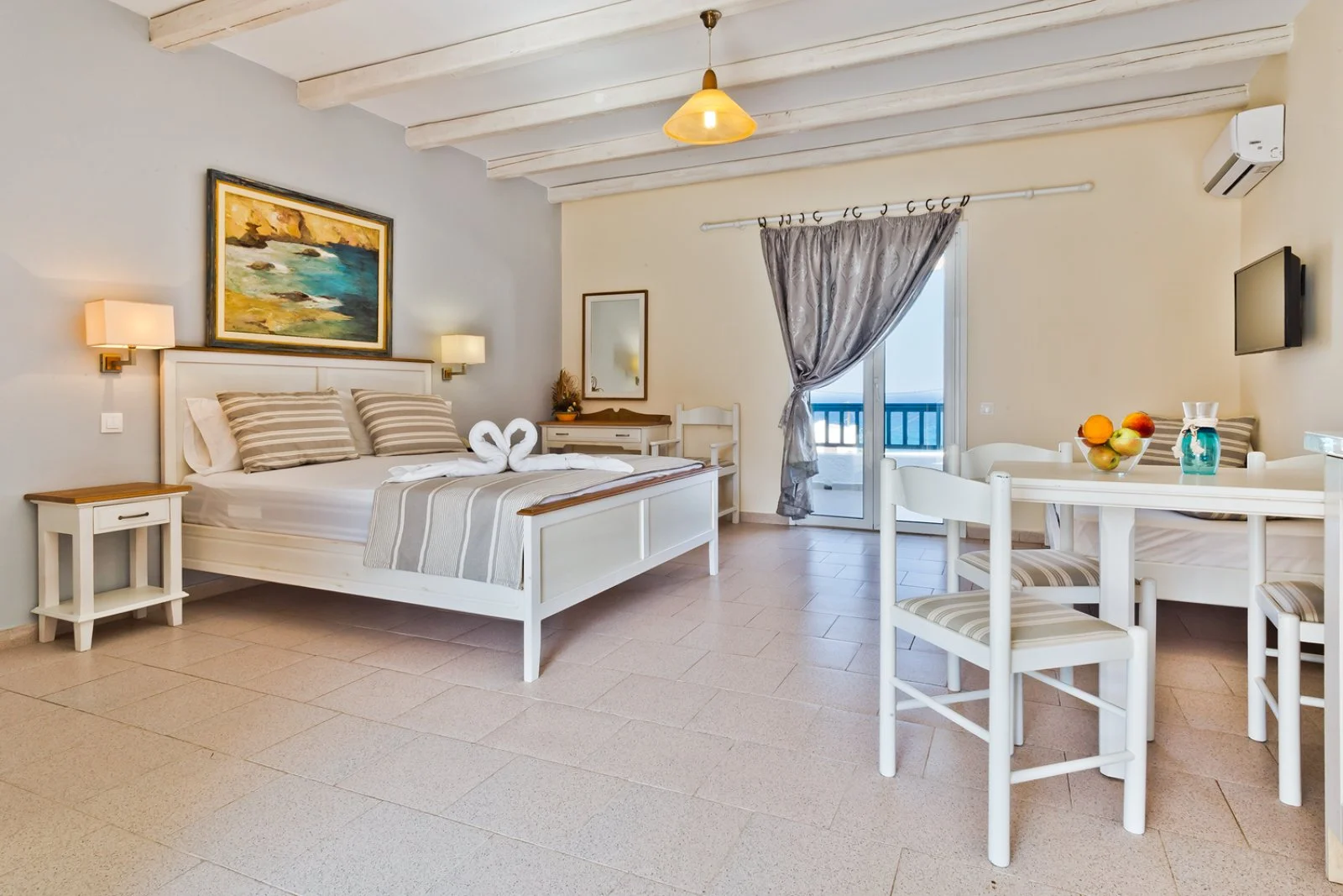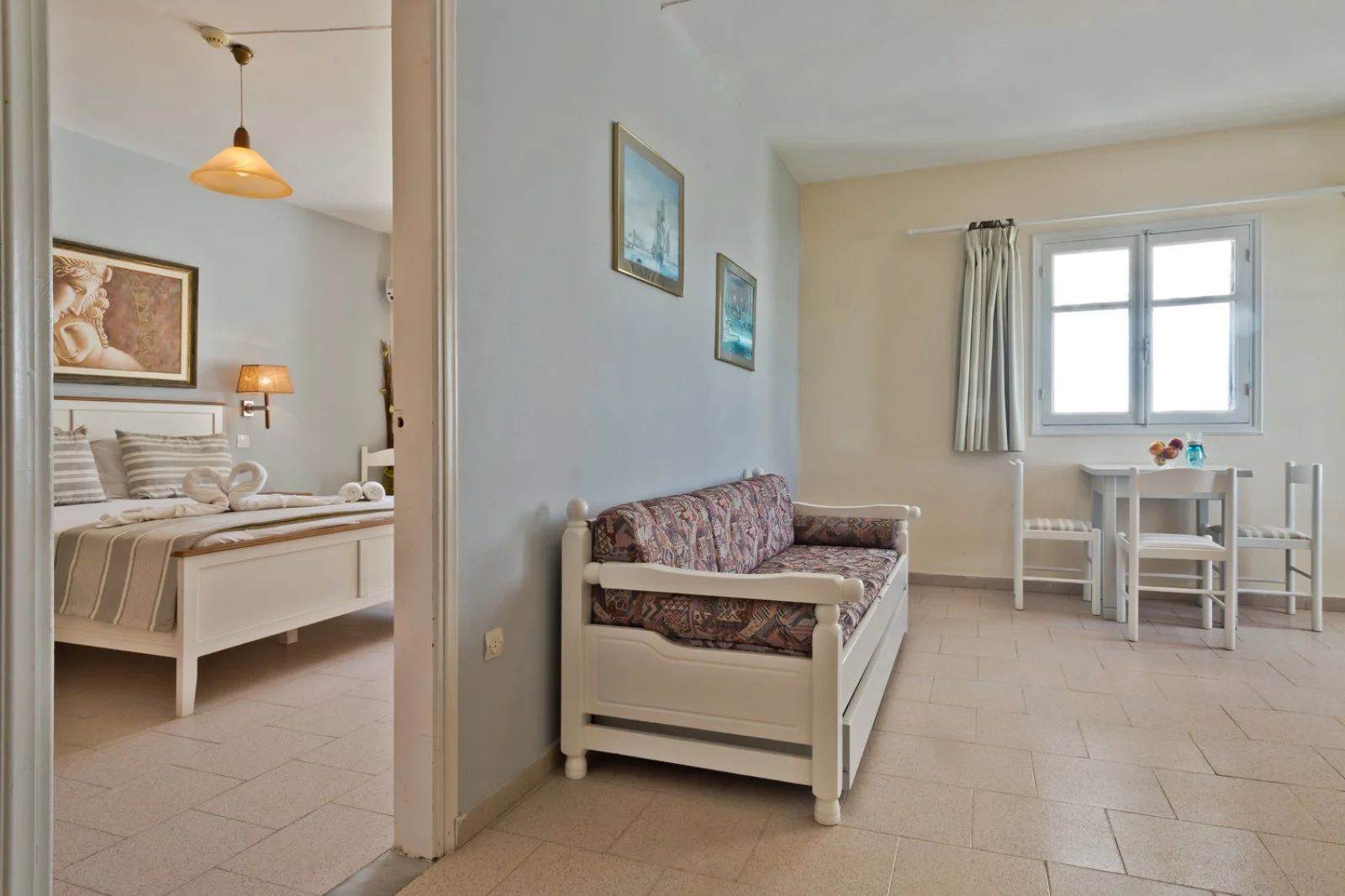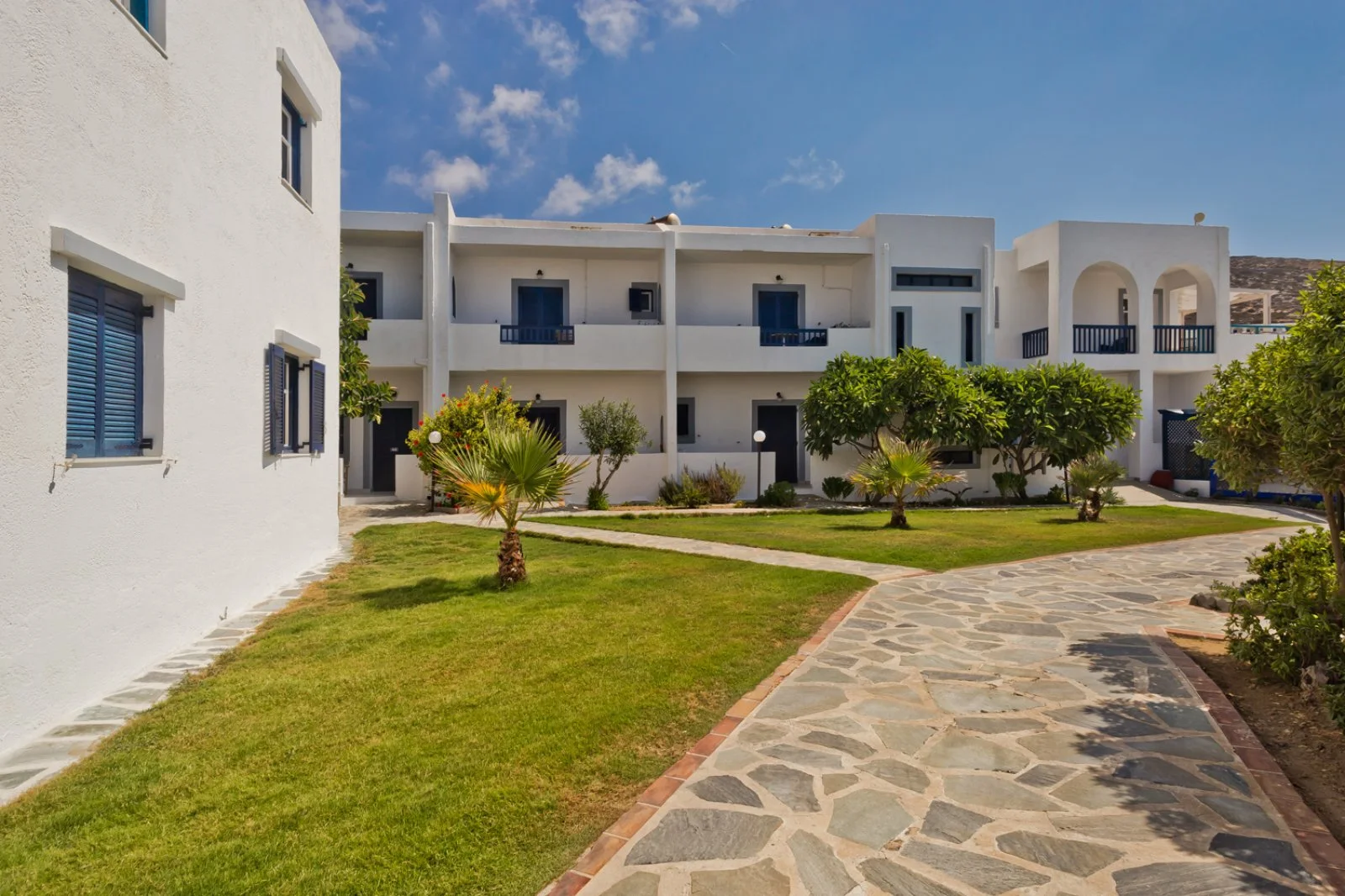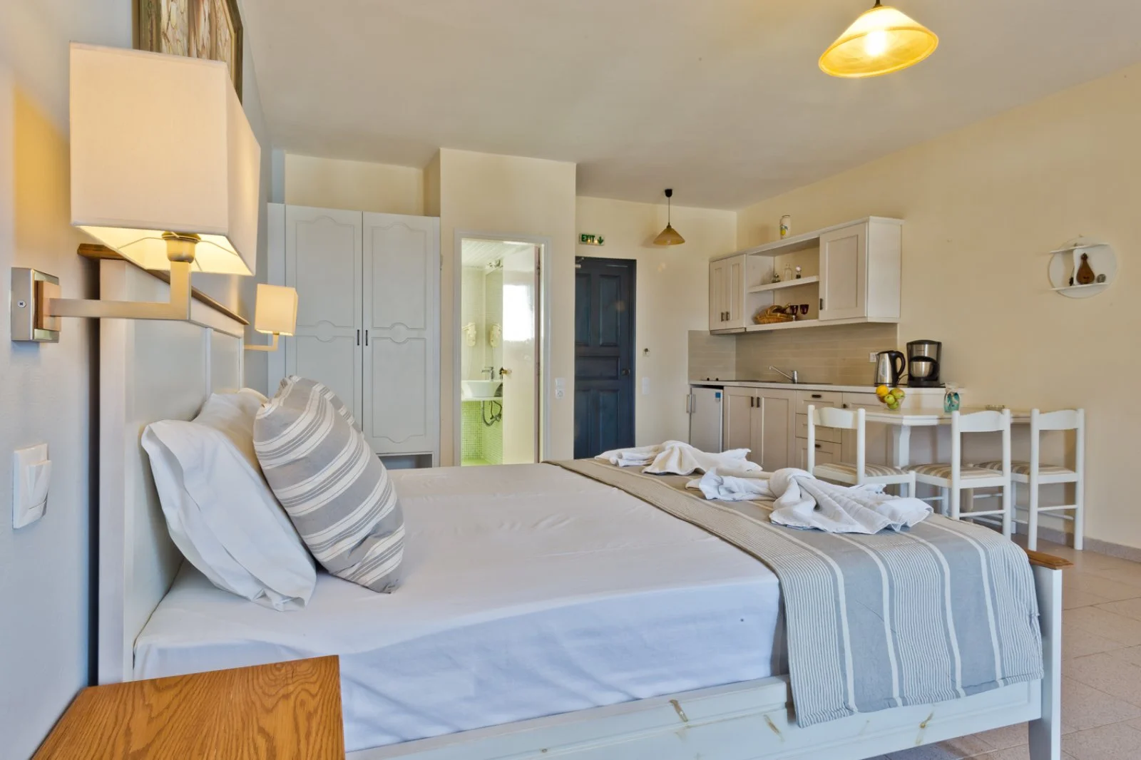 25, di cui 16 studio e 9 bilocali, freschi e luminosi, decorati con colori chiari e dotati dei principali comfort, tra cui asciugacapelli, aria condizionata con controllo individuale, minifrigo, angolo cottura accessoriato, bollitore, accesso internet Wi-Fi, cassetta di sicurezza, eventuale culla (su richiesta) e balcone o terrazzo. Gli studio con ambiente unico ospitano fino a 3 adulti, mentre i bilocali, più spaziosi, con camera da letto e soggiorno separati, fino a 4 adulti. La pulizia è giornaliera, il cambio della biancheria da letto e da bagno 3 volte a settimana.