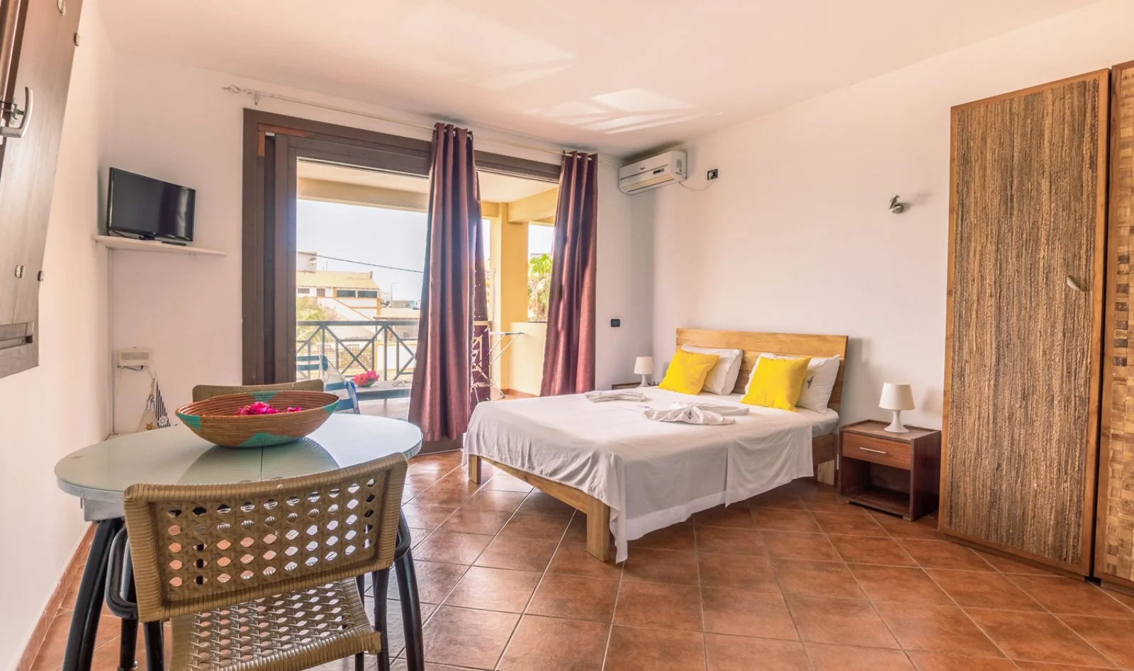 100 appartamenti tra cui studio (35 m2), con angolo cottura attrezzato con frigorifero, terrazza o balcone, servizi privati, aria condizionata, asciugacapelli, TV satellitare, cassetta di sicurezza e connessione wi-fi gratuita. Disponibili con supplemento, studio vista mare, appartamenti bilocali con o senza vista mare (45 m2, max 3 adulti + 1 bambino) composti da camera da letto e zona giorno separata e trilocali con o senza vista mare (60 m2, max 5 adulti + 1 bambino), composti da due camere da letto e zona giorno separata. Cambio asciugamani e lenzuola una volta a settimana