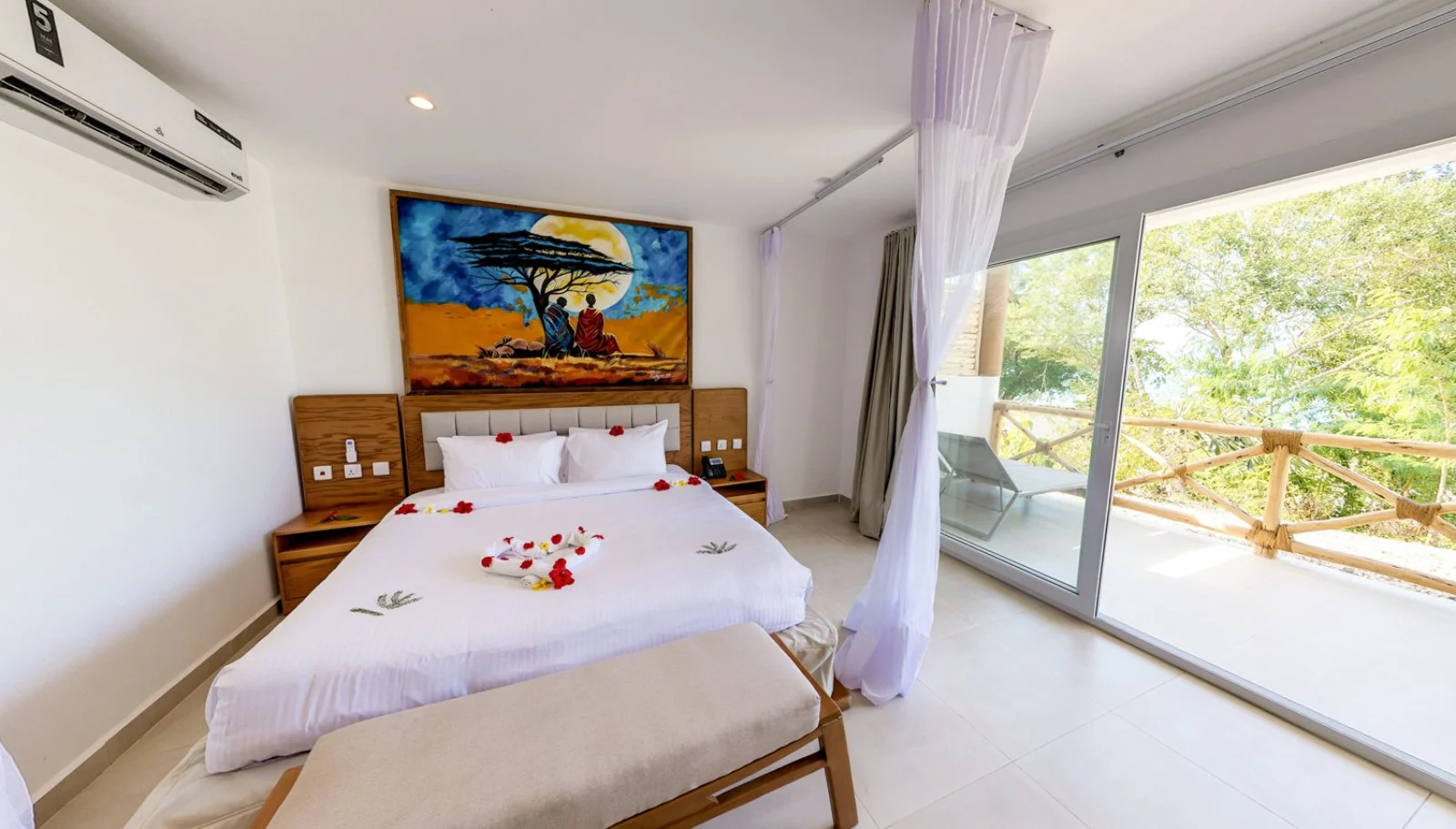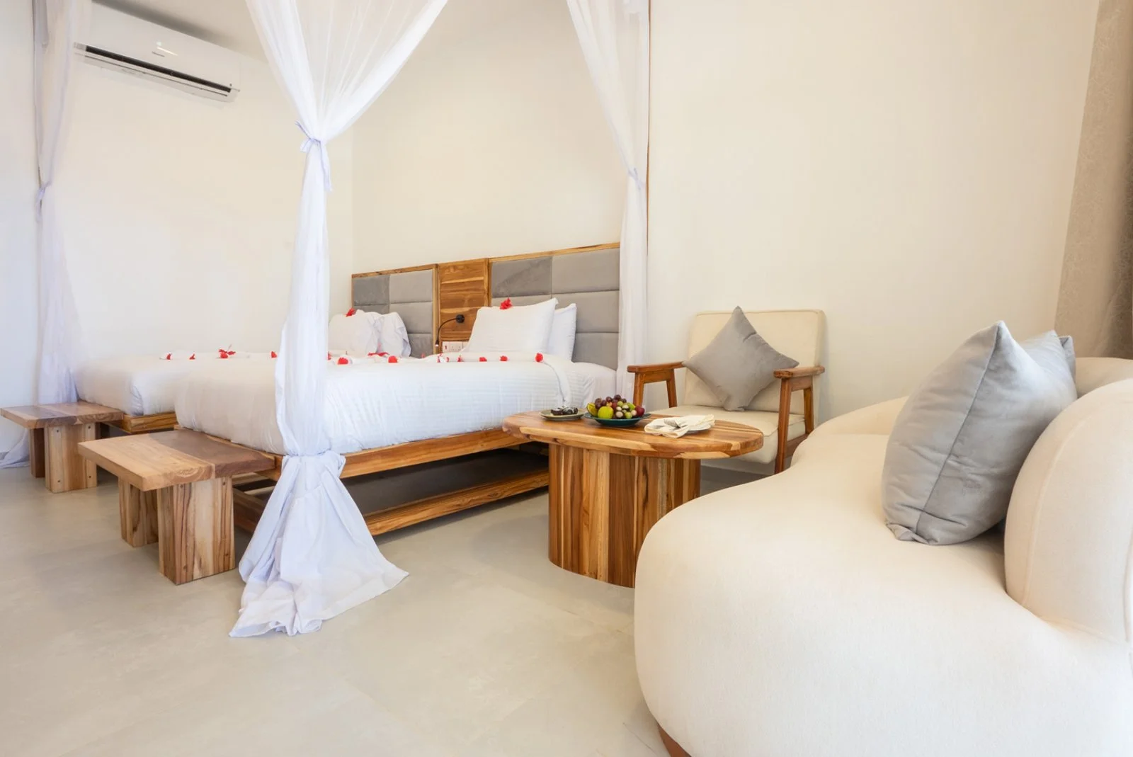 52 camere disposte su 2 piani, ampie e arredate con gusto e dotate di servizi privati, asciugacapelli, aria condizionata, ventilatore a soffitto, cassetta di sicurezza, tv satellitare, macchinetta del caffè con cialde incluse, bollitore, set di accappatoio e ciabattine, minifrigo, connessione wi-fi gratuita e terrazza o balcone. Disponibili, con supplemento, camere vista mare (50 m², fino a 4 persone), beach bungalow fronte mare (50 m², fino a 4 persone) con patio di 15 m², entrambe con area salotto, e camere family (65 m², fino a 5 persone) con 2 ambienti separati.