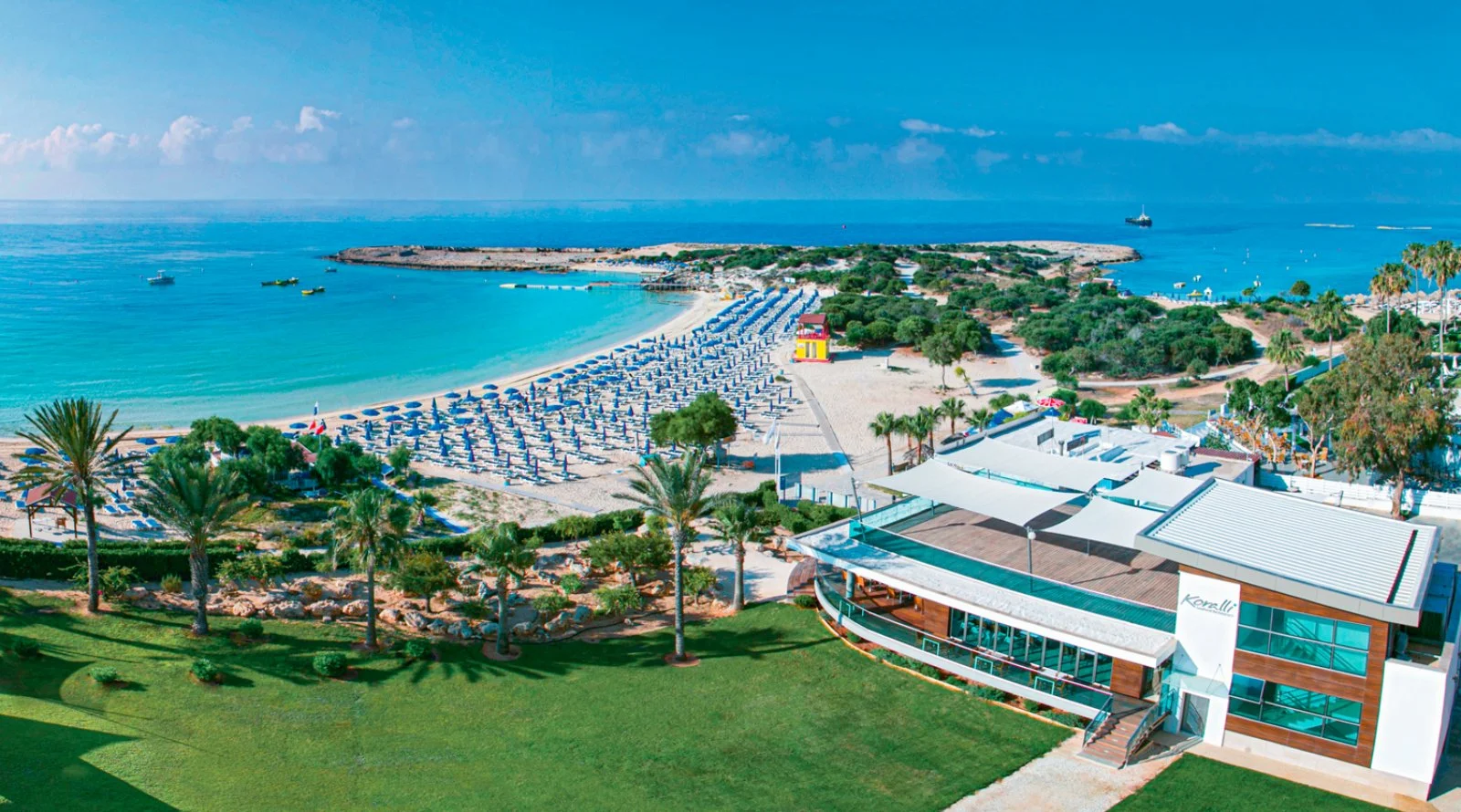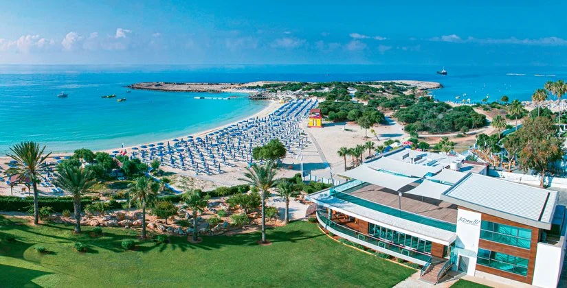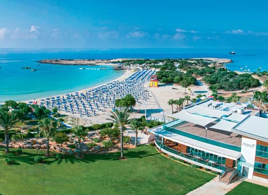 Molto conosciuto e apprezzato dalla clientela italiana, si trova a 51 km dall’aeroporto di Larnaca e a 4 km dalla vivace Ayia Napa. La struttura si affaccia sulla bella baia di Makronissos con un’ampia spiaggia di sabbia bagnata da acque cristalline digradanti (attrezzature in spiaggia a pagamento). Due belle piscine, con area per bambini, una laterale dedicata alle camere con accesso diretto, e una piscina coperta presso la SPA; utilizzo gratuito di lettini, ombrelloni e teli mare solo in piscina.