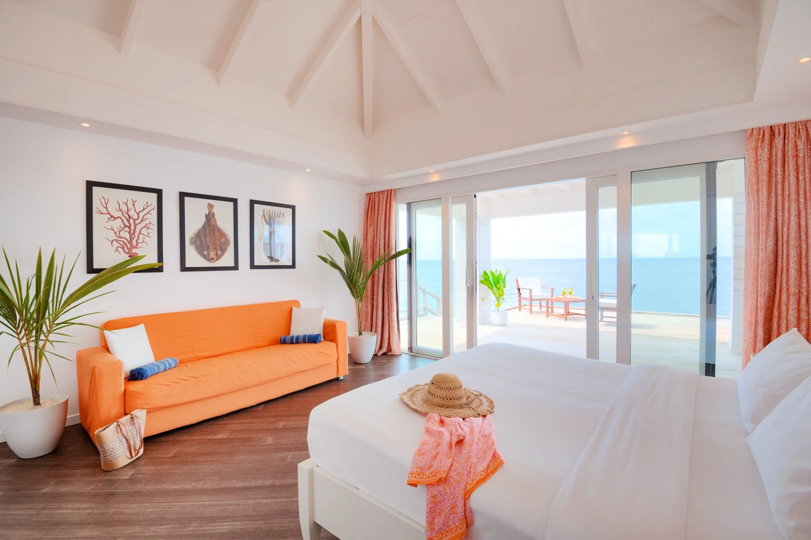 Il resort offre agli ospiti due tipologie di camere: 46 beach bungalow completamente rinnovati in un elegante mix di modernità e stile tipico maldiviano, dove domina il bianco, distribuiti sul perimetro esterno dell’isola e affacciati direttamente sul mare (massima occupazione 2 adulti e 1 bambino o 3 adulti); 24 water bungalow accessibili da un pontile in legno, dispongono di letto matrimoniale e divano letto (massima occupazione 3 adulti e 1 bambino o 4 adulti) e di una terrazza attrezzata con lettini. Nei water bungalow i bambini sono ammessi a partire dagli 8 anni. Tutte le camere sono dotate di aria condizionata, servizi privati con doppio lavabo, doccia (in stile “maldiviano” nei beach bungalow), asciugacapelli, telefono, cassetta di sicurezza, set per la preparazione di tè e caffè all’americana, minifrigo rifornito giornalmente di acqua minerale, veranda attrezzata e connessione Wi-Fi.
