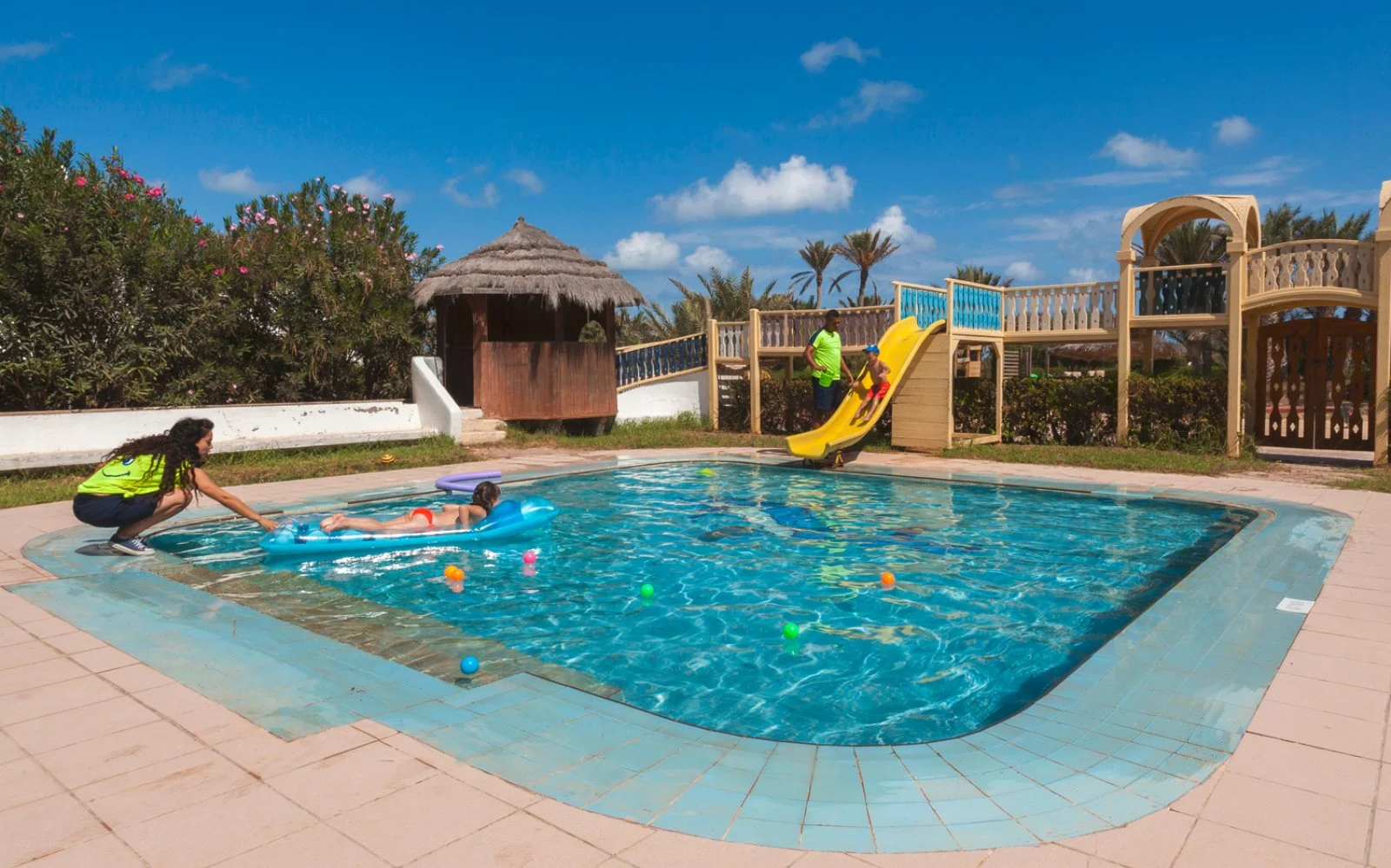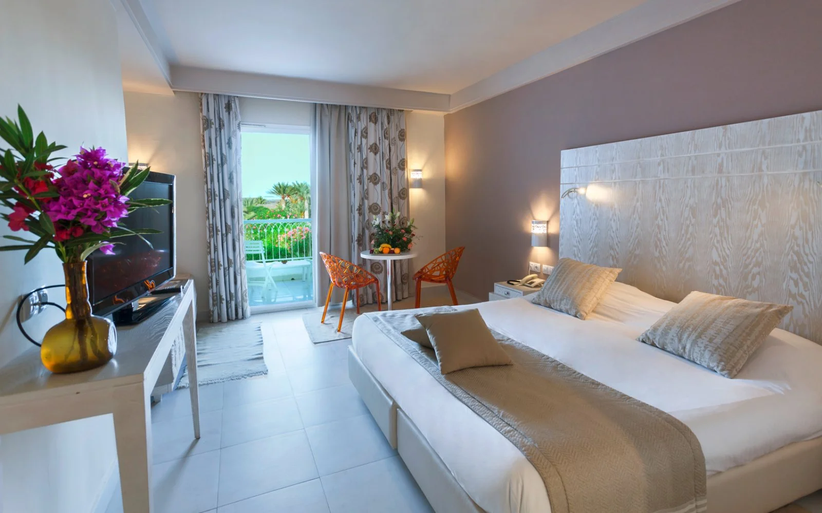 352 camere distribuite in 7 edifici in stile locale, chiamati Borj, ognuno con un giardino interno. Si dividono in 308 camere: doppia standard, quadrupla standard (massima occupazione 4 adulti), con vista giardino o piscina e 44 superior (situate al 1° piano senza ascensore, massima occupazione 2 adulti) con vista mare, dotate di minifrigo e bollitore per tè e caffè e cassetta di sicurezza.