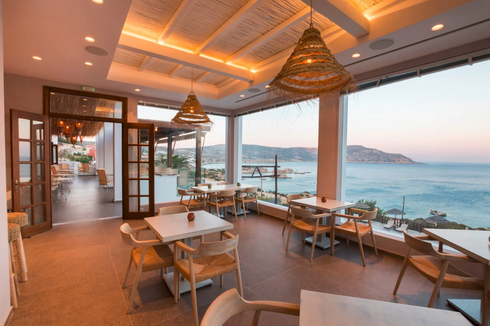 Il ristorante vanta una magnifica vista sul mare e prevede servizio a buffet per la prima colazione e servizio al tavolo con set menù per la cena, con un’ampia scelta di piatti della tradizione mediterranea. L’hotel dispone inoltre, a pagamento, di lobby bar, pool bar ed un pool/snack bar presso la piscina a sfioro.