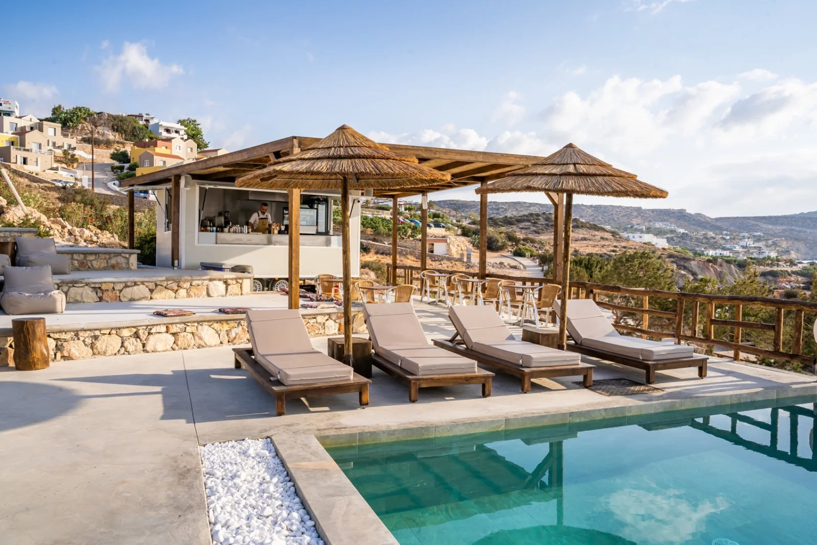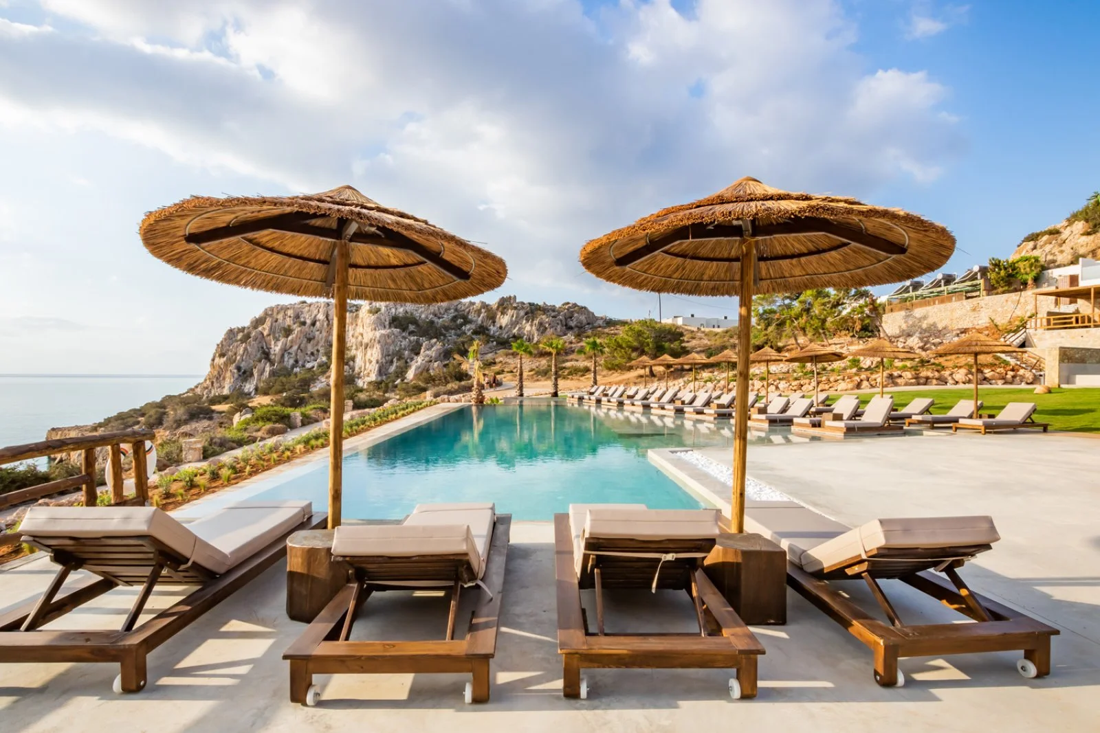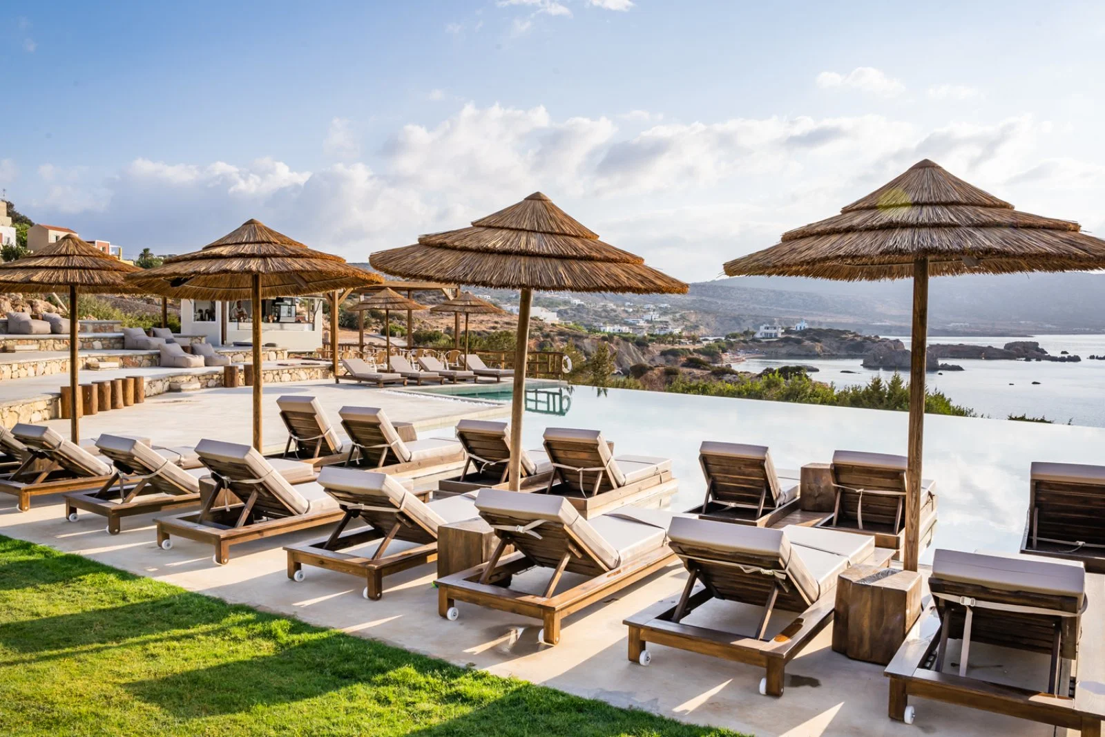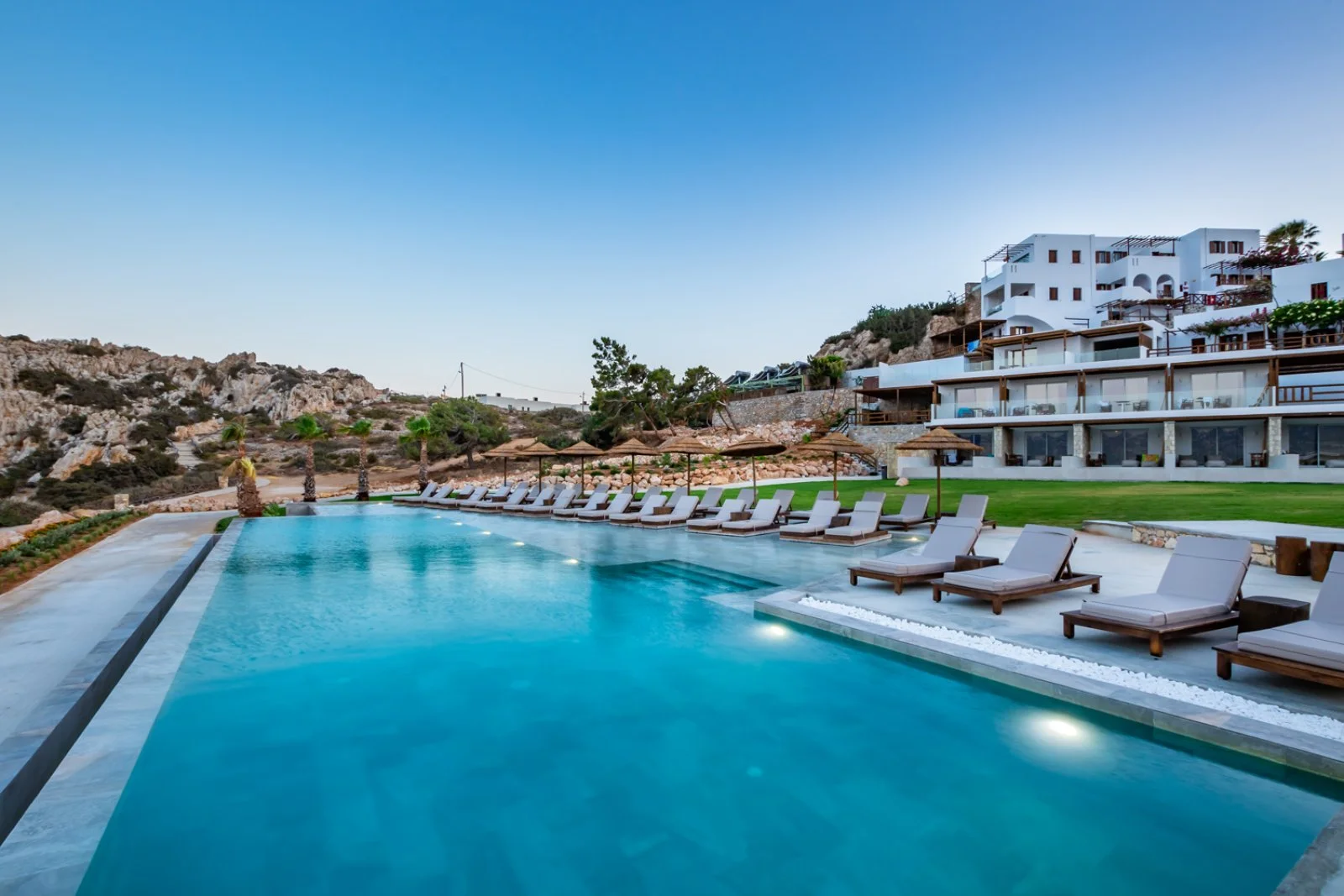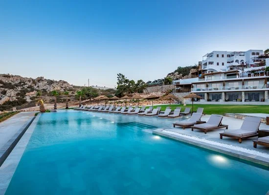 Il resort gode di una splendida vista panoramica e sorge proprio sopra una piccola e appartata spiaggetta. Si trova nel sud dell’isola, a circa 8 km da Pigadia e a pochi minuti a piedi da splendide spiagge di sabbia o ciottoli e suggestive scogliere a picco sul mare: la famosa spiaggia di Amoopi si trova a soli 400 m circa ed è raggiungibile camminando lungo un piacevole sentiero che costeggia la meravigliosa baia. È costituito da vari edifici a due piani dall’aspetto fresco che mantengono dettagli appartenenti alla classica accoglienza greca, raccolti intorno alla piccola piscina panoramica con area per bambini, e da un’area di più recente costruzione dal design contemporaneo, dove si trovano le camere con piscina privata e una scenografica piscina a sfioro. Utilizzo gratuito di lettini, ombrelloni e teli mare presso le due piscine.