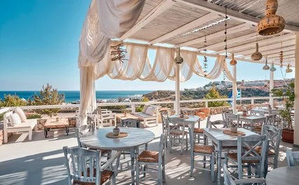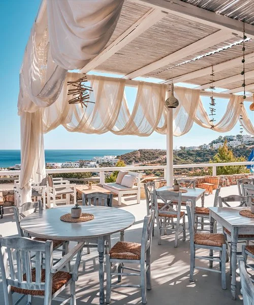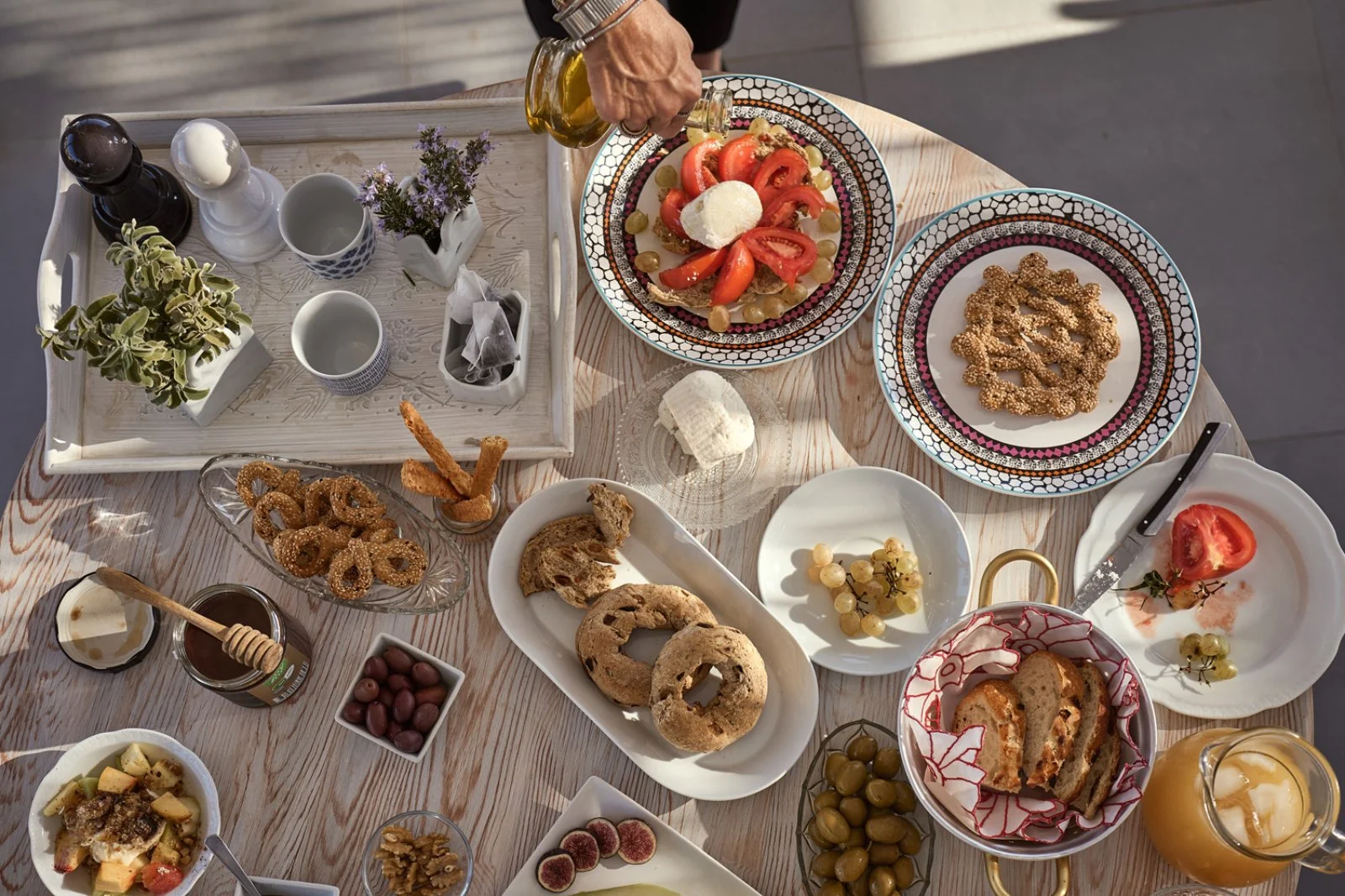 La prima colazione karpathiana, inclusa per gli ospiti che scelgono il trattamento di pernottamento e prima colazione, viene servita al tavolo nella graziosa sala dedicata o sulla terrazza panoramica con vista sulla baia ed è un’esperienza da non perdere: tutti i prodotti, dalla frutta fresca, alle marmellate fatte in casa e all’immancabile yogurt greco, sono rigorosamente biologici e locali, e rappresentano una vera e propria esperienza gastronomica accompagnata dalla squisita ospitalità della proprietaria, che ti farà sentire come a casa. A disposizione degli ospiti è presente, inoltre, uno swim-up bar in stile boho-chic all’interno della piscina. A pagamento: possibilità di menù light e deliziosi piatti preparati in casa presso il lobby bar e lo swim-up bar.