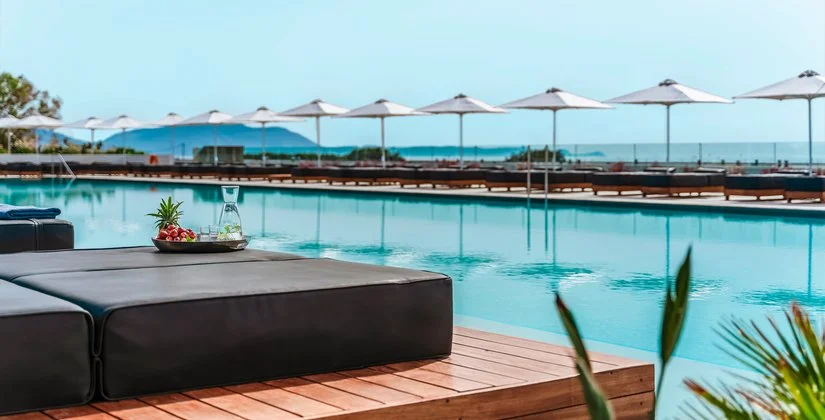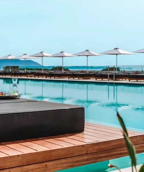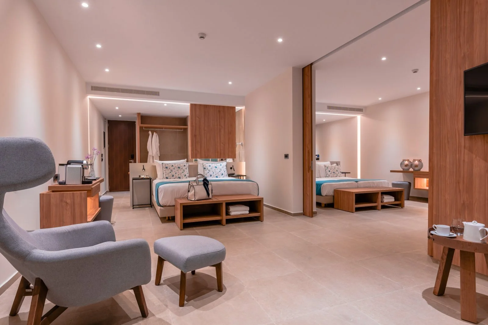300, arredate con gusto in stile contemporaneo, sono divise in varie tipologie: doppie vista giardino o con piscina privata; junior suite open plan con vista giardino o vista mare o con piscina privata; suite vista giardino con camera da letto e soggiorno separati; suite due camere vista giardino con due camere da letto separate da porta scorrevole, un soggiorno e due bagni. Le doppie promo sono camere con tariffa promozionale e disponibilità limitata. Tutte sono dotate di accappatoio, ciabattine, asciugacapelli, aria condizionata a controllo individuale, Wi-Fi, TV satellitare, telefono, cassetta di sicurezza, minifrigo, macchina per caffè espresso, set per tè, balcone o terrazzo e, su richiesta, menù scelta cuscino. Le suite prevedono anche accesso esclusivo 2 volte a settimana al ristorante Level2 per una prima colazione all’americana con stupenda vista panoramica.