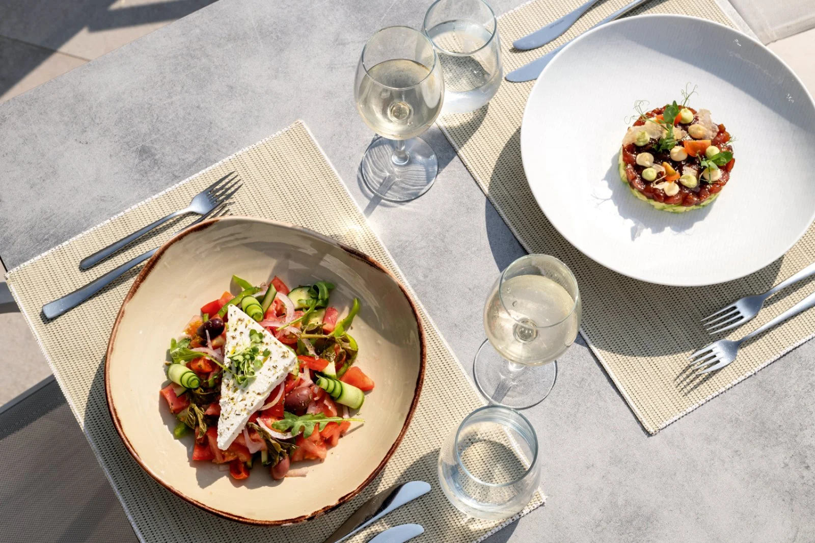 Il ristorante principale Estia vanta una suggestiva terrazza vista mare e offre prima colazione e cena con servizio parzialmente a buffet e angolo show cooking. La formula mezza pensione include inoltre la possibilità di cenare con set menù una volta a settimana sia presso l’ottimo ristorante à la carte Pelagos accanto alla piscina principale sia presso il ristorante Meltemi in spiaggia con specialità greche (in entrambi i casi previa prenotazione). Completano l’offerta, a pagamento, menù à la carte al Pelagos e al Meltemi, bar in spiaggia, bar presso la piscina principale e Vergina lounge bar.