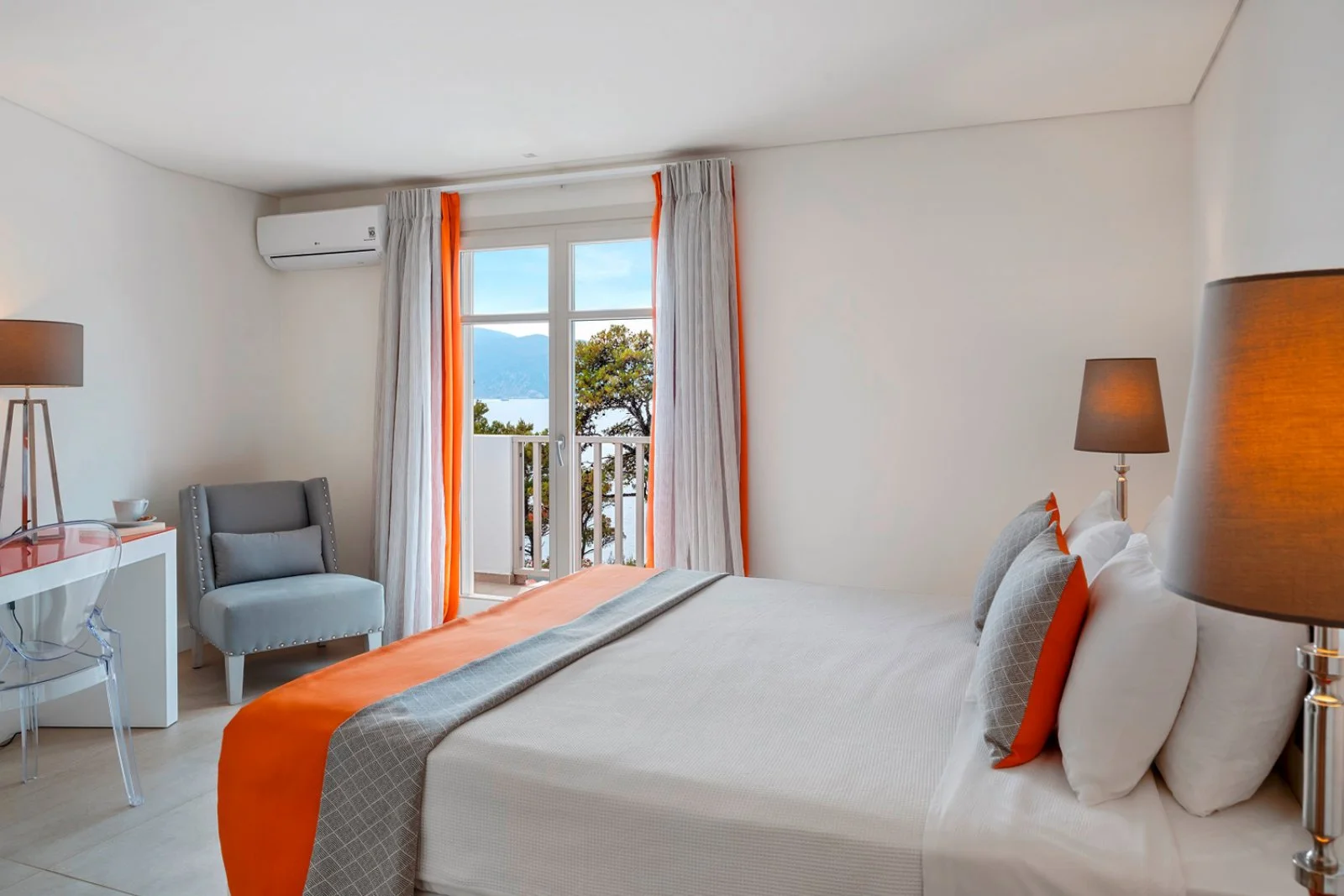 La struttura è discreta e raccolta, con solo 104 camere, suddivise in diverse tipologie a seconda della posizione e dell’ampiezza, che si trovano nella parte alta del resort, raggiungibile percorrendo una breve salita nel verde della pineta; sono ubicate in un tipico villaggio del quale mantengono le caratteristiche di costruzione, e proprio nel rispetto della struttura originale, sono di dimensioni contenute (20 m2 la camera standard village view). Tutte sono curate e moderne con TV, minifrigo, set per il tè e caffè, cassetta di sicurezza, Wi-Fi, accappatoio e ciabattine, asciugacapelli, comoda doccia walk-in e piccolo terrazzino o patio, eccetto le camere standard che hanno le sedie con il tavolo vicino all’ingresso.
