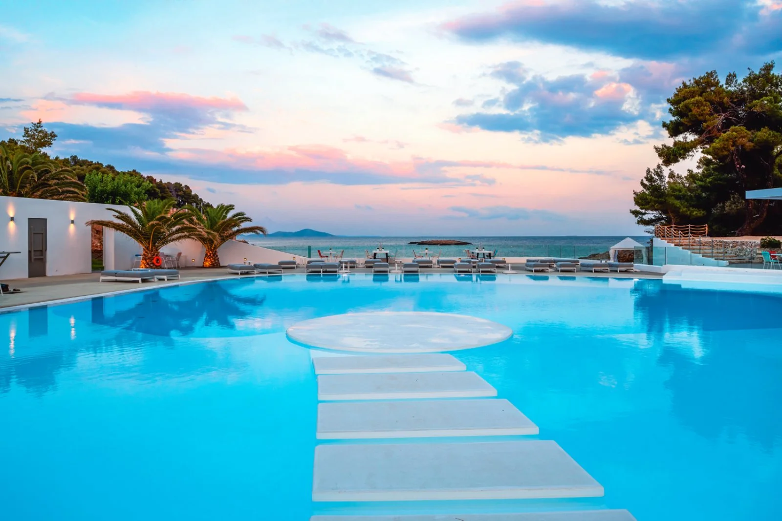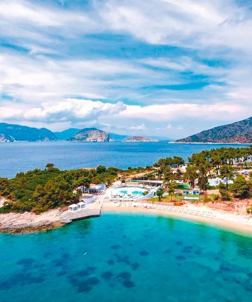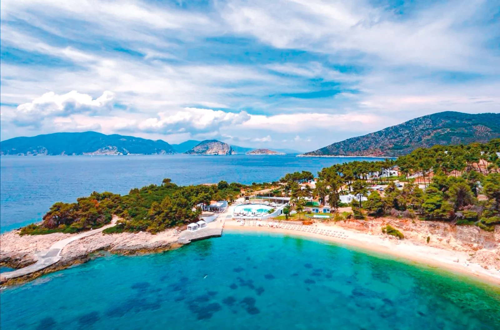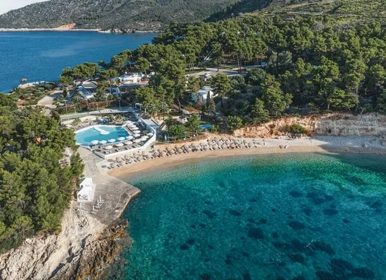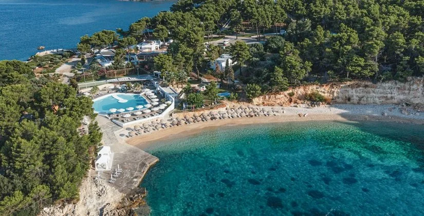 Ubicato all’interno del parco marino protetto di Alonissos, uno tra i più grandi in Europa, a circa 1 ora e mezza di traghetto dal porto di Skiathos (per maggiori dettagli sui trasferimenti consulta il nostro sito). È adagiato su di una verde e piccola penisola privata, circondata da acque turchesi, dove si affacciano le 2 spiagge di ciottoli, una proprio di fronte alla nuova piscina (con acqua di mare), mentre l’altra, più piccola, in posizione tranquilla. Lettini, ombrelloni e teli mare sono a disposizione degli ospiti gratuitamente sia in spiaggia che in piscina.
