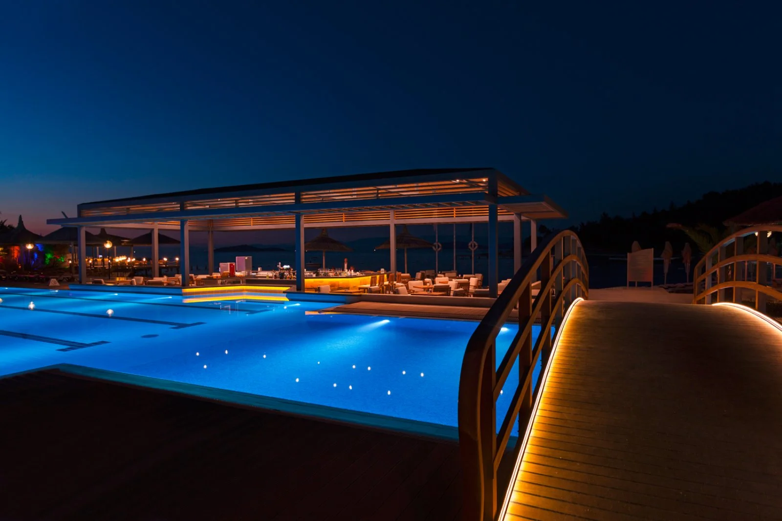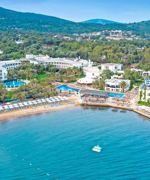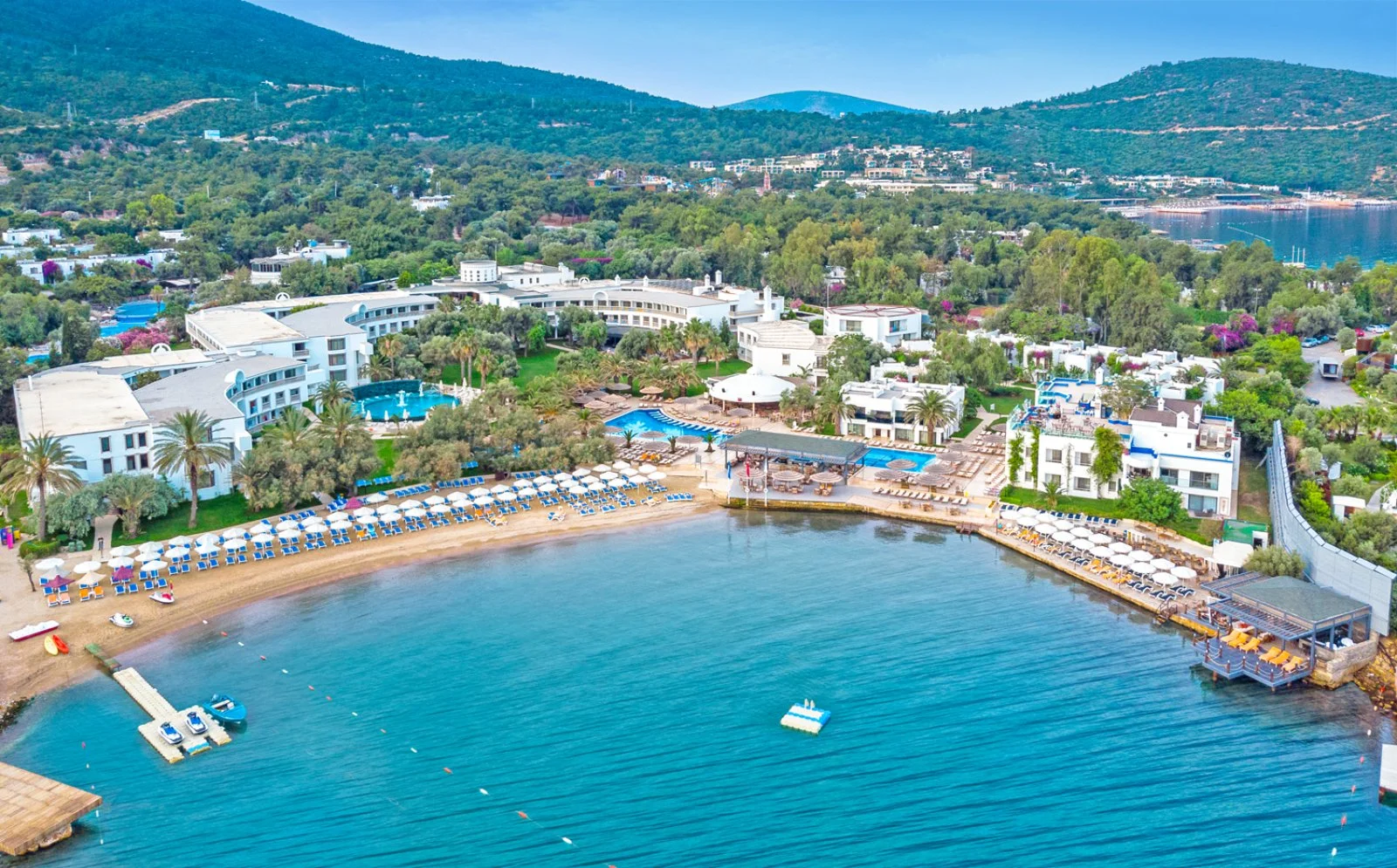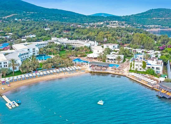 A circa 8 km da Bodrum e 25 km dall'aeroporto. Sorge su una bellissima baia, con corpo centrale ad anfiteatro e vari bungalow a 2 piani circondati dalla tipica macchia mediterranea e direttamente affacciati sulla spiaggia di sabbia Bandiera Blu delimitata su un lato da una piattaforma solarium. Offre 4 piscine di cui una per bambini con scivoli, una solo per adulti over 16 e una coperta. Uso gratuito di ombrelloni, lettini e teli mare sia presso le piscine sia in spiaggia.