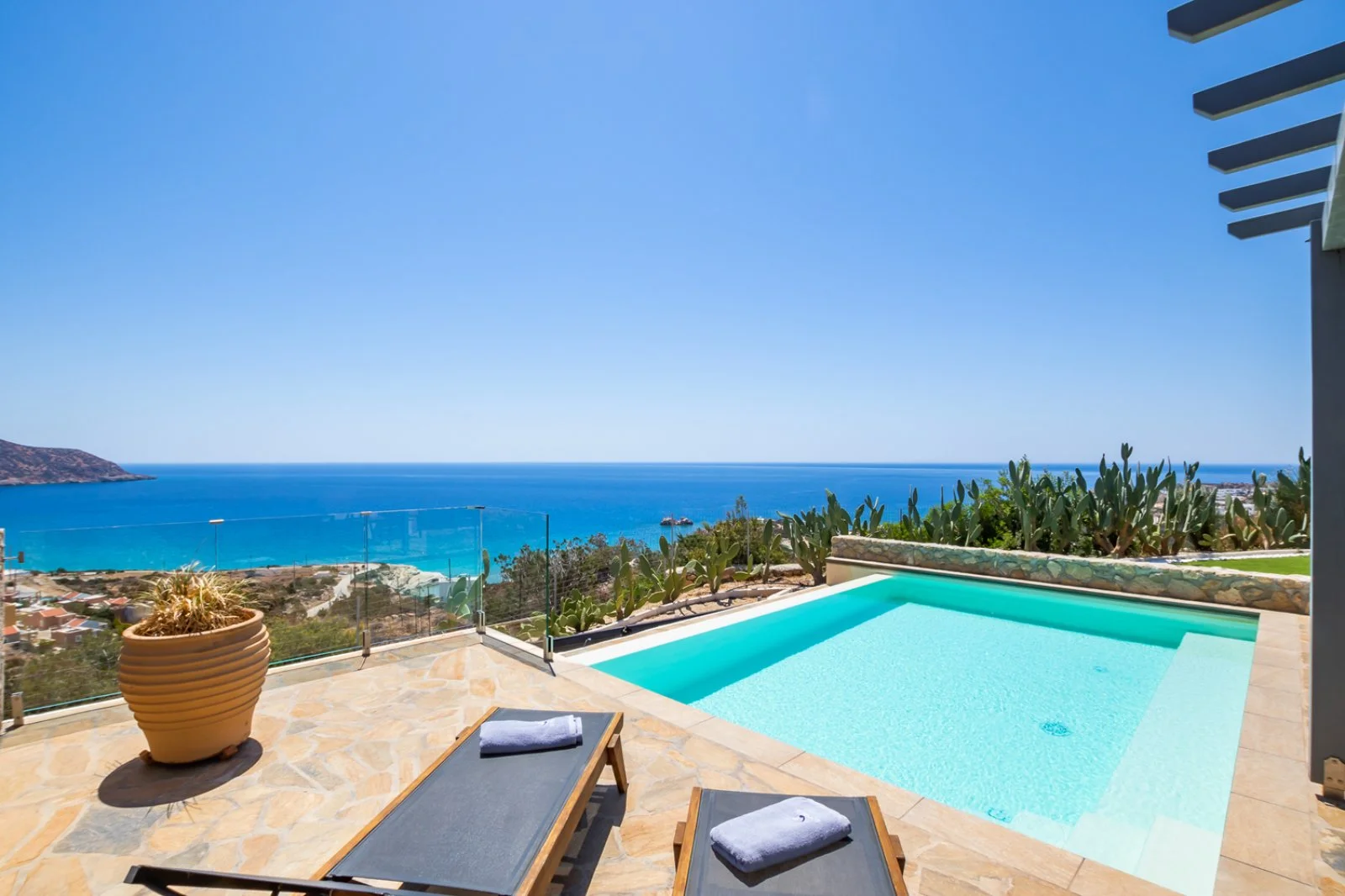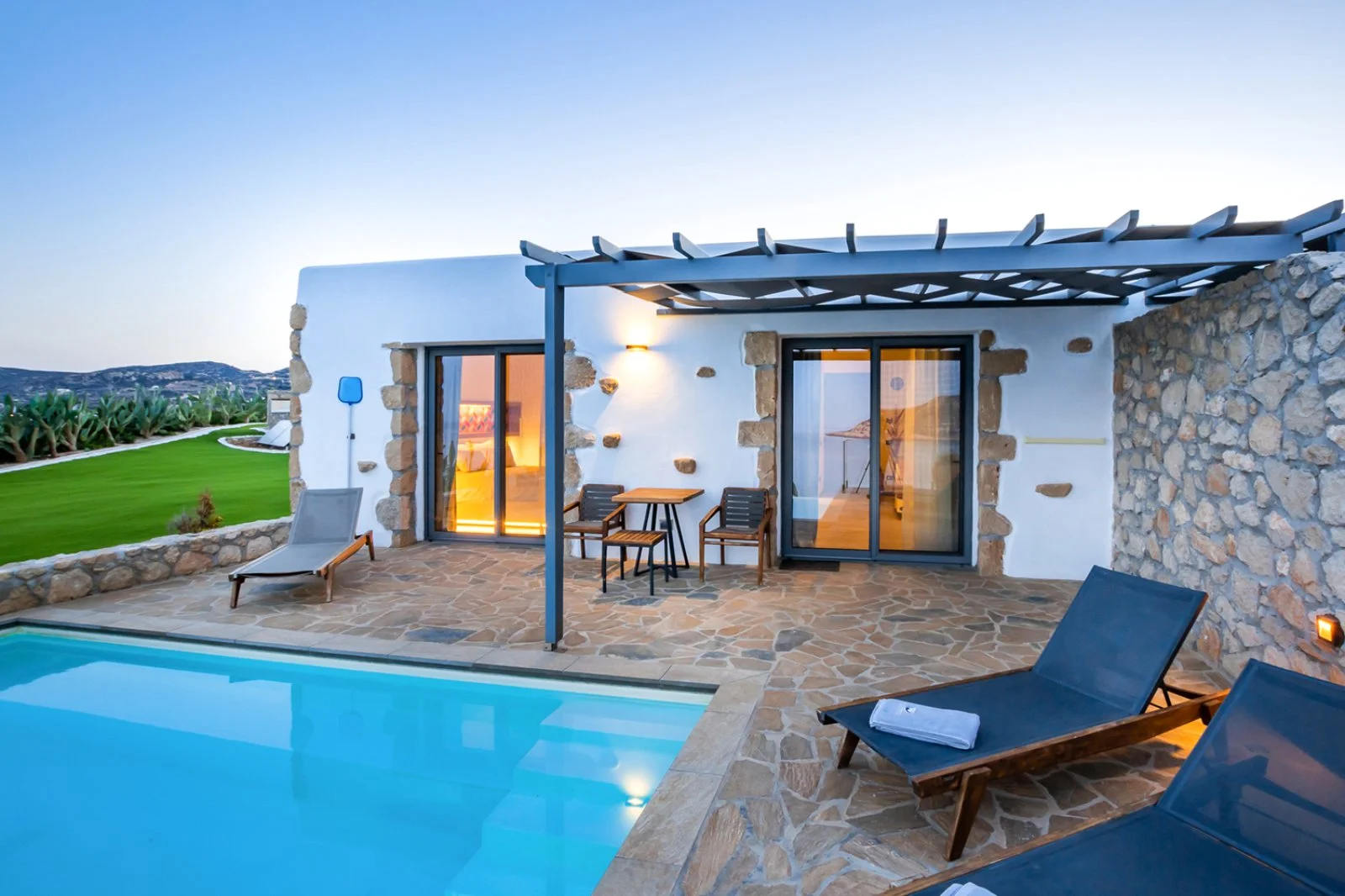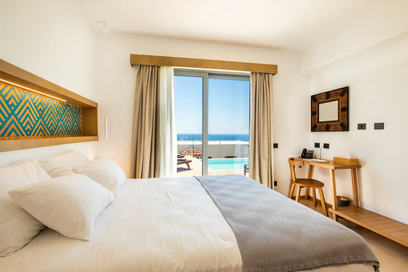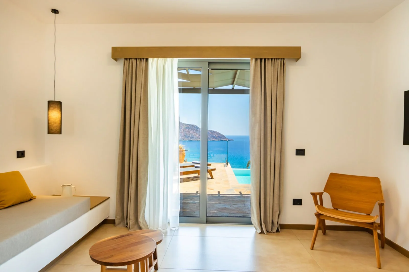 Le 20 suite, dalle dimensioni generose e con vista sulla baia di Amoopi, si compongono di due ambienti affacciati su un’ampia veranda con piscina privata infinity, attrezzata con lettini prendisole. Arredate con mobili dal design contemporaneo, sono tutte dotate di servizi privati con doccia, asciugacapelli, aria condizionata con controllo individuale con split in ogni ambiente, smart TV, telefono, accesso internet Wi-Fi, minifrigo, macchina per il caffè espresso (cialde a pagamento), bollitore, cassetta di sicurezza. Disponibili elysian suite vista mare e olympian suite vista mare, entrambe con camera da letto matrimoniale e soggiorno con divano letto.