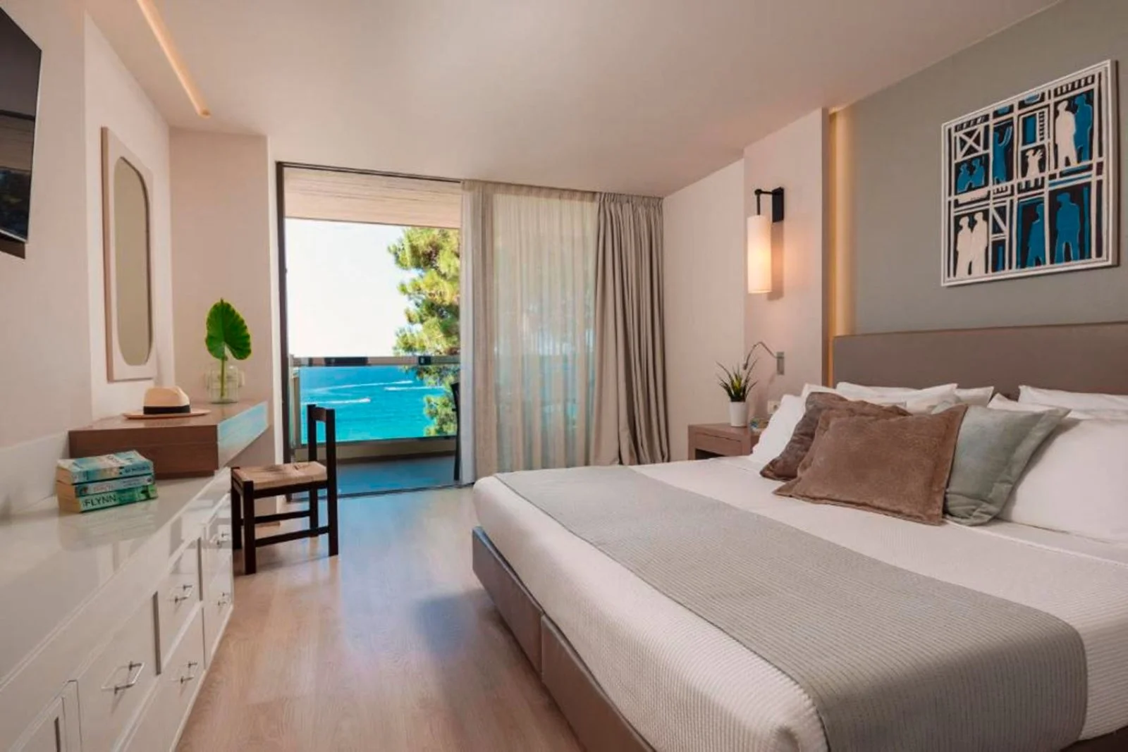 Le camere sono 161, arredate in un elegante stile contemporaneo. Si suddividono in varie tipologie a seconda dell’ubicazione e dell’ampiezza, tra cui doppie standard o vista mare, situate nel corpo centrale, e bungalow vista mare, più spaziosi e posizionati nell’edificio annesso. Tutte sono dotate di asciugacapelli, aria condizionata con controllo individuale, telefono, TV satellitare, cassetta di sicurezza, connessione Wi-Fi, minifrigo (consumazioni a pagamento), set per tè e caffè, balcone o terrazzo.