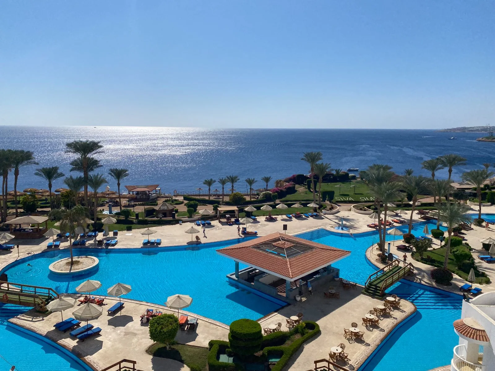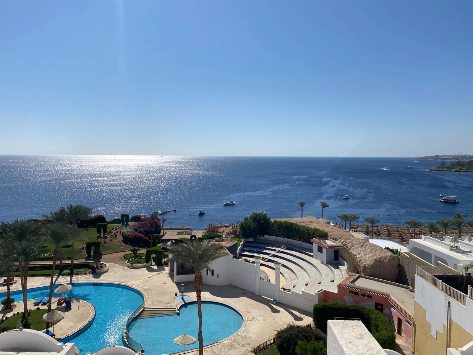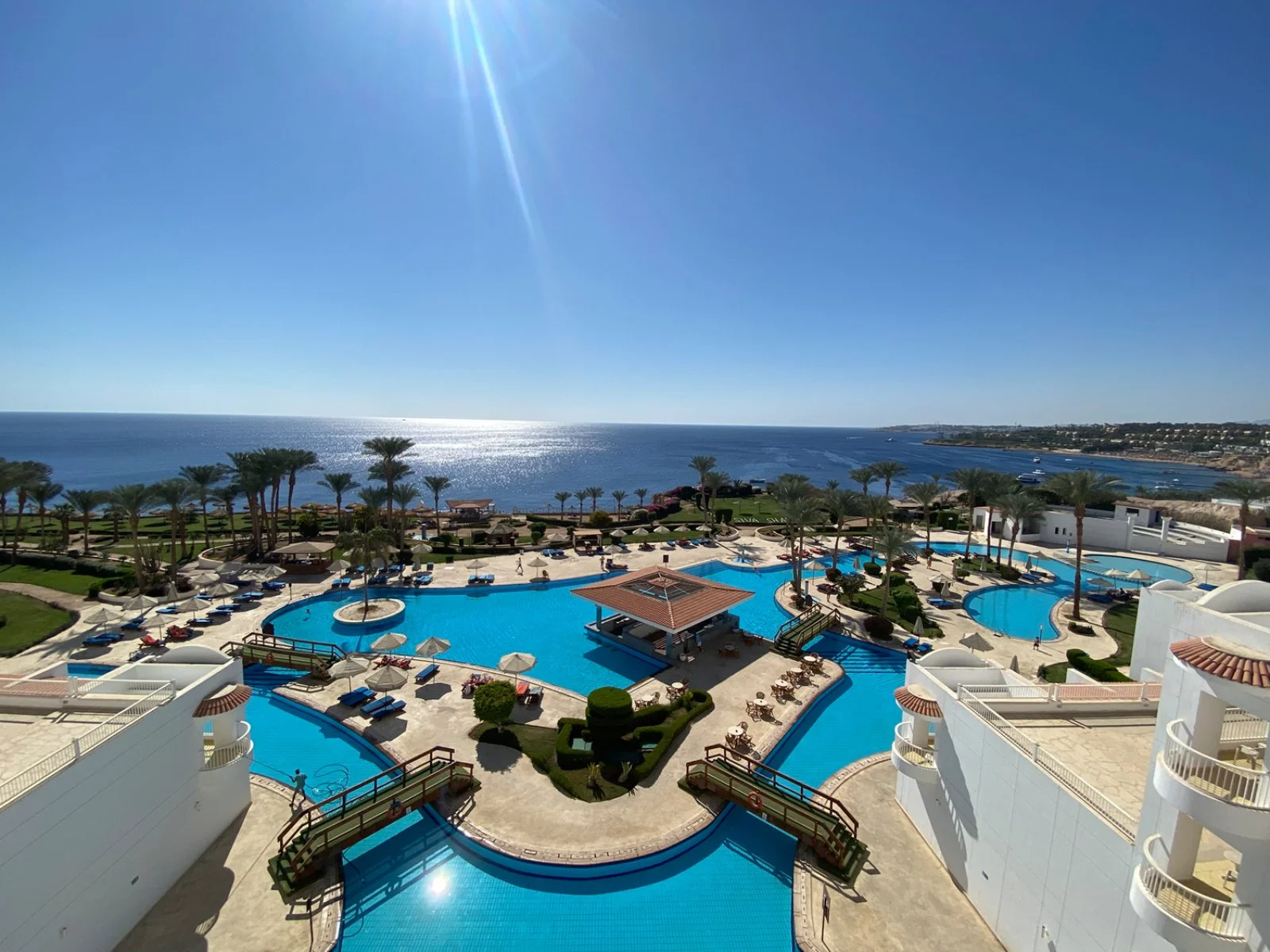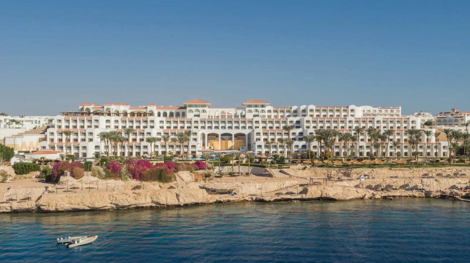 più belle e incontaminate di Sharm, ti aspetta per snorkeling e immersioni da sogno, raggiungibile con un comodo pontile galleggiante. L’hotel, con la sua scenografica reception in vetro che si apre sull’azzurro infinito, si sviluppa in un unico blocco fronte mare, così che la maggior parte delle camere goda di vista laterale o diretta sul mare. Pur non essendo completamente ristrutturato, alcuni interventi recenti lo rendono una scelta semplice e conveniente, ideale per chi cerca un