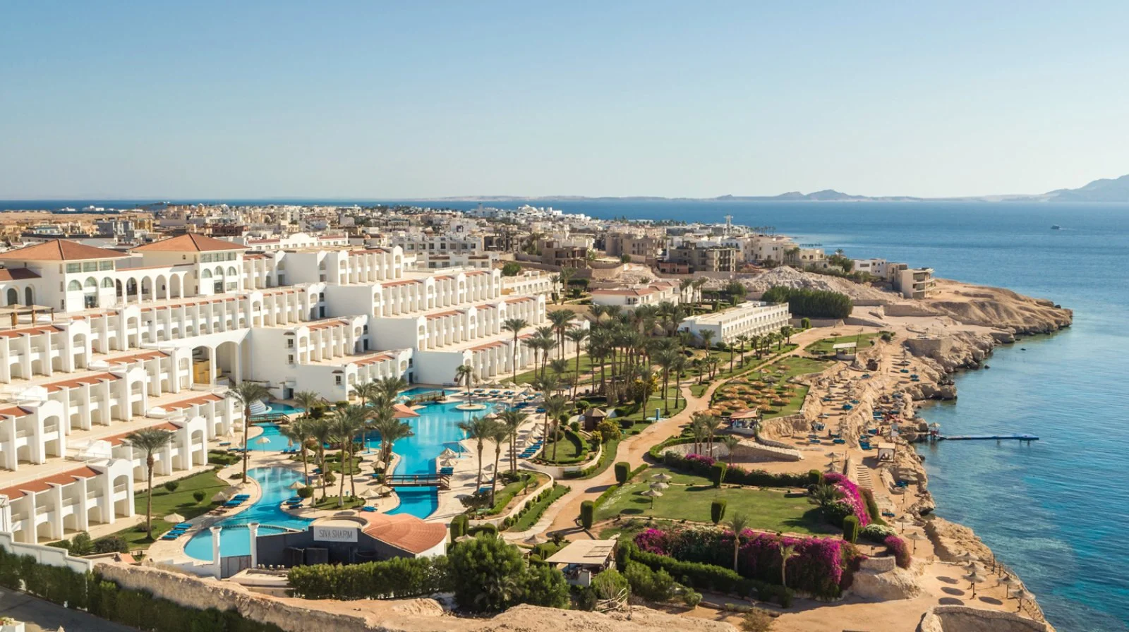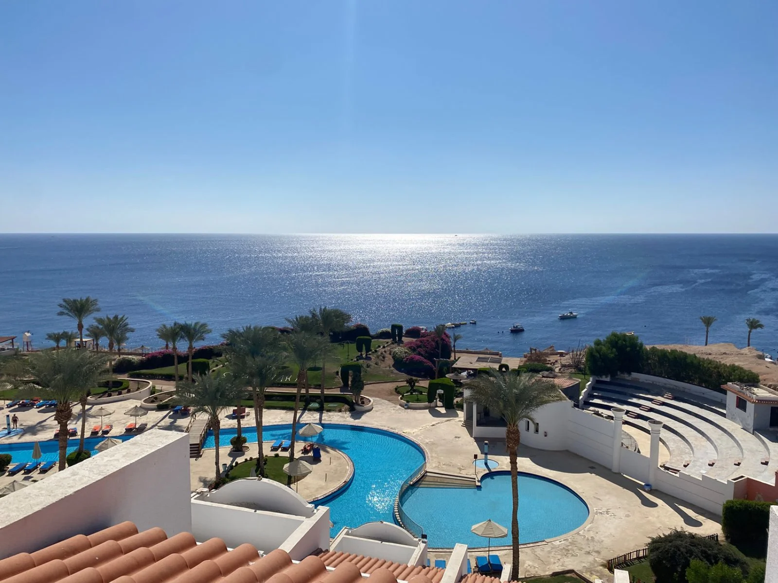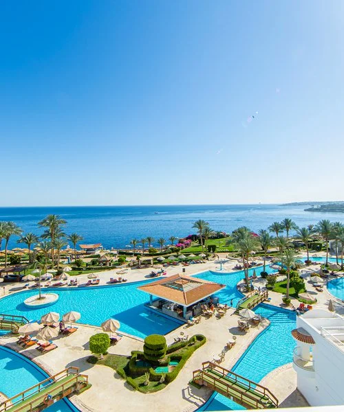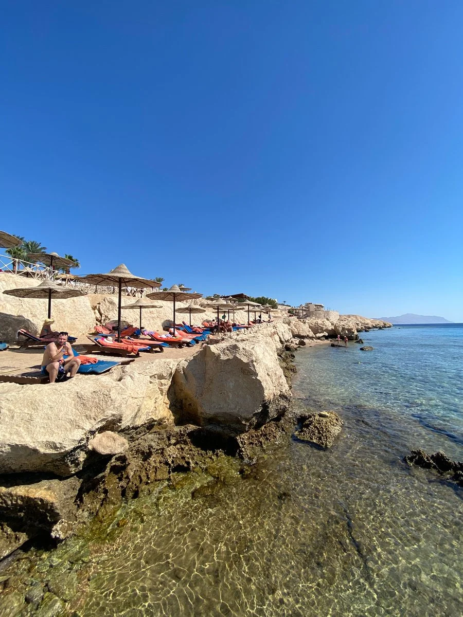 più belle e incontaminate di Sharm, ti aspetta per snorkeling e immersioni da sogno, raggiungibile con un comodo pontile galleggiante. L’hotel, con la sua scenografica reception in vetro che si apre sull’azzurro infinito, si sviluppa in un unico blocco fronte mare, così che la maggior parte delle camere goda di vista laterale o diretta sul mare. Pur non essendo completamente ristrutturato, alcuni interventi recenti lo rendono una scelta semplice e conveniente, ideale per chi cerca un