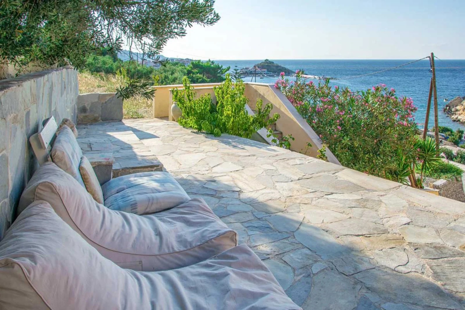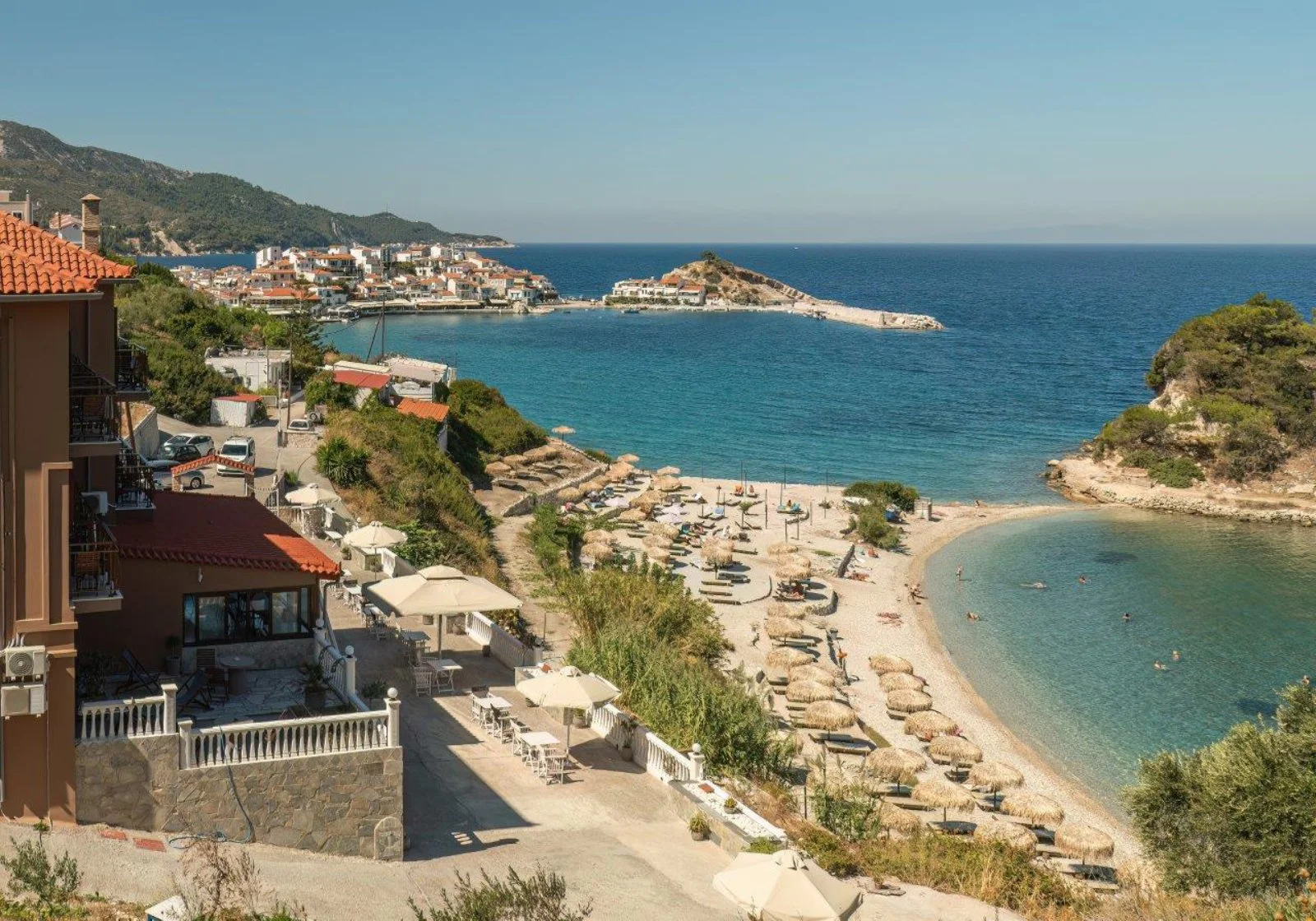 Kokkari, a 50 m dalla spiaggia, 500 dal centro e 18 k dall’aeroporto. Fermata bus a 500 m.