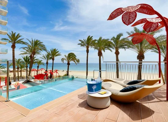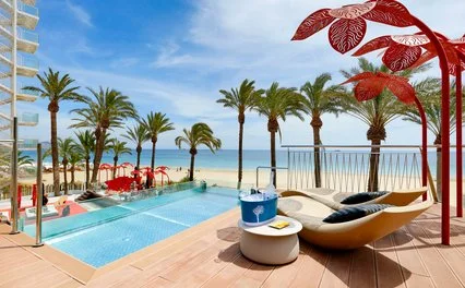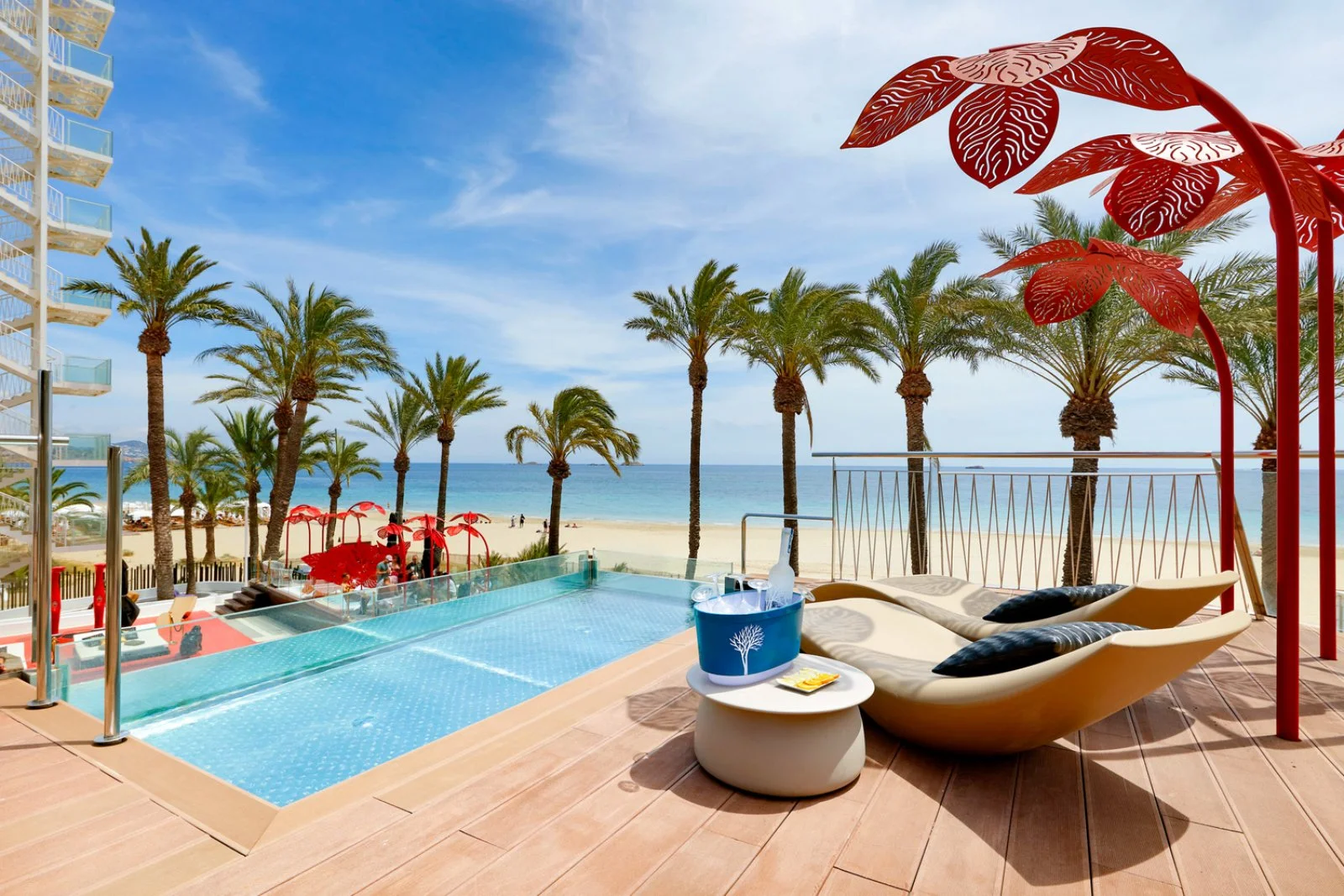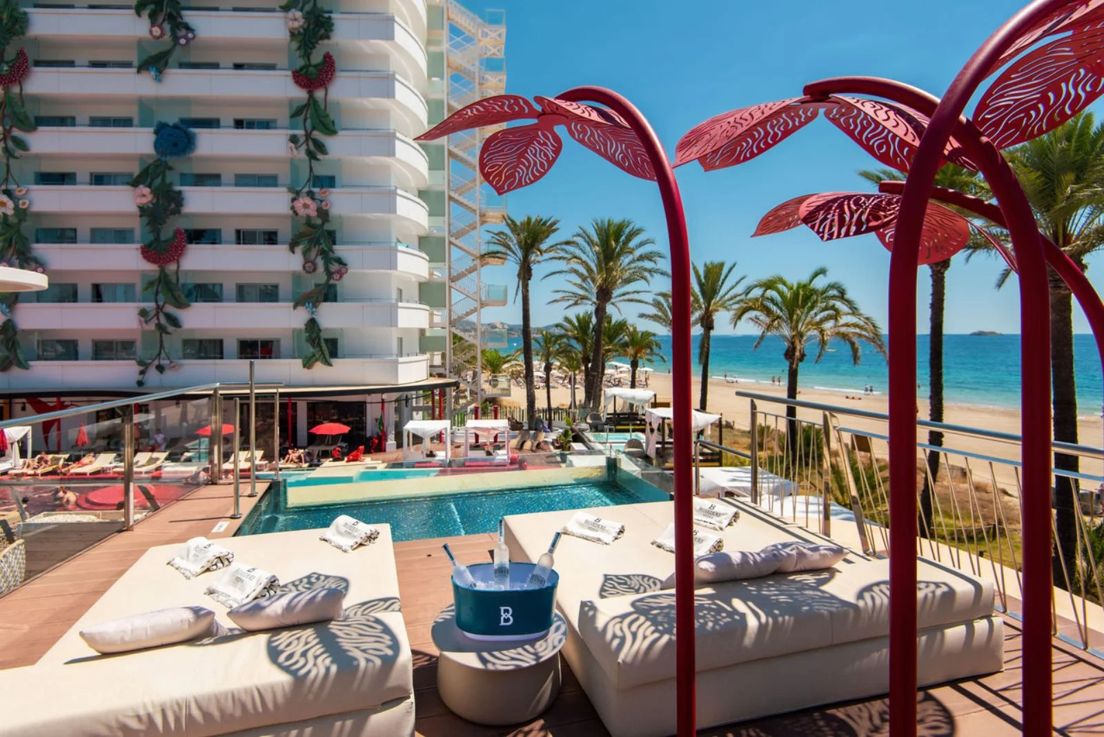 direttamente sulla spiaggia di sabbia bianca di Playa d’en Bossa con beach club riservato con ombrelloni e lettini gratuiti e, a pagamento, servizi bar (teli mare disponibili in hotel).