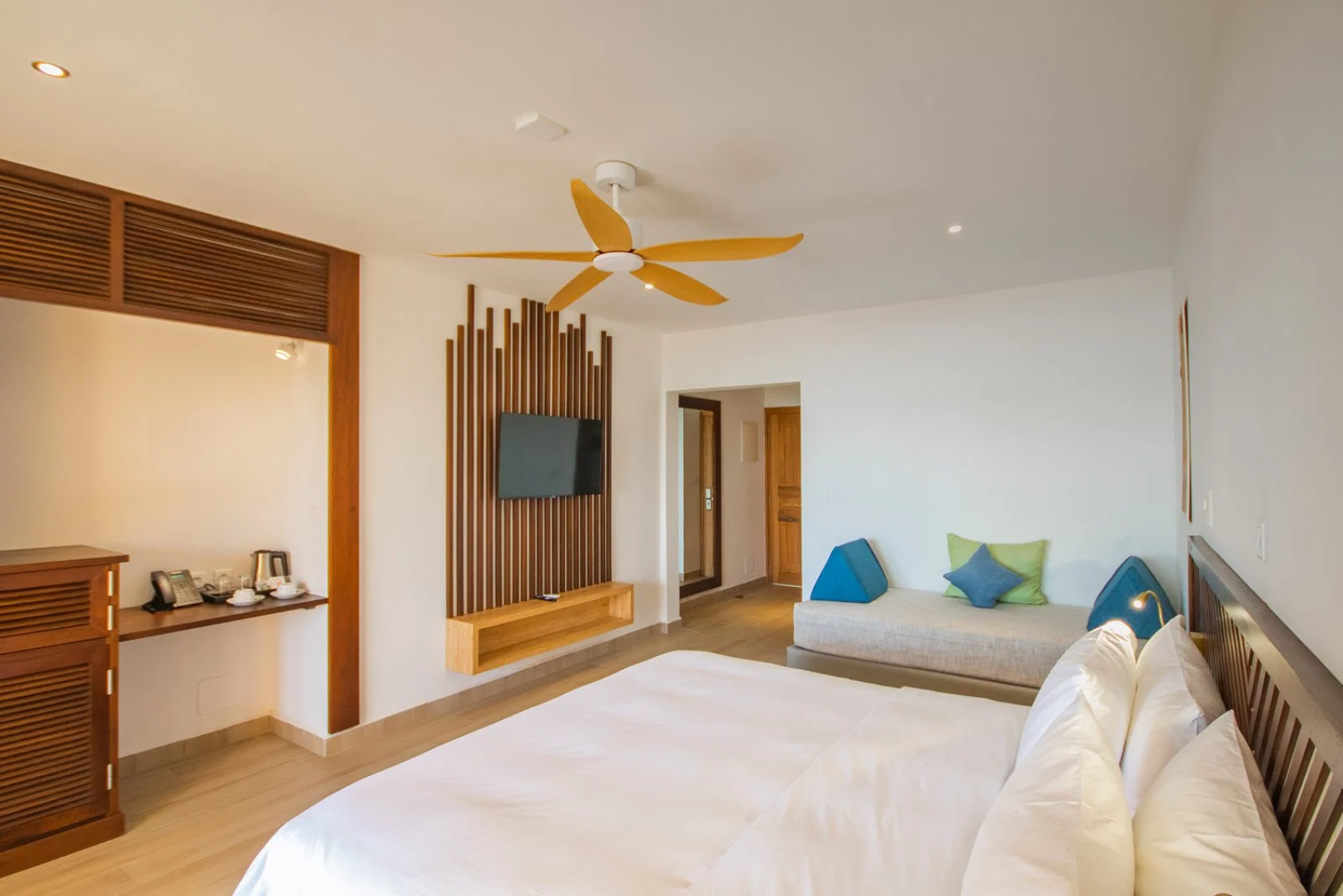 95 camere tra vista giardino, vista oceano e prestige suite. Tutte unità dispongono di servizi privati, asciugacapelli (su richiesta in reception), connessione wi-fi gratuita, aria condizionata, ventilatore a soffitto, telefono, tv satellitare, cassetta di sicurezza e terrazza o veranda. A pagamento, minibar. Le camere vista giardino (28 m2, 36 m2 per le quadruple) sono situate intorno all’area bar dove è presente anche la piccola piscina infinity. Disponibili con supplemento nel blocco centrale, davanti alla piscina principale, camere vista oceano (32 m2) e 2 prestige suite (64 m2, max 3 adulti) con zona soggiorno, terrazza vista oceano di 28 m2 ed idromassaggio esterno.
