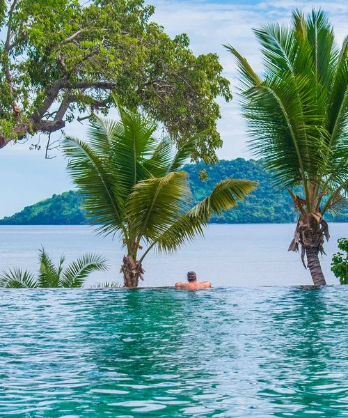 la piscina infinity che sembra letteralmente confondersi con l’Oceano e la selvaggia vegetazione tutt’intorno. Disposte a ferro di cavallo intorno la piscina anche le camere garden, recentemente rinnovate e finemente arredate in maniera elegante e moderna, con una graziosa veranda da dove godere il paesaggio. Le camere ocean e le suite si trovano invece in due blocchi più in alto, separati, e antistanti la seconda piscina anche questa infinity e panoramica ma decisamente più ampia.