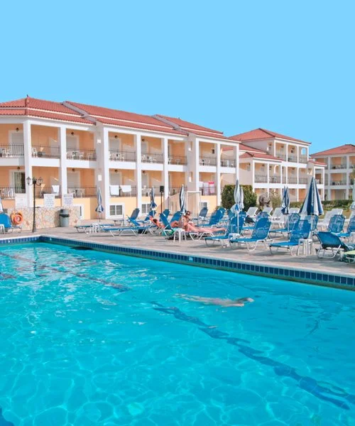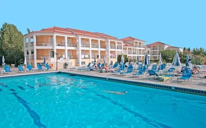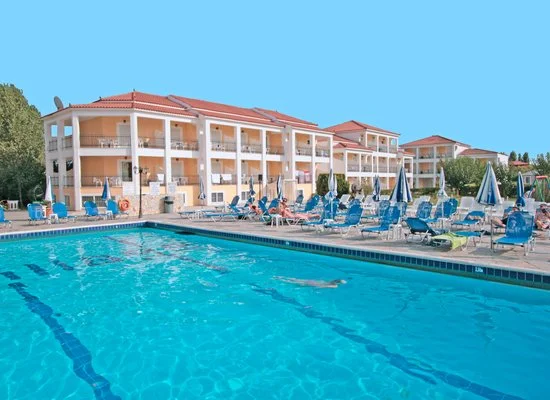 Questo grande complesso è situato in posizione leggermente defilata rispetto alla spiaggia di Laganas ed è perfetto per i giovani che vogliono soggiornare nella località più movimentata dell’isola. Dispone di diverse soluzioni in studio o maisonette in grado di ospitare fino a 4 adulti, arredati in modo semplice e attrezzati con funzionali angoli cottura, benché il trattamento base sia in mezza pensione.
