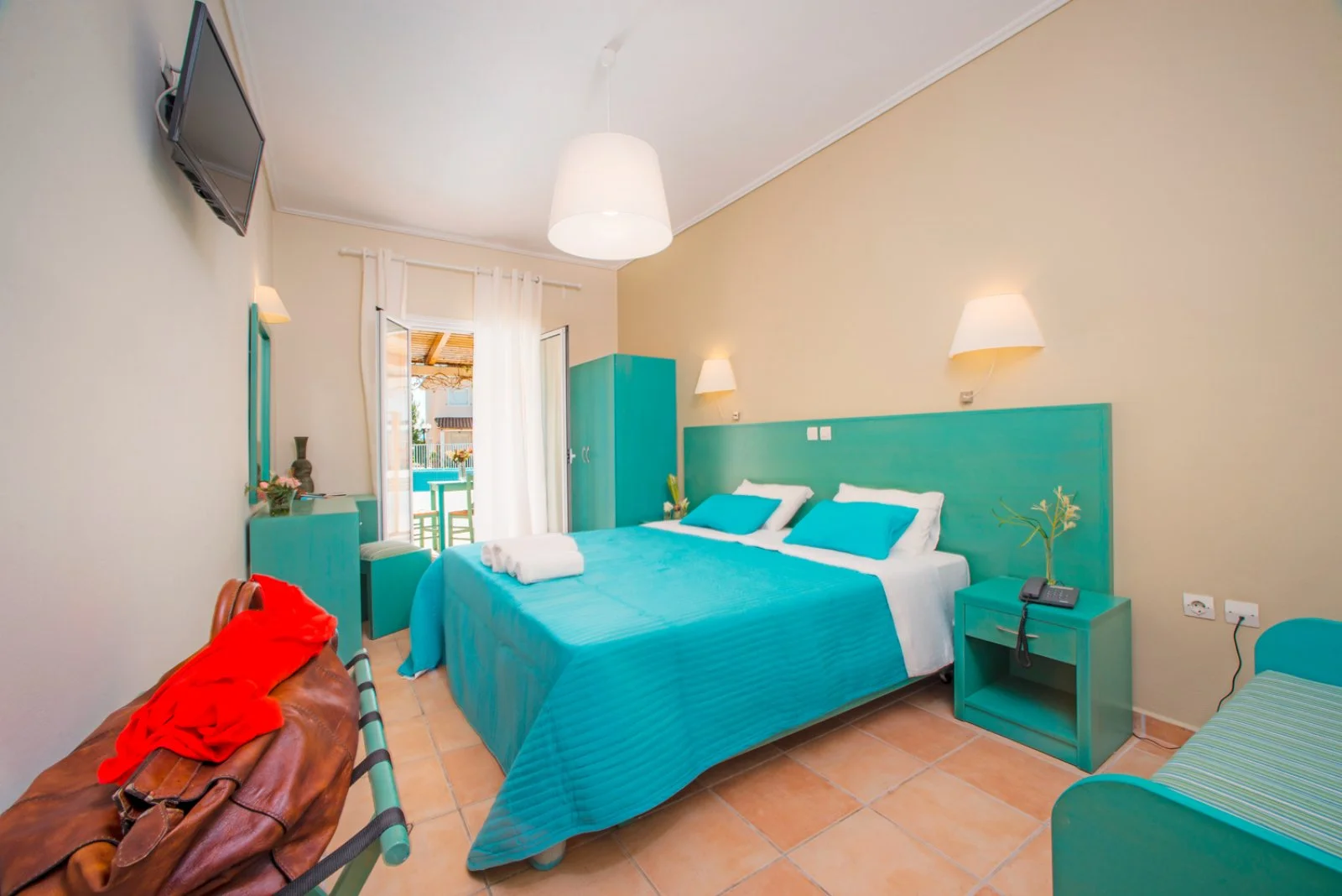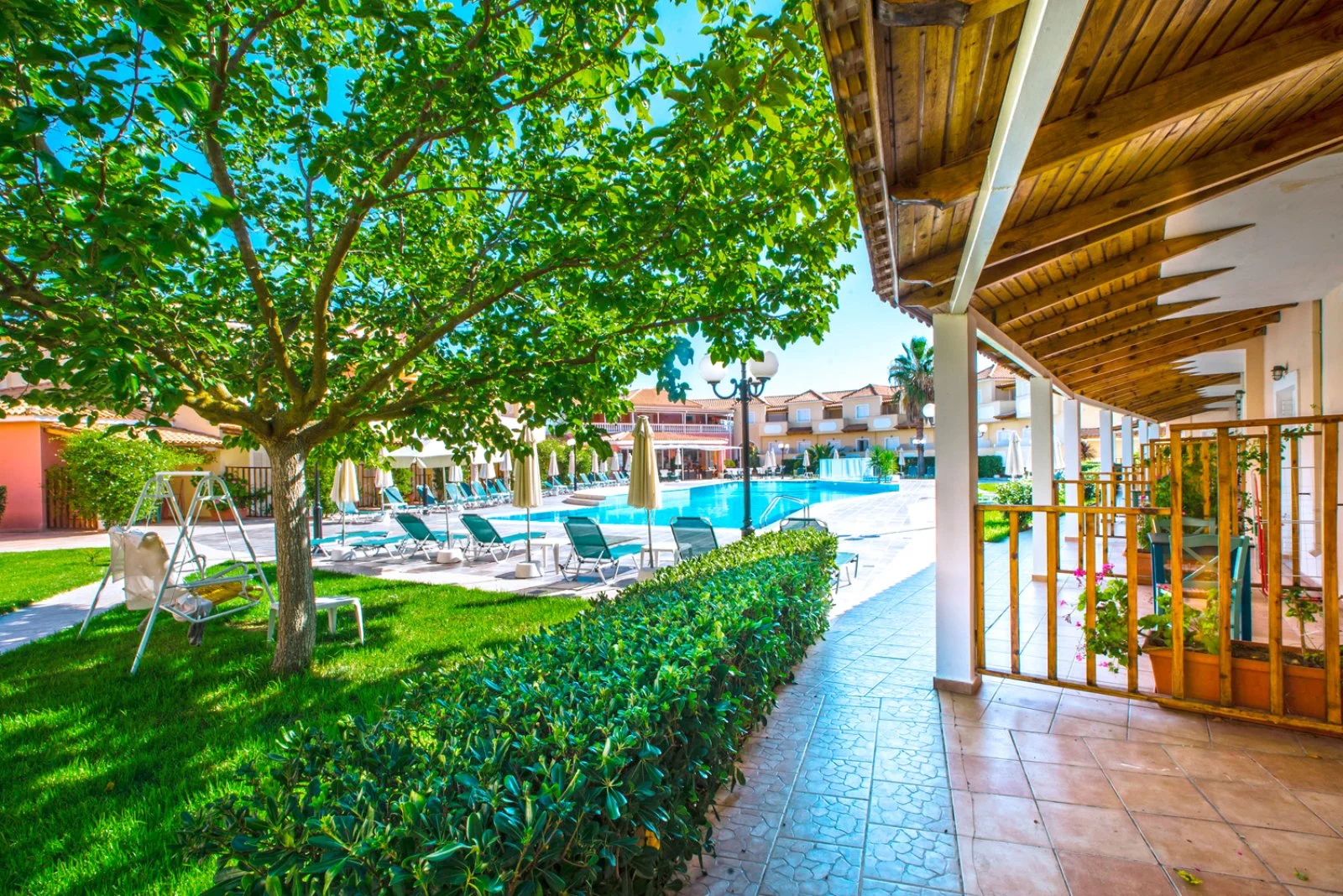 71 camere (16 m²) disposte in 4 blocchi da 2 piani, con servizi privati, terrazza o balcone vista piscina, aria condizionata, asciugacapelli, TV satellitare con alcuni canali italiani, cassetta di sicurezza, minifrigo e connessione Wi-Fi gratuita nelle aree comuni. Sono disponibili, con supplemento, camere superior (19 m²) con arredamenti più moderni, camere comfort (19 m²) recentemente rinnovate, camere family (26 m²), camere family superior (27 m²) e quadruple deluxe in grado di ospitare fino a 4 adulti.